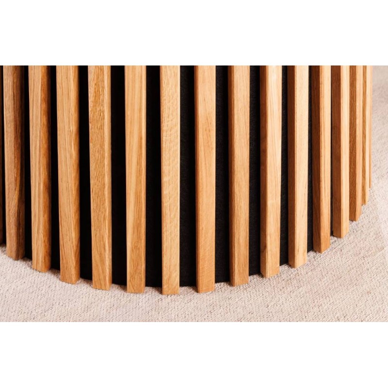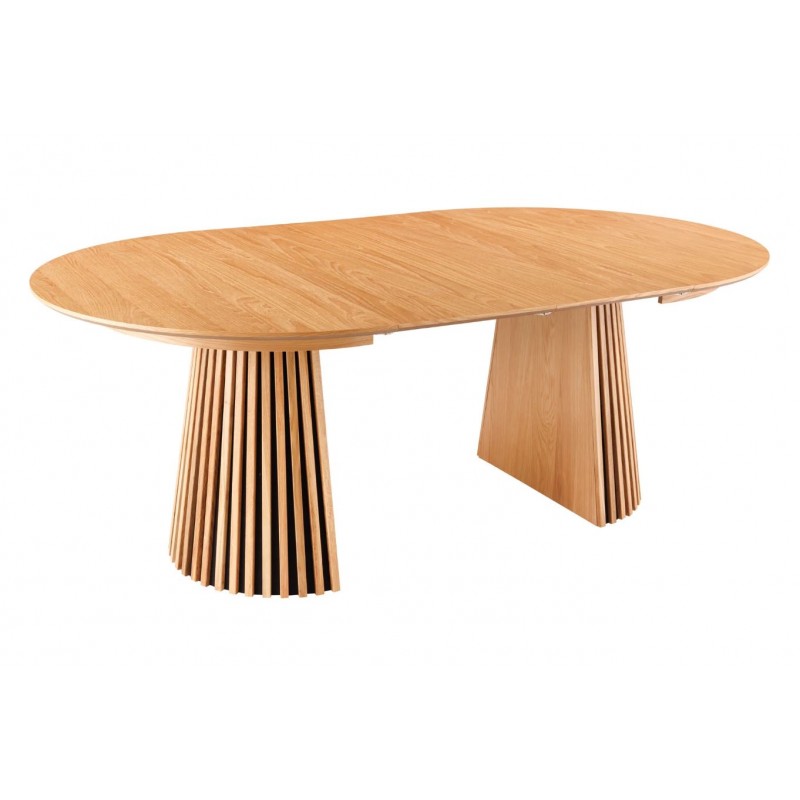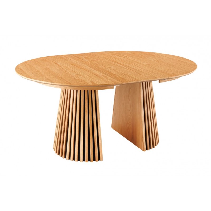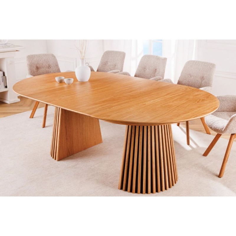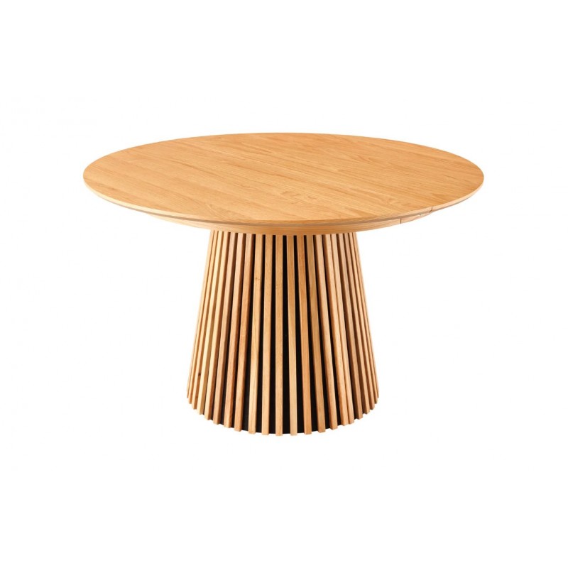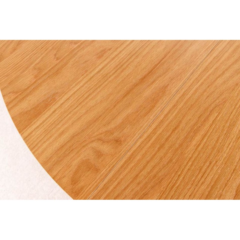 Ten robiący ogromne wrażenie okrągły rozkładany stół VALHALLA WOOD, to idealne rozwiązanie do każdego salonu czy jadalni w stylu nowoczesnym, który dodaje przestrzeni niesamowitego stylu oraz klasy. Duży praktyczny blat o grubości 18 mm został wykonany z płyty MDF oklejoną imitacją dębu w kolorze naturalnym. Cechą szczególną tego stołu jest łatwa i szybka możliwość zmienienia jego kształtu z okrągłej na owalną, powiększając go za pomocą przedłużek do dogodnie odpowiedniej szerokości. Blat ten został w całości osadzony na solidnej okrągłej lakierowanej podstawie z drewna dębowego w formie listew przypominających podłużne pionowe lamele, które w momencie rozłożenia go rozdzielają się na dwie półokrągłe podstawy. Bez wątpienia wyróżnia się swoją wyrazistością poprzez zachowanie na nim oryginalnych słoi, sęków oraz naturalności drzewa co sprawia, że wygląda zjawiskowo, nadając każdemu wnętrzu oryginalnego charakteru elegancji i nowoczesności. Ogromną zaletą jest nie tyle funkcjonalność jak również duża wytrzymałość oraz łatwość czyszczenia, która wyróżniają się swoją naturalnością, kolorem oraz strukturą sprawiając przy tym, że każdy egzemplarz stołu jest unikatowy. Efekt końcowy połączenia blatu z płyty MDF oraz drewnianej dębowej podstawy jest jednolity, dzięki czemu całość mebla stanie się wspaniałą dekoracją, która doda wnętrzu nowoczesnego wykończenia oraz niesamowitego wyglądu. Jego zjawiskowa forma dopełni wnętrza w stylu nowoczesnym, boho, a nawet rustykalnym gdzie będzie stanowił centrum pomieszczenia zachwycając najmniejszymi detalami oraz pięknym wykończeniem.