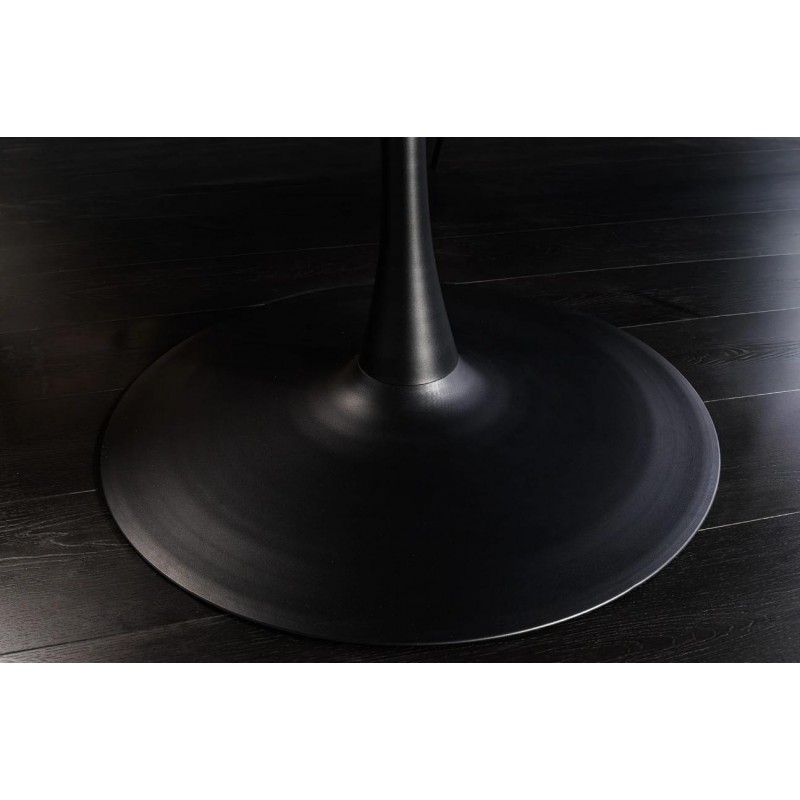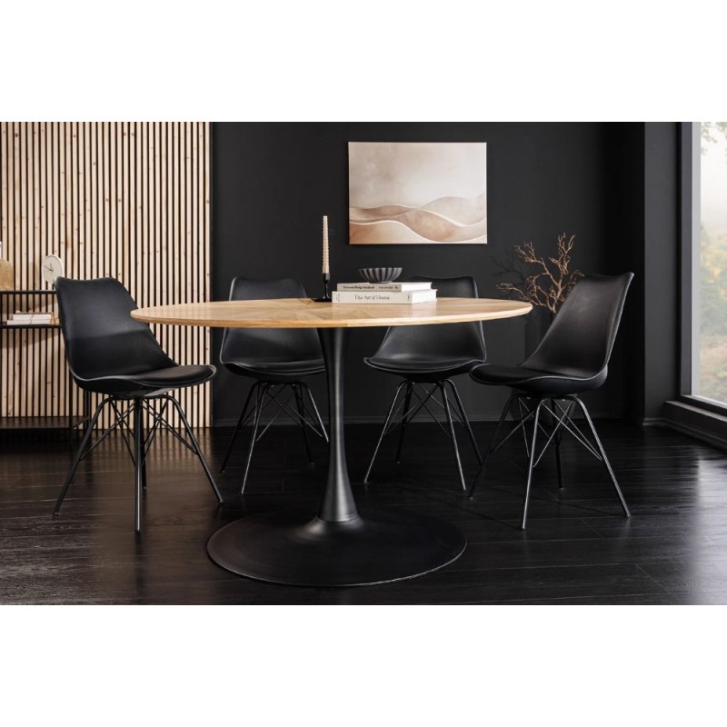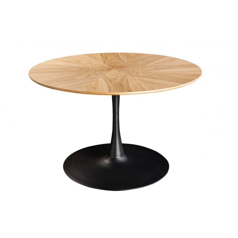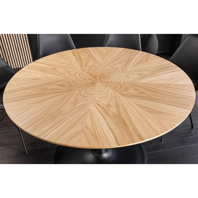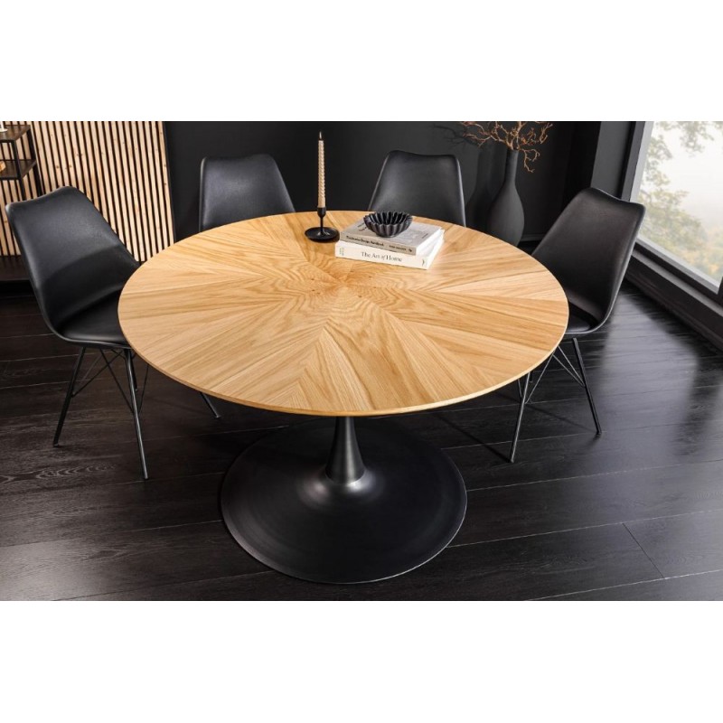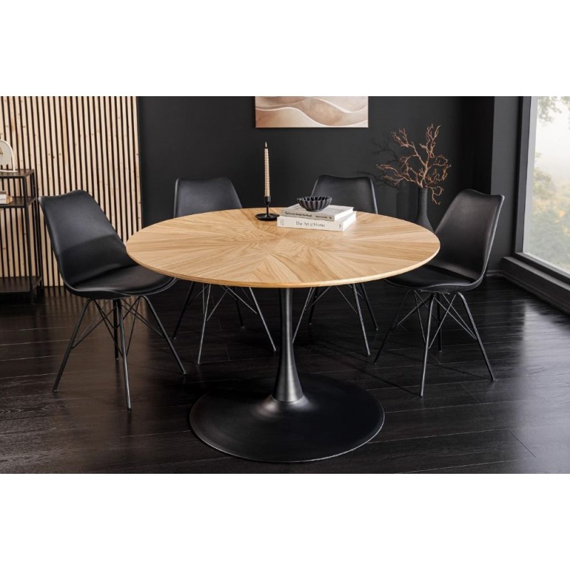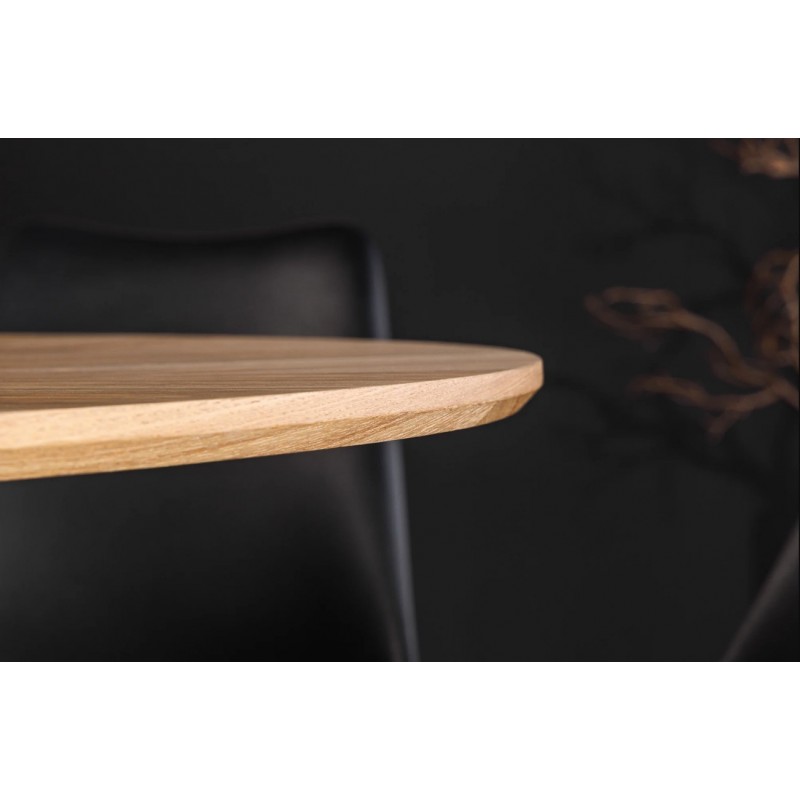 Stół ATELIER doskonale sprawdzi się w przestronnych wnętrzach jako elegancki stół do jadalni lub salonu urządzonego w stylu industrialnym. Dzięki swojej formie i praktyczności doda każdemu pomieszczeniu wyjątkowego charakteru. Głównym atutem stołu jest duży, okrągły blat o grubości 20 mm, z delikatnie zaokrąglonymi i ściętymi krawędziami, wykonany został z płyty MDF z dekorem imitującym naturalny dąb. Widoczne słoje i sęki schodzące się dekoracyjnie do środka podkreślają jego naturalny wygląd, nadając mu naturalny, ciepły charakter. Blat osadzono na solidnej, czarnej metalowej podstawie, która gwarantuje stabilność i dodaje całości nowoczesnego wyrazu. Efekt połączenia drewnianego dekoru z czarną, industrialną konstrukcją tworzy wyjątkowy styl, dzięki czemu stół ATELIER doskonale odnajdzie się w aranżacjach nowoczesnych i loftowych, stając się ozdobą każdego wnętrza.
