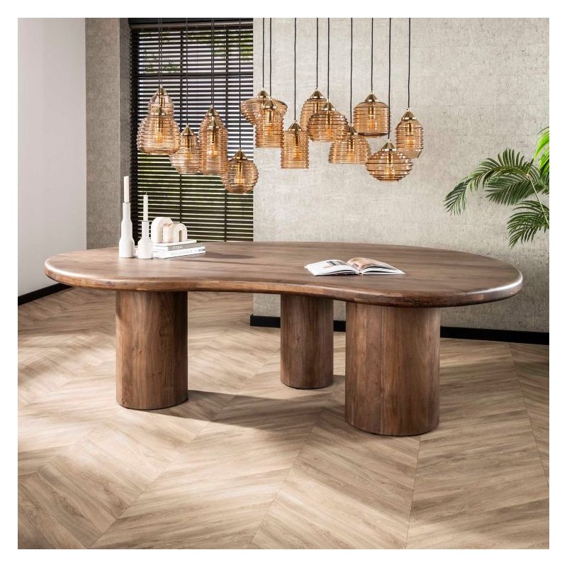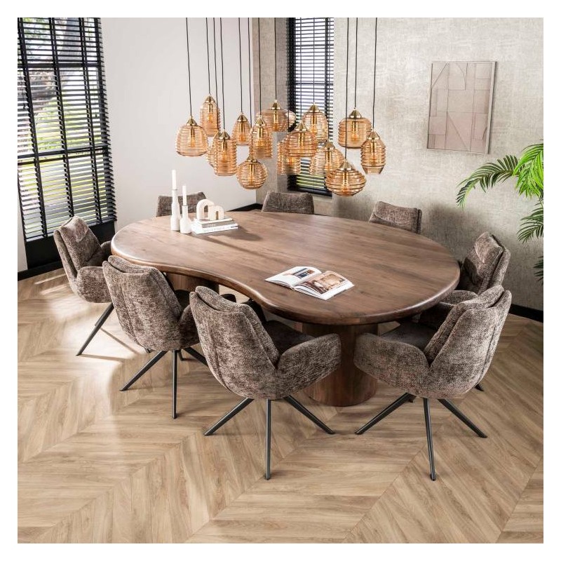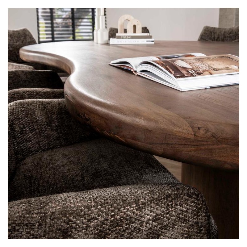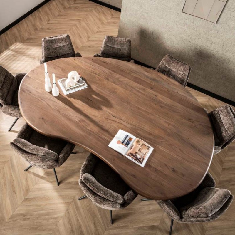 Stół AYTON to idealne rozwiązanie do każdego salonu oraz jadalni urządzonego stylu nowoczesnym, który doda naturalności i spokoju, a także dzięki swojej formie przykuje uwagę każdego. Duży owalny blat w kształcie nerki zaprojektowano niewątpliwie z dużą precyzją uwydatniając jego niezwykłą naturalność. Został wykonany ręcznie z litego drewna akacji w odcieniu brązowym, na którym została zachowana oryginalna naturalna struktura drewna, przez co prezentuje się zjawiskowo. Głównym jego atutem bez wątpienia jest blat osadzony na stabilnej podstawie w formie trzech okrągłych kolumn wykonanych z płyty MDF pokrytych dekorem drewnianym imitującym brązową akację na których zachowano oryginalną strukturą drewna w postaci sęków i słojów uwydatniając tym samym ich naturalność. AYTON nie tylko przyciąga wzrok swoim designem, lecz także wyróżnia się funkcjonalnością, wykonaniem oraz łatwością w codziennej pielęgnacji. Wyrazista forma, kolorystyka oraz struktura sprawiają, że każdy egzemplarz ma unikatowy charakter. To mebel, który idealnie łączy funkcję użytkową z dekoracyjną, stając się centralnym punktem wnętrza i jego niekwestionowaną ozdobą, bez problemu oferując przestrzeń do ustawienia przynajmniej ośmiu krzeseł.