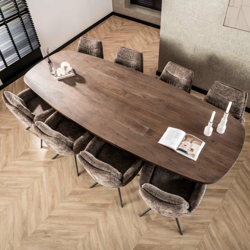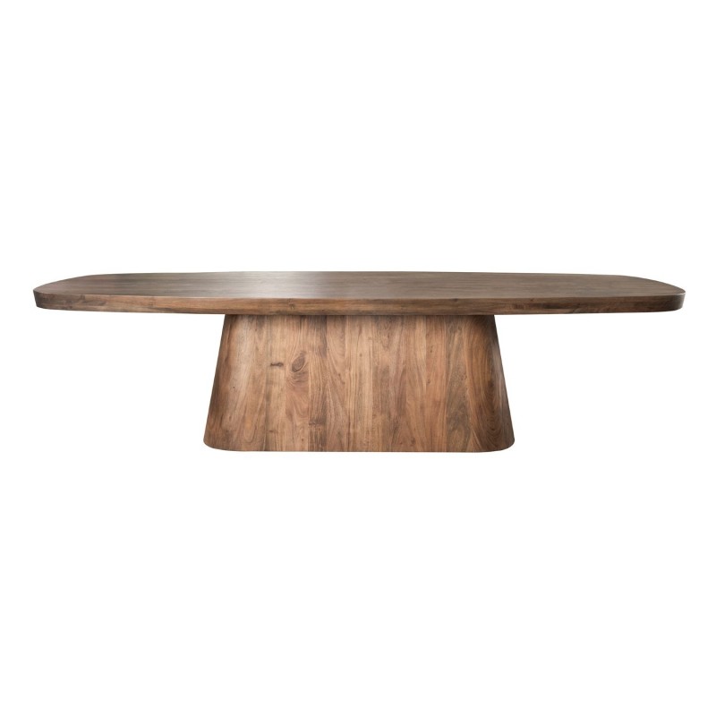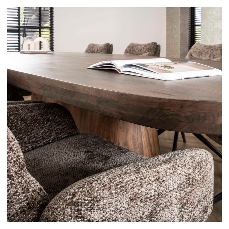 Stół AYTON to idealne rozwiązanie do każdego salonu oraz jadalni urządzonego stylu nowoczesnym, który doda naturalności i spokoju, a także dzięki swojej formie przykuje uwagę każdego. Duży owalny blat zaprojektowano niewątpliwie z dużą precyzją uwydatniając jego niezwykłą naturalność. Został wykonany ręcznie z litego drewna akacji w odcieniu brązowym, na którym została zachowana oryginalna naturalna struktura drewna, przez co prezentuje się zjawiskowo. Głównym jego atutem bez wątpienia jest blat osadzony na stabilnej geometrycznej podstawie wykonanej z płyty MDF pokrytej dekorem drewnianym imitującym brązową akację na której zachowano oryginalną strukturą drewna w postaci sęków i słojów uwydatniając tym samym jej naturalność. AYTON nie tylko przyciąga wzrok swoim designem, lecz także wyróżnia się funkcjonalnością, wykonaniem oraz łatwością w codziennej pielęgnacji. Wyrazista forma, kolorystyka oraz struktura sprawiają, że każdy egzemplarz ma unikatowy charakter. To mebel, który idealnie łączy funkcję użytkową z dekoracyjną, stając się centralnym punktem wnętrza i jego niekwestionowaną ozdobą, bez problemu oferując przestrzeń do ustawienia przynajmniej ośmiu krzeseł.