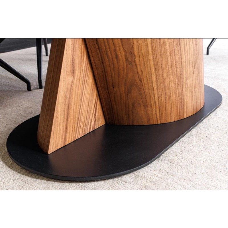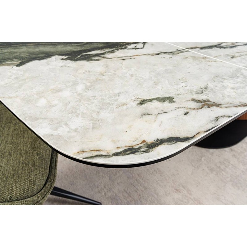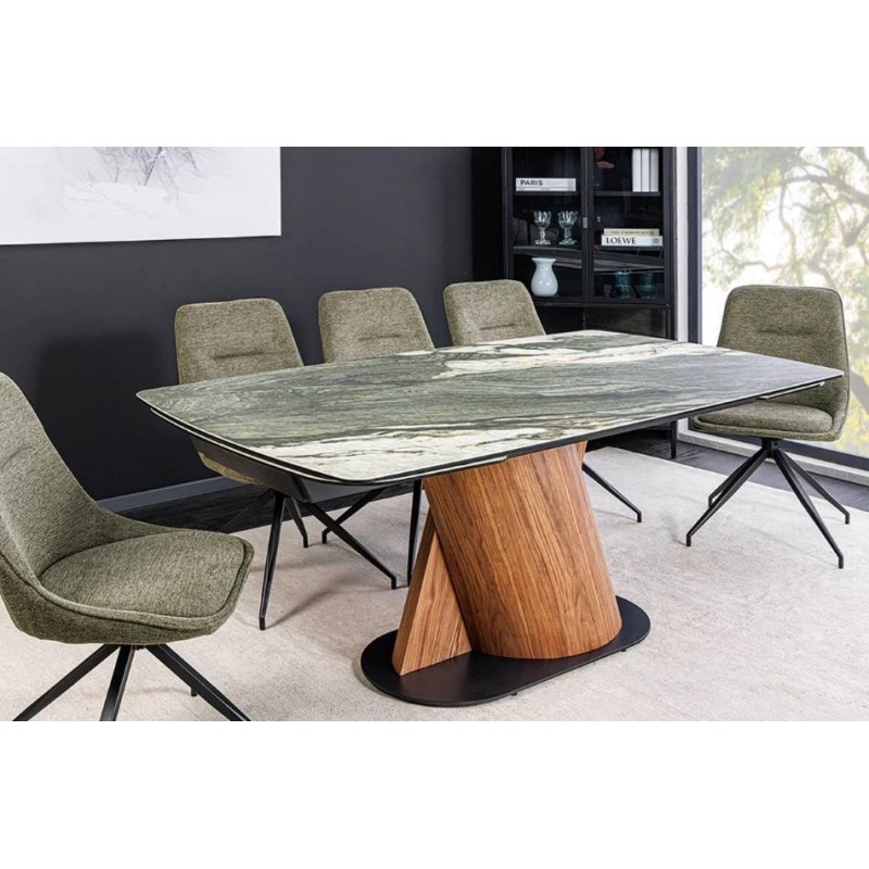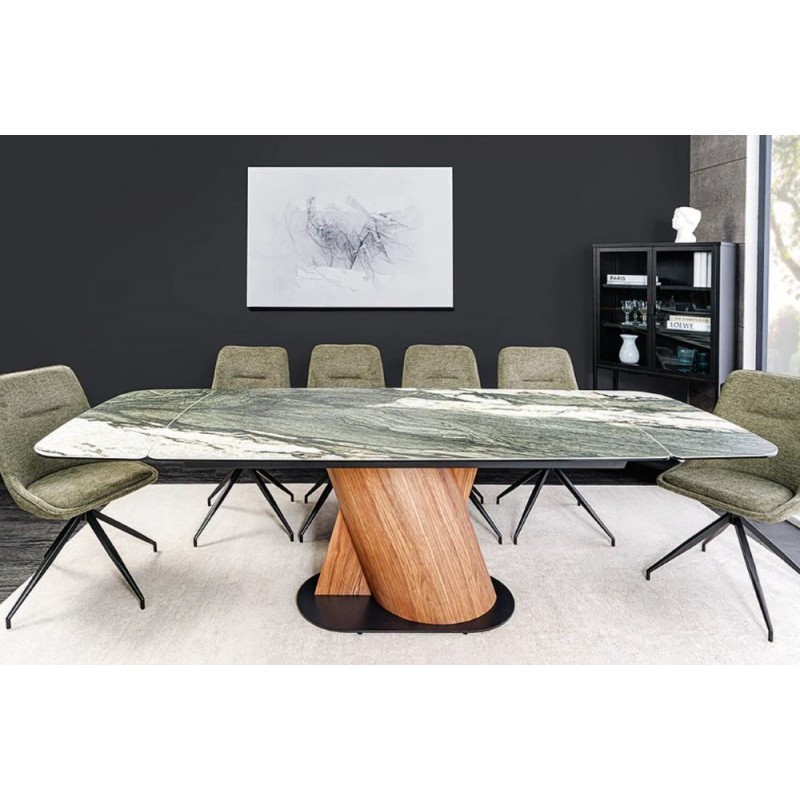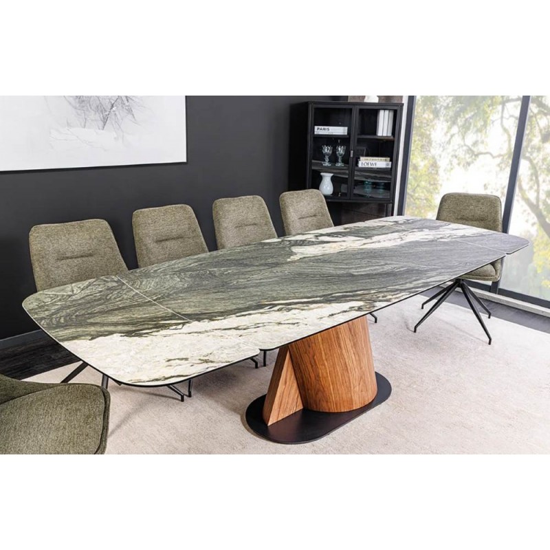 Stół ELEMENTS znakomicie sprawdzi się w przestronnych pomieszczeniach jako stół do jadalni i salonu urządzonych w stylu nowoczesnym, gdzie dzięki swojej wyjątkowej formie doda wnętrzu niesamowitego charakteru. Duży praktyczny blat o grubości 12 mm został wykonany z ceramiki wyróżniającej się między innymi swoją wyrazistością poprzez zastosowanie na niej imitacji brązowo-szarego marmuru, którego elegancką kolorystykę dopełniają charakterystyczne barwienia oraz nitki w białych, szarych i beżowych kolorach. Cechą szczególną tego stołu jest mechanizm blatu, który można rozłożyć w trzech etapach, dzięki temu z łatwością możemy go zmniejszać i zwiększać o długość 80 cm za pomocą dwóch bocznych przedłużek. Mebel ten został osadzony na solidnej podstawie wykonanej z płyty MDF pokrytej dekorem drewnianym, na którym uwydatniona została naturalna struktura drewna z widocznymi słojami i sękami, a jej praktyczny geometryczny kształt sprawia, że ułożenie krzeseł podczas jego użytkowania nie stanowi problemu. Bez wątpienia zaletą tego stołu jest funkcjonalność, wytrzymałość oraz łatwość czyszczenia, dzięki czemu wyróżnia się swoją wyrazistością i kolorem. Efekt końcowy połączenia brązowo-szarego blatu oraz podstawy w kolorze orzecha jest fenomenalny, co sprawia, że idealnie odnajdzie się w stylu nowoczesnym gdzie stanie się nie tylko funkcjonalnym meblem, ale także przepiękną dekoracją, która doda wnętrzu unikatowego wykończenia i niesamowitego wyglądu.