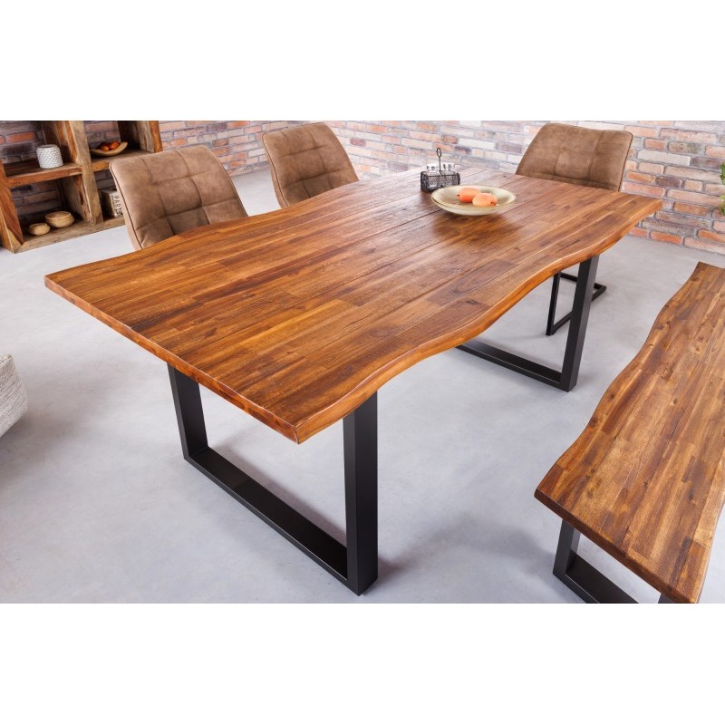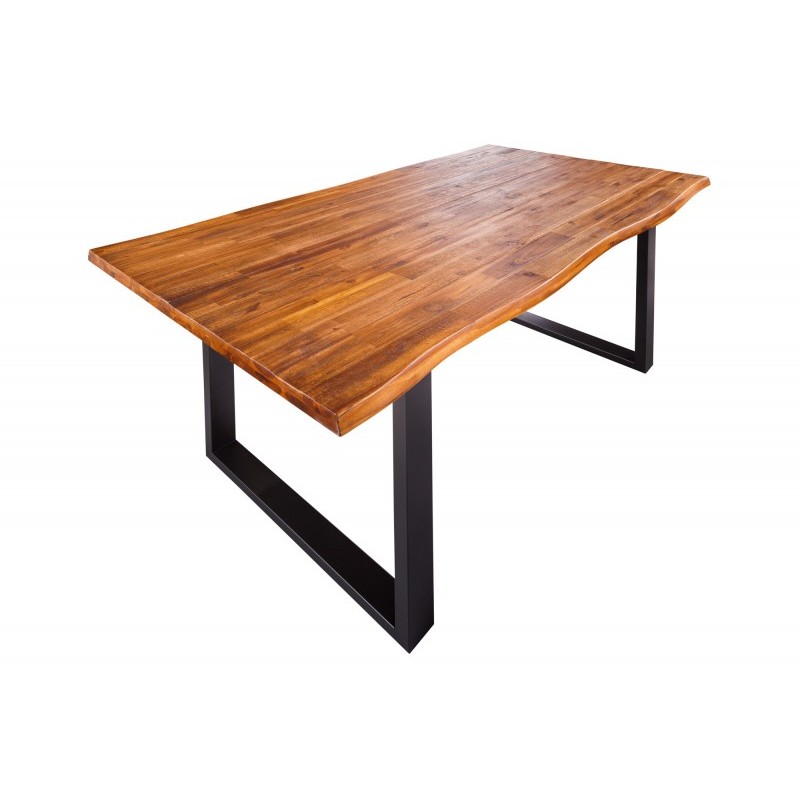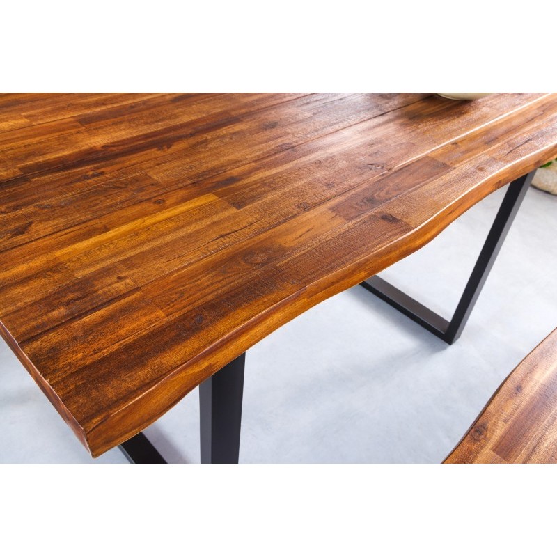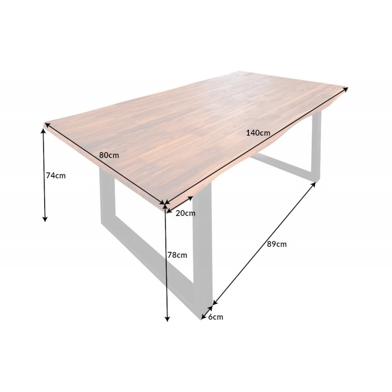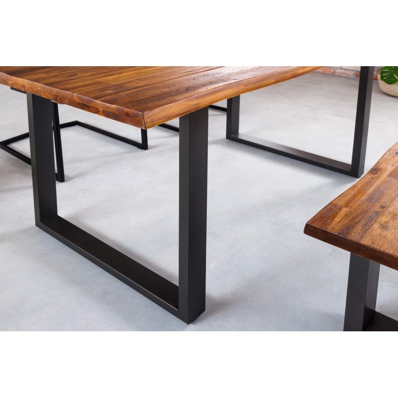 Jest to nowoczesny stół idealnie pasujący do jadalni. Postawiony został na metalowych nogach w kolorze antracytu o grubości 3x6 cm. Blat olejowany został wykonany z litego drewna akacjowego o naturalnej krawędzi drzewa, grubości 3,5 cm. W odcieniu płomiennego brązu prezentuje się zjawiskowo. Mebel ten idealnie odzwierciedla styl industrialny dzięki czemu perfekcyjnie sprawdzi się zarówno w jadalni jak i w salonie.