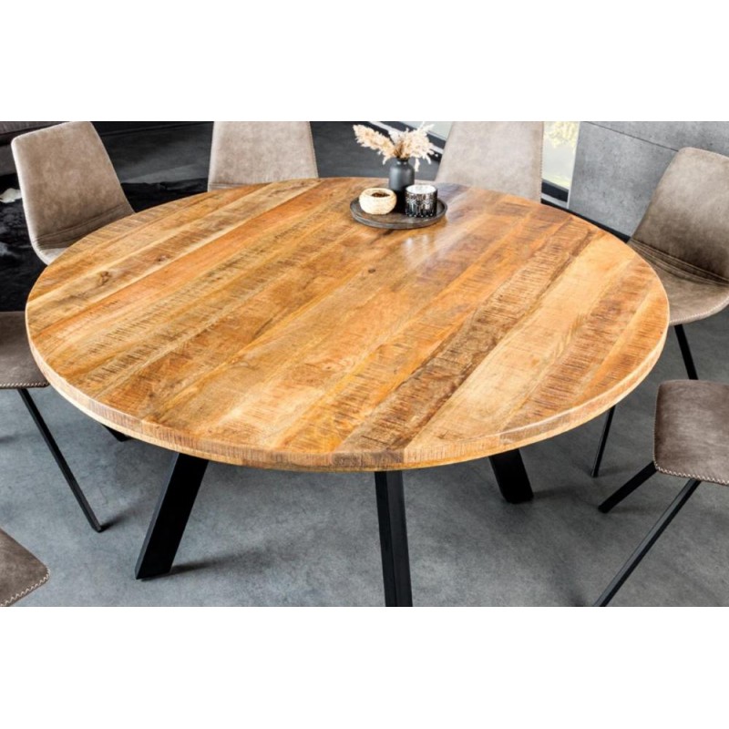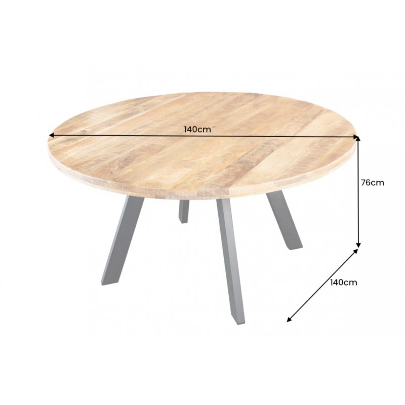 Stół IRON CRAFT to idealne rozwiązanie do każdego większego wnętrza w stylu nowoczesnym czy industrialnym, gdzie dzięki swojej formie i wymiarom doda charakteru i podkreśli wygląd pomieszczenia. Robiący ogromne wrażenie okrągły blat stołu został wykonany z litego drzewa mango w kolorze naturalnym, który zapewnia mu niezwykłą praktyczność oraz funkcjonalność, a dzięki przepięknej barwie bez wątpienia doda wnętrzu niesamowitego wykończenia. Mebel ten wykonany jest z największą dokładnością i dbałością o każdy detal, co można zauważyć na zachowanej strukturze drewna w postaci sęków i słojów, przez co całość prezentuje się zjawiskowo. Blat stołu został osadzony na stabilnej smukłej metalowej podstawie w kolorze czarnym, która uzupełnia i dodaje mu ciekawego wyglądu. Efekt końcowy połączenia naturalnego drewna oraz czarnej metalowej podstawy jest fenomenalny dzięki czemu idealnie sprawdzi się zarówno w salonach w stylu industrialnym jak i nowoczesnym. Stół ten odnajdzie się znakomicie w każdej przestronnej jadalni oraz salonie gdzie bez wątpienia stanie się nie tylko funkcjonalnym meblem, ale także przepiękną dekoracją dodającą wnętrzu niesamowitego oryginalnego wyglądu.