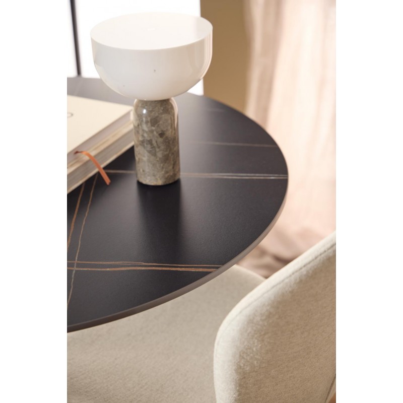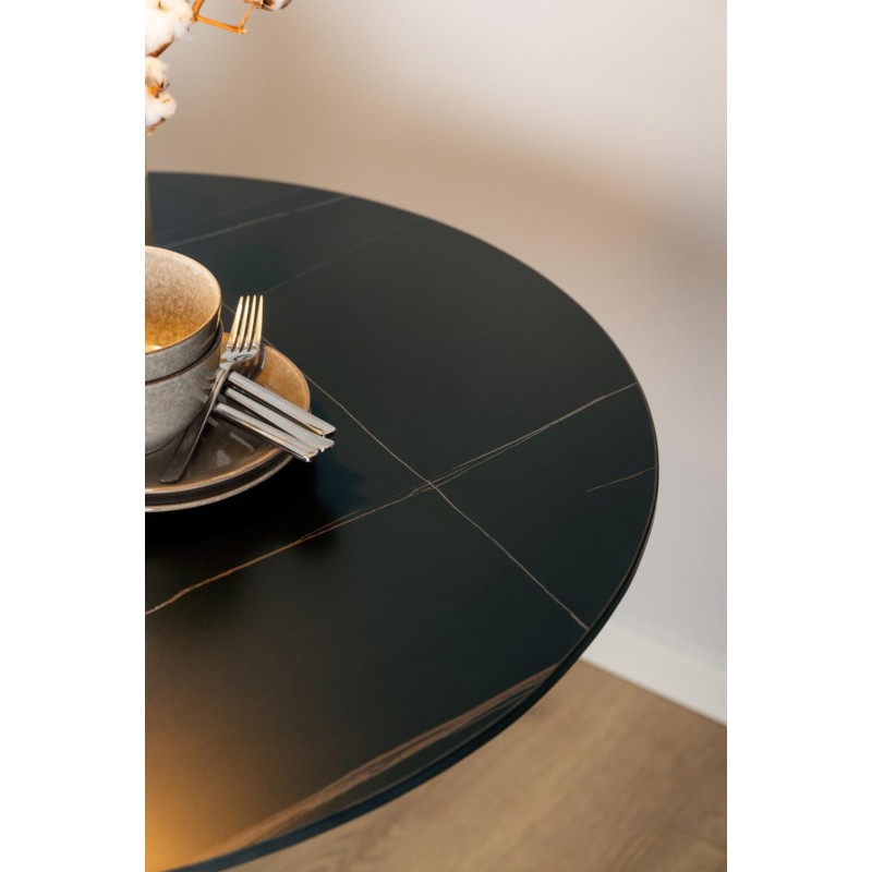 Okrągły stół jadalny Malta z czarnym blatem z polerowanej ceramiki i czarną, stalową podstawą w kształcie trąbki wnosi nowoczesny styl do jadalni. Smukły, łatwy w pielęgnacji blat z odpornej na ciepło i zarysowania ceramiki oraz stabilna podstawa tworzą funkcjonalny i elegancki mebel idealny na wyjątkowe chwile przy stole.