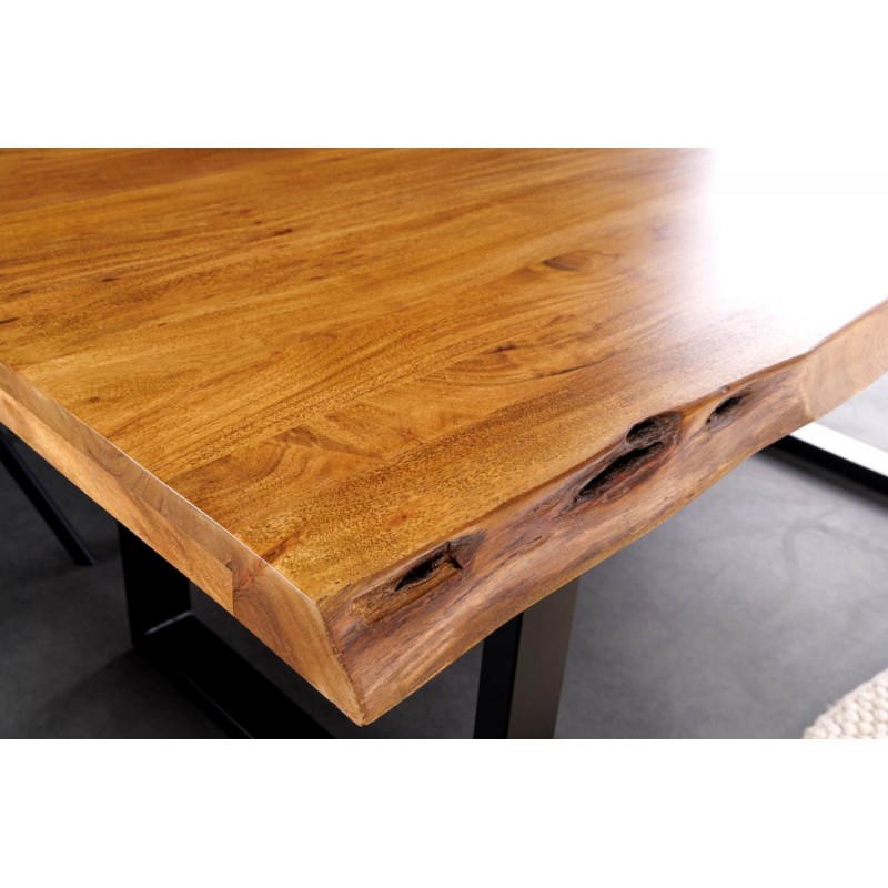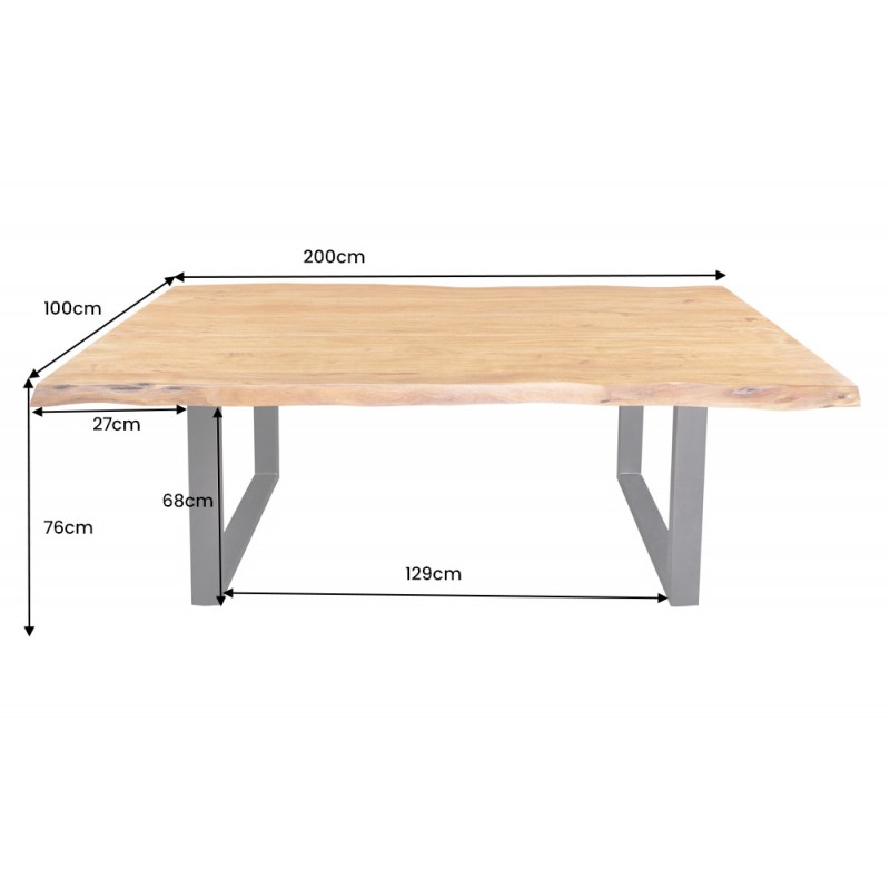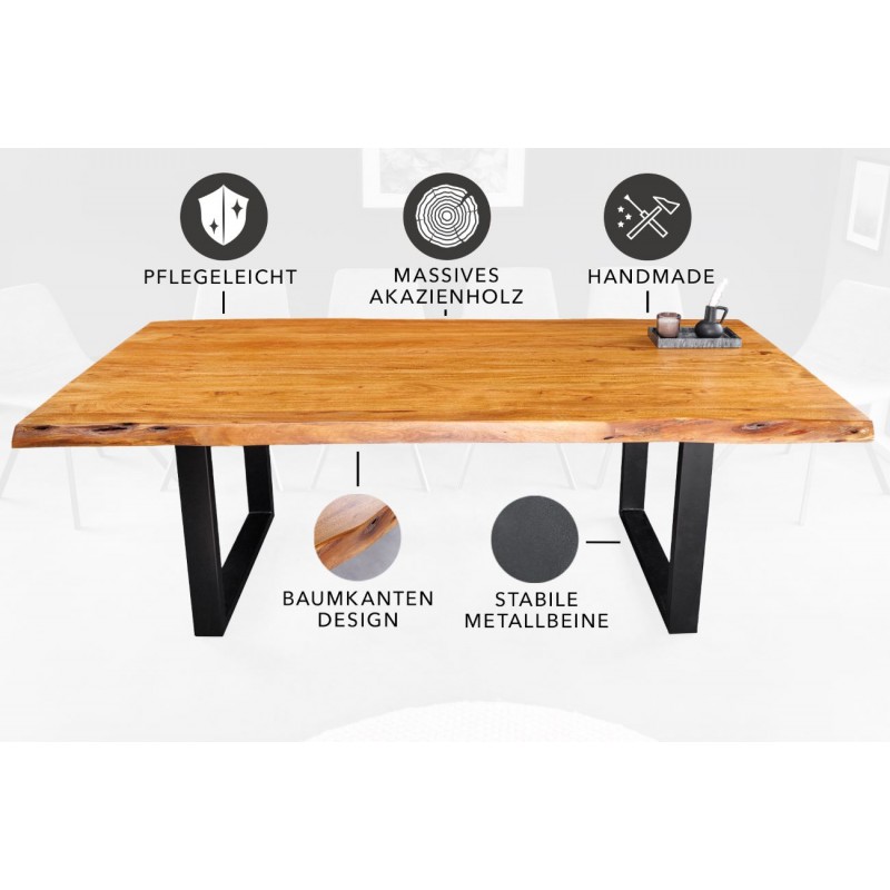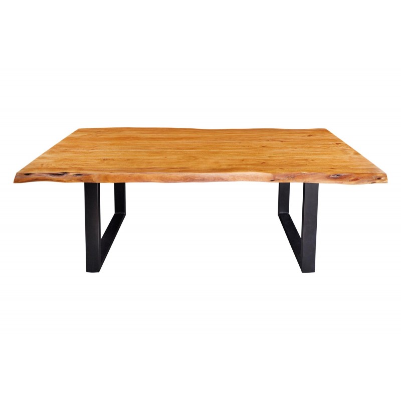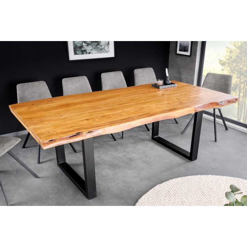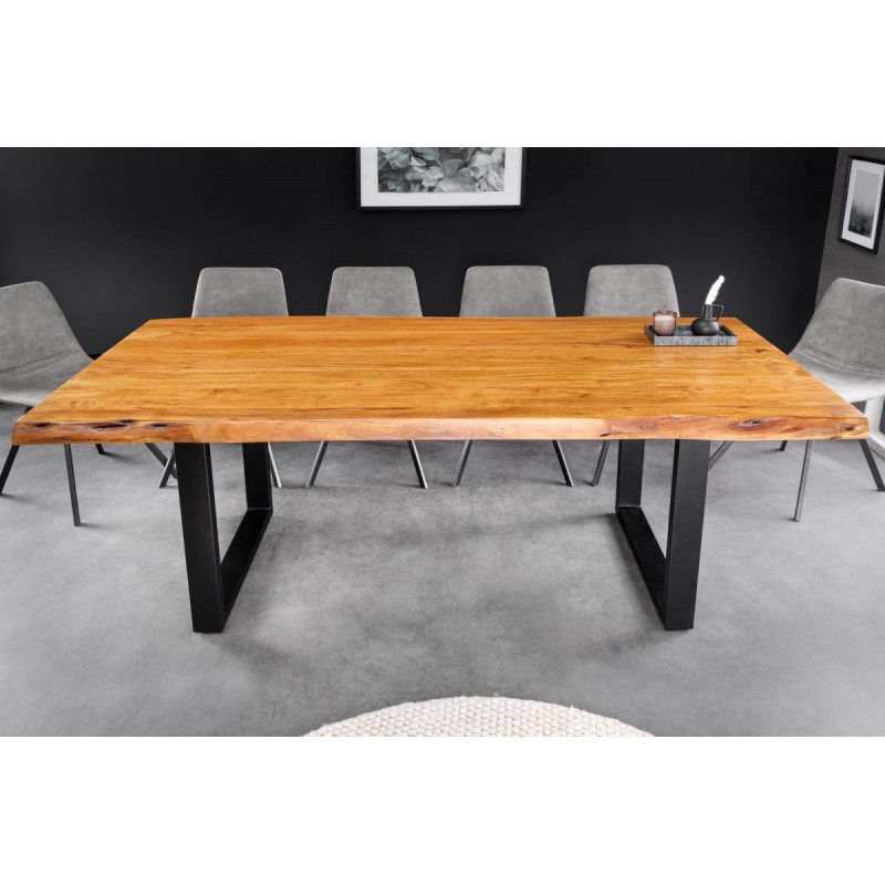 Stół MAMMUT to idealne rozwiązanie do każdego pomieszczenia urządzonego zarówno w stylu industrialnym jak i rustykalnym, gdzie dzięki swojej barwie doda naturalnego wykończenia. Blat stołu zaprojektowano niewątpliwie z dużą precyzją uwydatniając jego niezwykłą naturalność. Został wykonany ręcznie z litego drewna akacji w jej naturalnym kolorze, na którym została zachowana oryginalna struktura oraz krawędź drewna w postaci sęków i słojów, przez co prezentuje się zjawiskowo. Drewniany blat mebla osadzono na stabilnej czarnej metalowej podstawie w kształcie litery U, która zapewnia meblowi solidną konstrukcję dodając tym samym surowego wykończenia. Efekt końcowy połączenia drewna oraz czarnej metalowej podstawy jest fenomenalny dzięki czemu idealnie sprawdzi się zarówno w salonach w stylu industrialnym jak i nowoczesnym. Stół ten odnajdzie się znakomicie w każdej przestronnej jadalni oraz salonie gdzie bez wątpienia stanie się nie tylko funkcjonalnym meblem, ale także przepiękną dekoracją dodającą wnętrzu niesamowitego oryginalnego wyglądu.