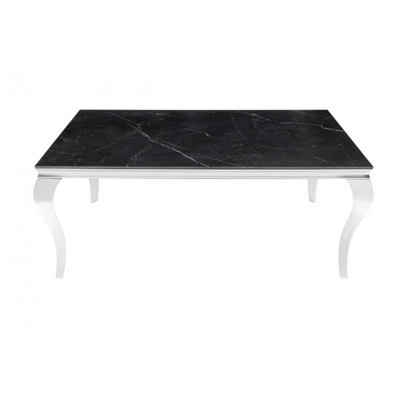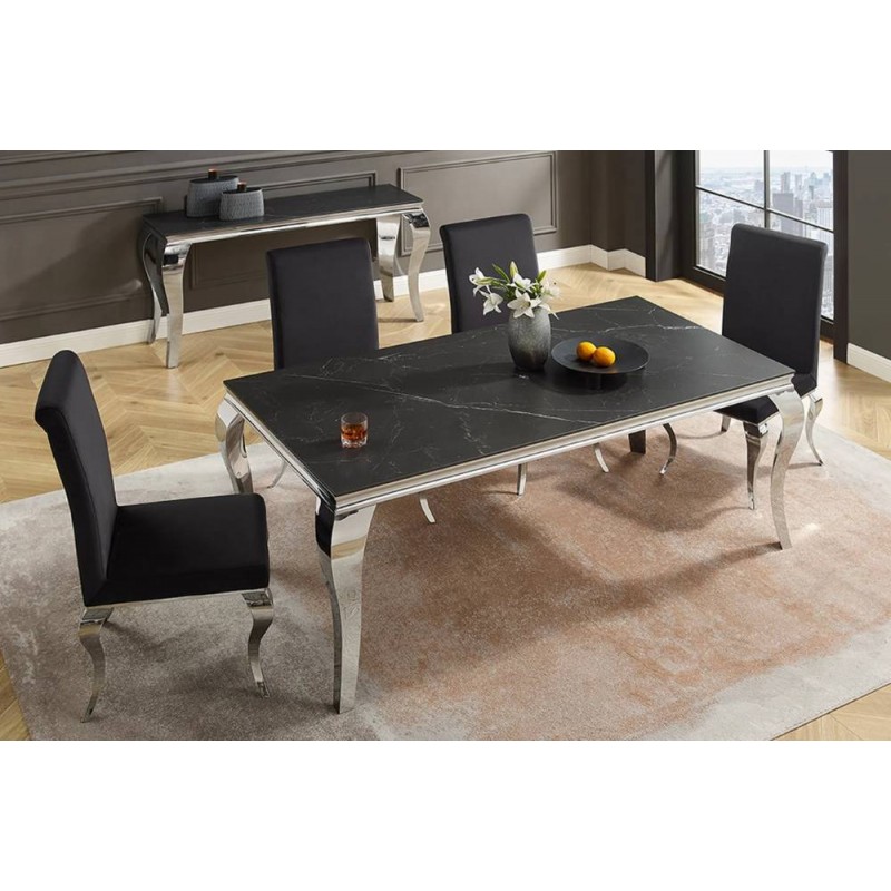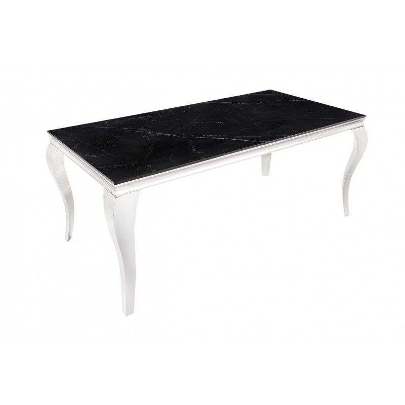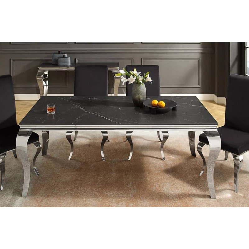 Stół MODERN BAROCK BARRACUDA to idealne rozwiązanie do każdej jadalni oraz salonu i wnętrza w stylu nowoczesnym, gdzie mebel ten dzięki swojej unikatowej formie przykuje uwagę każdego, a także nada wnętrzu charakteru. Jego najbardziej przyciągającym uwagę elementem jest prostokątny blat o grubości 1,0 cm, wykonany ze spieku kamiennego wyglądem przypominającego marmur, którego kolorystykę przełamano charakterystycznymi delikatnymi nitkami w różnych w odcieniach szarości i bieli. Całość mebla została osadzona na stabilnej i solidnej metalowej konstrukcji wykonanej z polerowanej stali nierdzewnej w kolorze srebrnym. Ogromną zaletą jest nie tyle funkcjonalność jak również duża wytrzymałość oraz łatwość czyszczenia, która wyróżniają się swoją naturalnością, kolorem oraz strukturą sprawiając przy tym, że każdy egzemplarz stołu jest unikatowy. Efekt końcowy połączenia ciemnego blatu oraz srebrnej podstawy jest fenomenalny, dzięki czemu całość mebla stanie się wspaniałą dekoracją, która doda wnętrzu nowoczesnego wykończenia oraz niesamowitego wyglądu. Mebel ten perfekcyjnie odzwierciedla styl nowoczesny oraz barokowy, a jego szlachetne wzornictwo sprawi, że twój salon uzyska trochę luksusu oraz niezwykłej i niepowtarzalnej charyzmy.