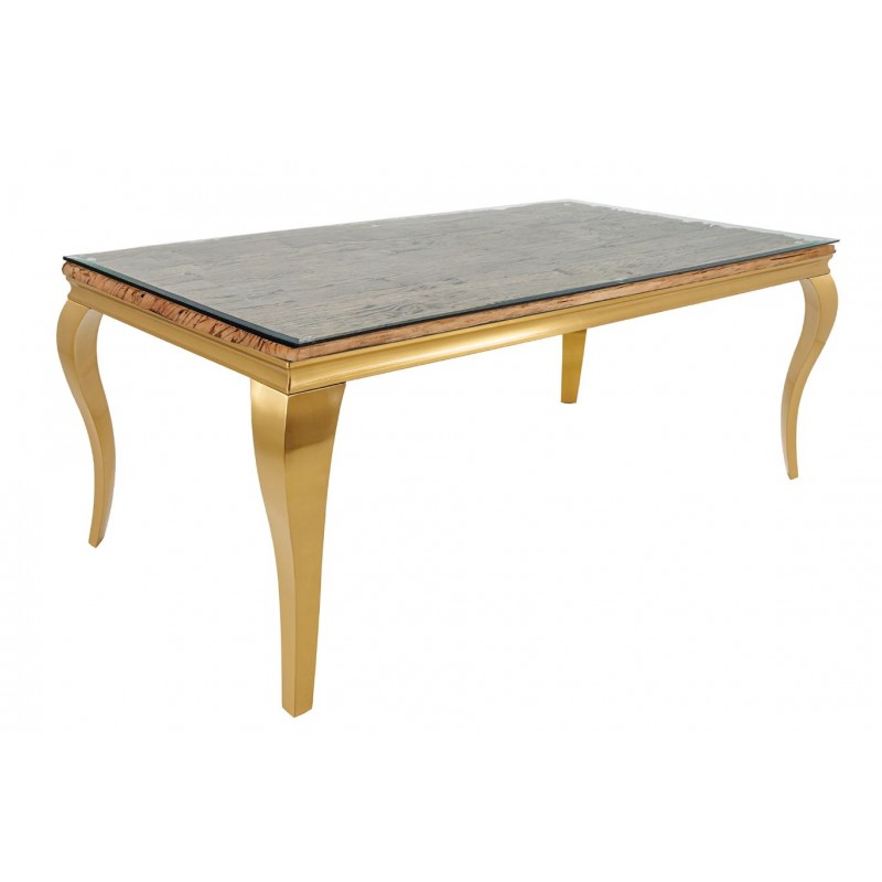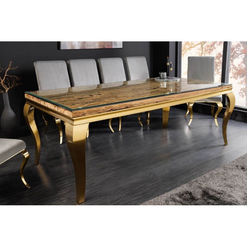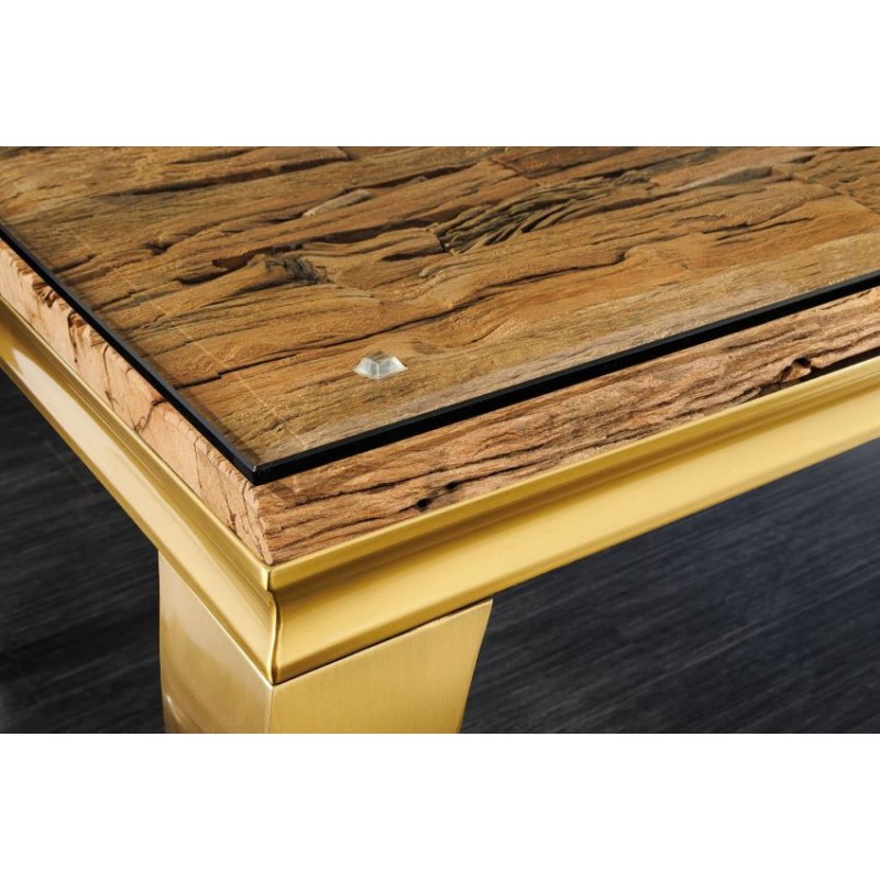 Stół MODERN BAROCK BARRACUDA to idealne rozwiązanie do każdej jadalni oraz salonu i wnętrza w stylu nowoczesnym, gdzie mebel ten dzięki swojej unikatowej formie przykuje uwagę każdego, a także nada wnętrzu charakteru i naturalnego wykończenia. W górnej części składa się z przezroczystego blatu wykonanego ze szkła hartowanego, którego bez wątpienia głównym atutem jest niesamowity dodatkowy blat znajdujący się pod szybą wykonany z częściowo postarzanego, litego drewna tekowego, pochodzącego z recyklingu. Dzięki zachowaniu oryginalnej struktury drewna w postaci szczelin, słojów i sęków prezentuje się zjawiskowo. Całość mebla została osadzona na stabilnej i solidnej metalowej konstrukcji wykonanej z polerowanej stali nierdzewnej w kolorze złotym. Mebel ten perfekcyjnie odzwierciedla styl nowoczesny oraz barokowy, a jego szlachetne wzornictwo sprawi, że twój salon uzyska trochę luksusu oraz niezwykłej i niepowtarzalnej charyzmy, charakteru oraz niezwykłej elegancji.