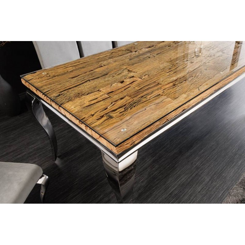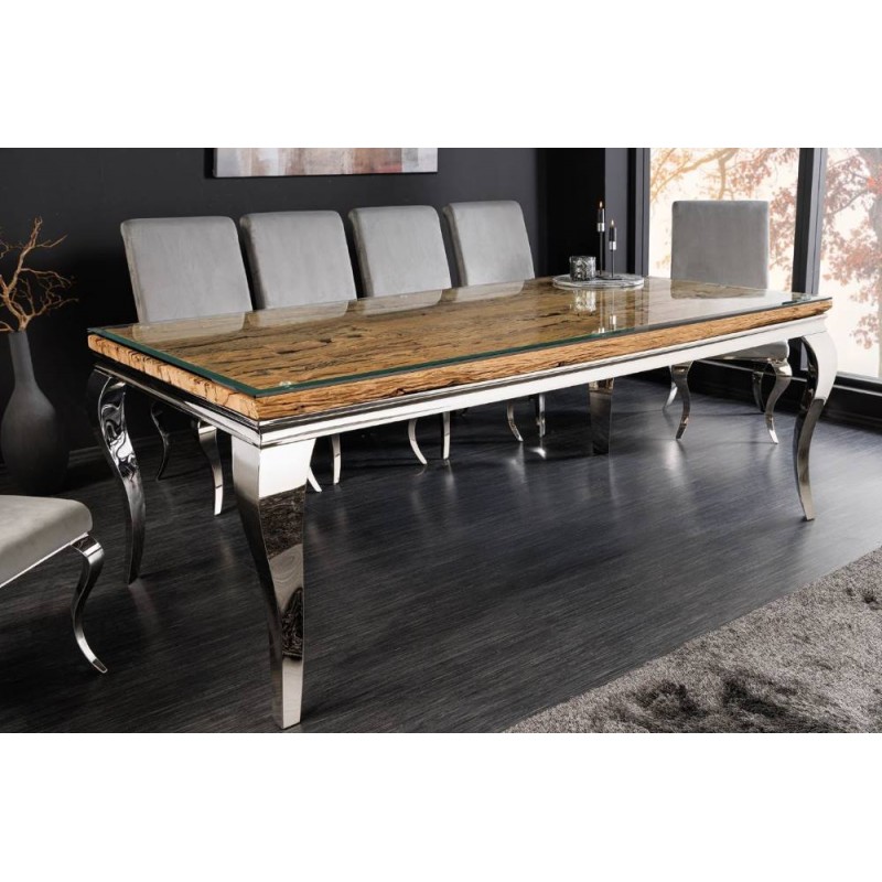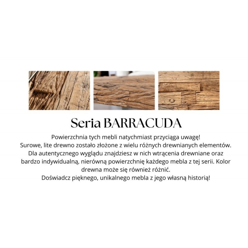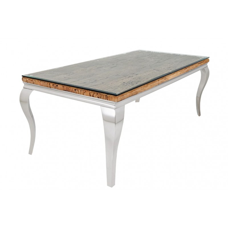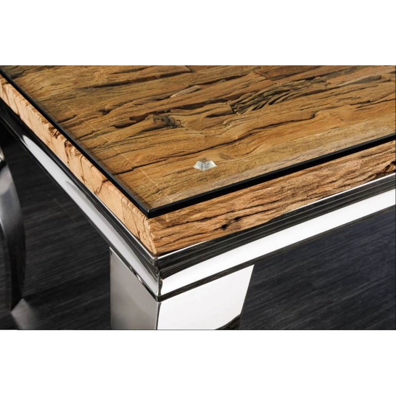 Stół MODERN BAROCK BARRACUDA to idealne rozwiązanie do każdej jadalni oraz salonu i wnętrza w stylu nowoczesnym, gdzie mebel ten dzięki swojej unikatowej formie przykuje uwagę każdego, a także nada wnętrzu charakteru i naturalnego wykończenia. W górnej części składa się z przezroczystego blatu wykonanego ze szkła hartowanego, którego bez wątpienia głównym atutem jest niesamowity dodatkowy blat znajdujący się pod szybą wykonany z częściowo postarzanego, litego drewna tekowego, pochodzącego z recyklingu. Dzięki zachowaniu oryginalnej struktury drewna w postaci szczelin, słojów i sęków prezentuje się zjawiskowo. Całość mebla została osadzona na stabilnej i solidnej metalowej konstrukcji wykonanej z polerowanej stali nierdzewnej w kolorze srebrnym. Mebel ten perfekcyjnie odzwierciedla styl nowoczesny oraz barokowy, a jego szlachetne wzornictwo sprawi, że twój salon uzyska trochę luksusu oraz niezwykłej i niepowtarzalnej charyzmy, charakteru oraz niezwykłej elegancji.