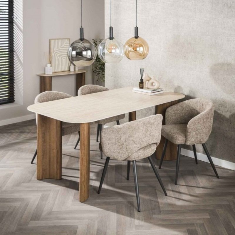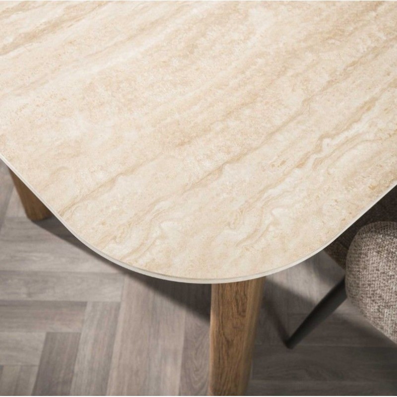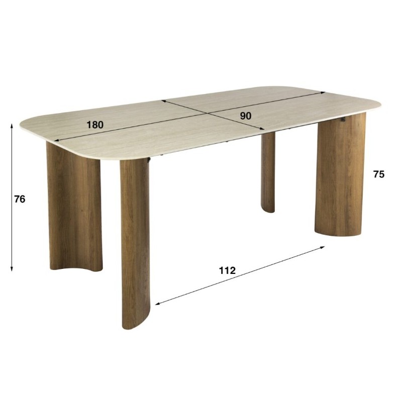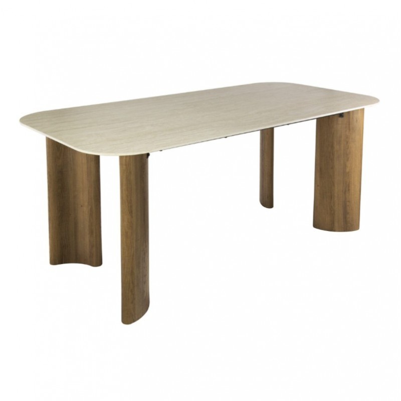 Stół MORAJ to idealne rozwiązanie do każdego salonu oraz jadalni urządzonego stylu nowoczesnym, który doda naturalności i spokoju, a także dzięki swojej formie przykuje uwagę każdego. Duży prostokątny zaokrąglony blat został wykonany z ceramiki w kolorze beżowym, którego struktura podkreśla wyjątkowy charakter mebla. Wyróżnia się on między innymi swoją wyrazistością poprzez zastosowanie w nim dekoracji w formie kamienia naturalnego o wyglądzie trawertynu wraz z elegancką charakterystyczną kolorystyką oraz dopełniającymi odcieniami w jaśniejszych kolorach beżu. Głównym jego atutem bez wątpienia jest blat osadzony na stabilnej podstawie w formie zakrzywionych kolumn wykonanych z płyty MDF pokrytych dekorem drewnianym imitującym dąb na których zachowano oryginalną strukturą drewna w postaci sęków i słojów uwydatniając tym samym ich naturalność. Zaletą tego stołu jest funkcjonalność, wytrzymałość oraz łatwość czyszczenia, dzięki czemu wyróżnia się swoją wyrazistością, kolorem i strukturą powodując, że każdy egzemplarz jest unikatowy. Efekt końcowy wykończenia w całości w jasnych kolorach jest jednolity sprawiając tym samym, że stół MORAJ sprawdzi się znakomicie w każdym nowoczesnym salonie oraz jadalni, gdzie stanie się nie tylko funkcjonalnym meblem, ale także przepiękną dekoracją.