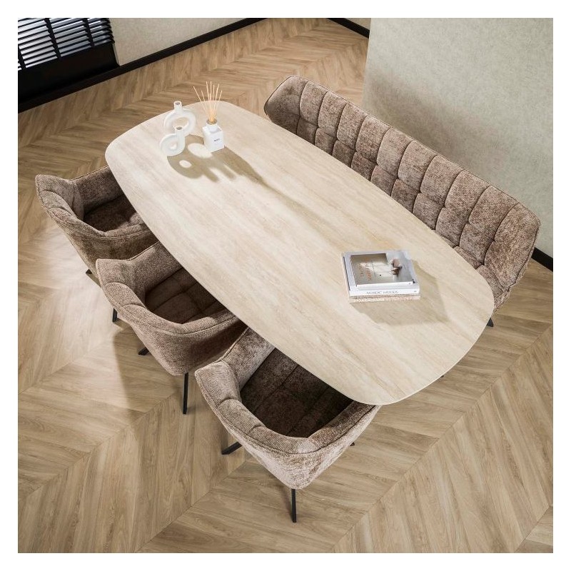 | Dodatkowe informacje | owalny blat stanowi ceramika przypominająca trawertyn z zastosowaniem charakterystycznych różnych odcieniach beżowych nitek, które sprawiają, że każdy stół jest unikalny i niepowtarzalny. |