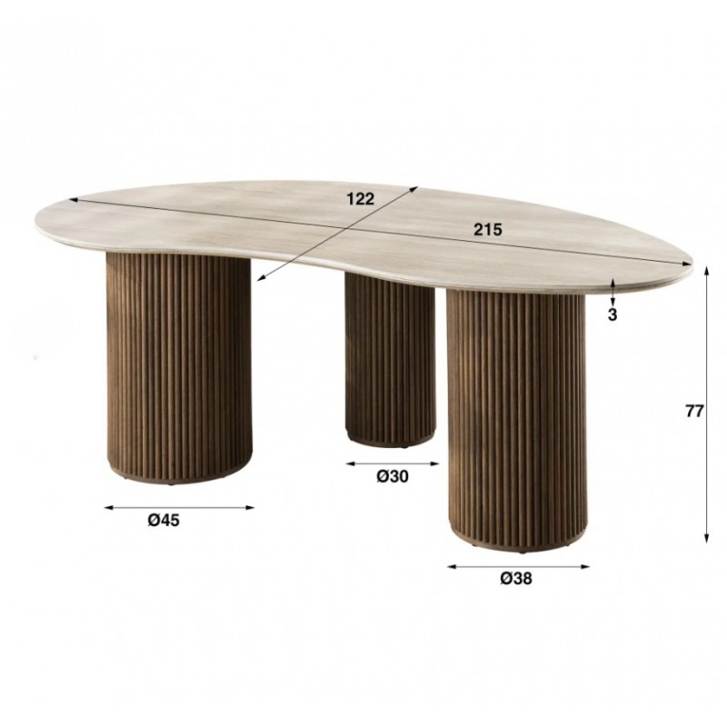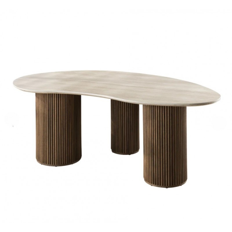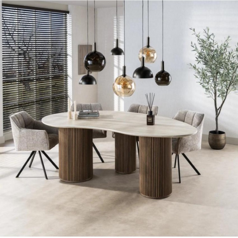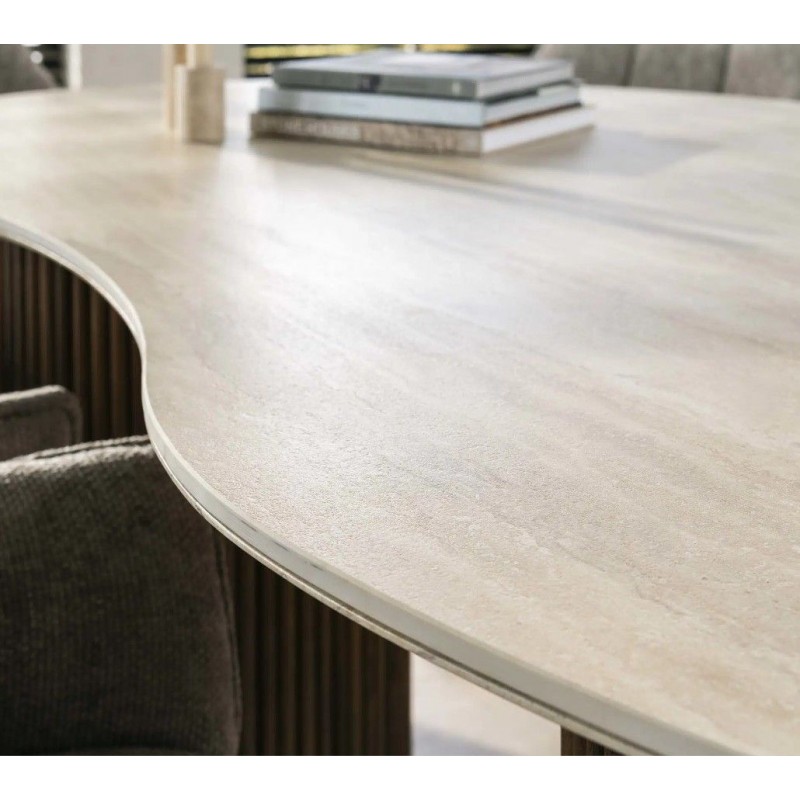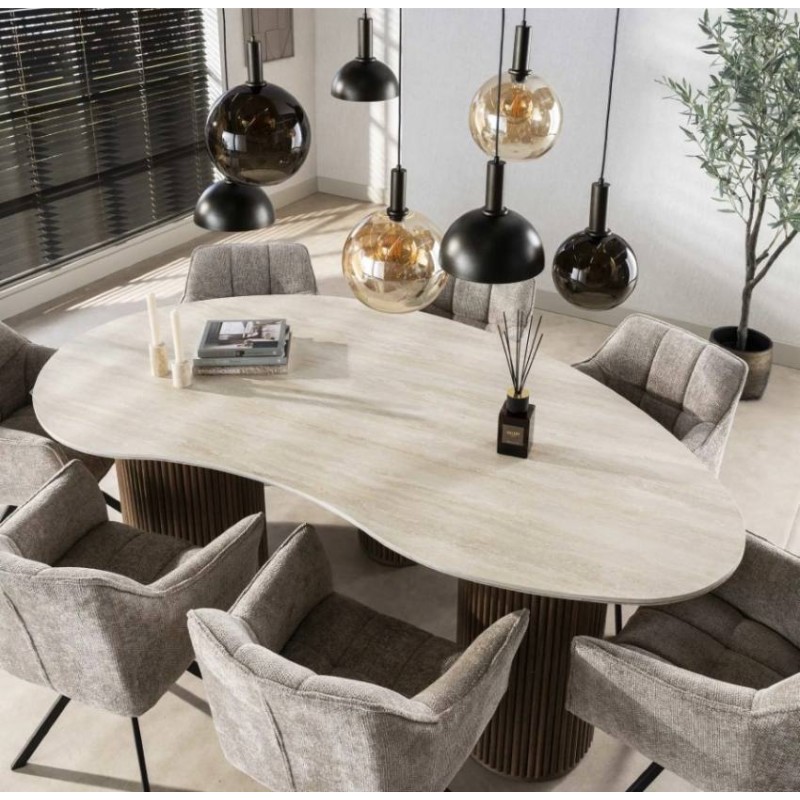 Stół MORAJ to idealne rozwiązanie do każdego salonu oraz jadalni urządzonego stylu nowoczesnym, który doda naturalności i spokoju, a także dzięki swojej formie przykuje uwagę każdego. Duży owalny blat w kształcie nerki został wykonany z ceramiki w kolorze beżowym, którego struktura podkreśla wyjątkowy charakter mebla. Wyróżnia się on między innymi swoją wyrazistością poprzez zastosowanie w nim dekoracji w formie kamienia naturalnego o wyglądzie trawertynu wraz z elegancką charakterystyczną kolorystyką oraz dopełniającymi odcieniami w jaśniejszych kolorach beżu. Głównym jego atutem bez wątpienia jest blat osadzony na solidnej drewnianej podstawie składającej się z trzech kolumn w formie charakterystycznych frezowań przypominających pionowe lamele na którym zachowano oryginalną strukturą drewna w postaci sęków i słojów uwydatniając tym samym ich naturalność. Zaletą tego stołu jest funkcjonalność, wytrzymałość oraz łatwość czyszczenia, dzięki czemu wyróżnia się swoją wyrazistością, kolorem i strukturą powodując, że każdy egzemplarz jest unikatowy. Efekt końcowy wykończenia jasnego koloru blatu z drewnianą podstawą sprawia, że stół MORAJ sprawdzi się znakomicie w każdym nowoczesnym salonie oraz jadalni, gdzie stanie się nie tylko funkcjonalnym meblem, ale także przepiękną dekoracją.
