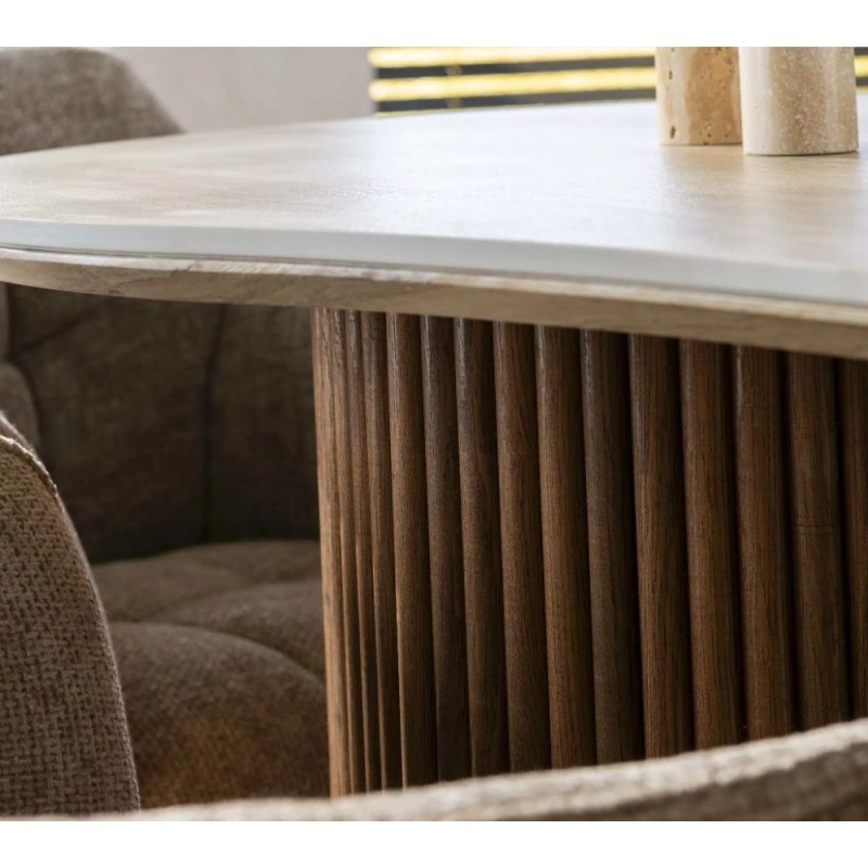 | Dodatkowe informacje | owalny blat stanowi ceramika przypominająca trawertyn z zastosowaniem charakterystycznych różnych odcieniach beżowych nitek, które sprawiają, że każdy mebel jest unikalny i niepowtarzalny. |