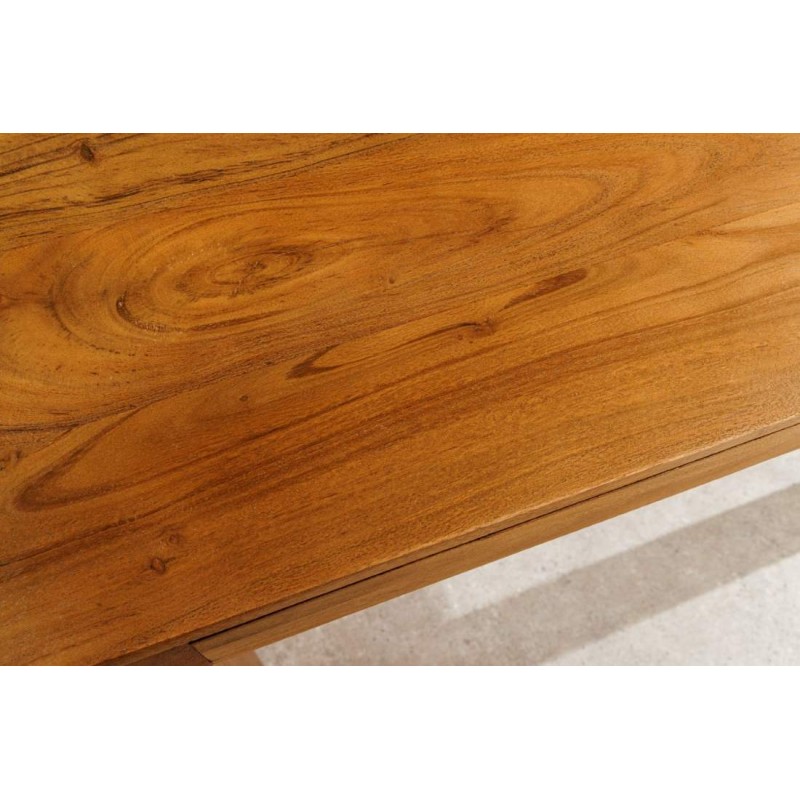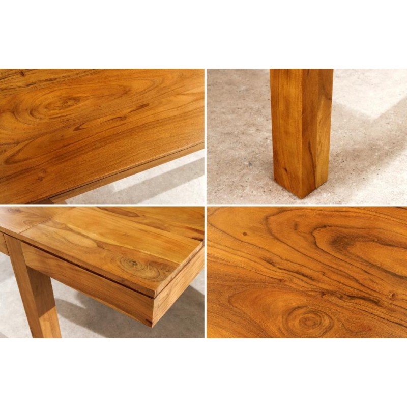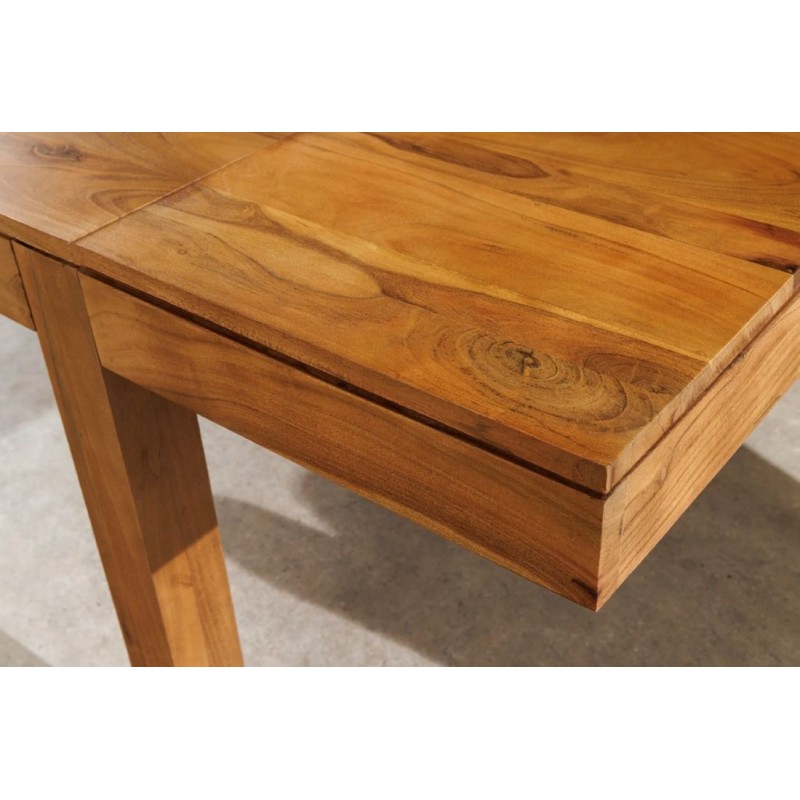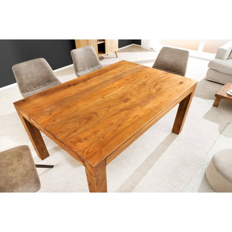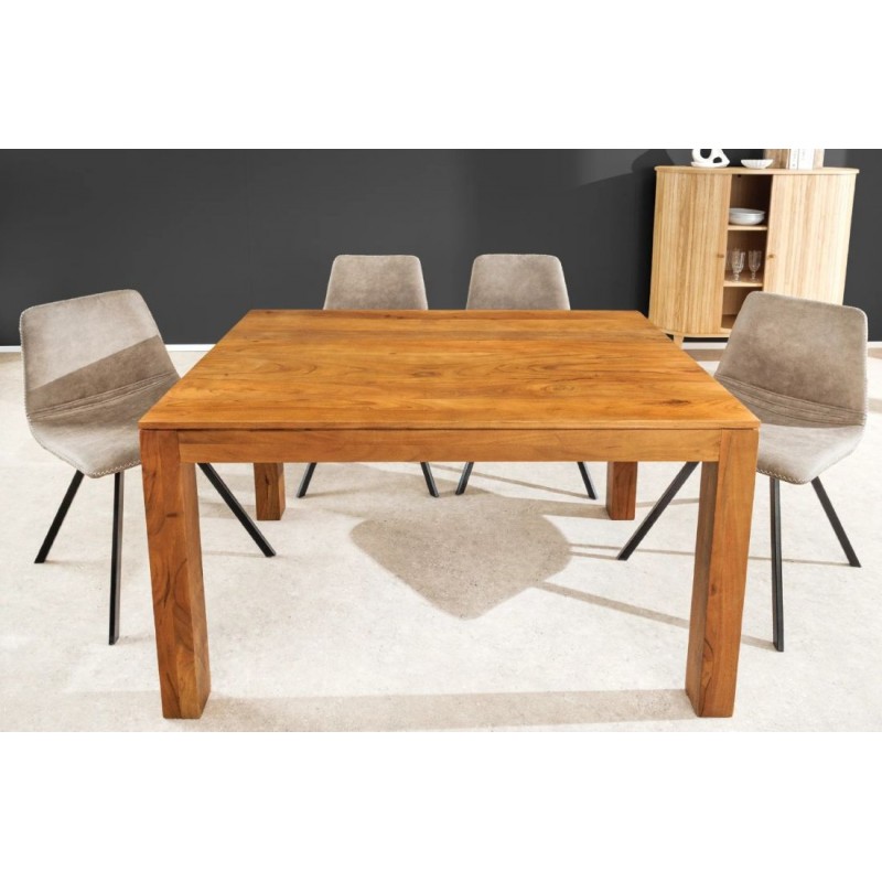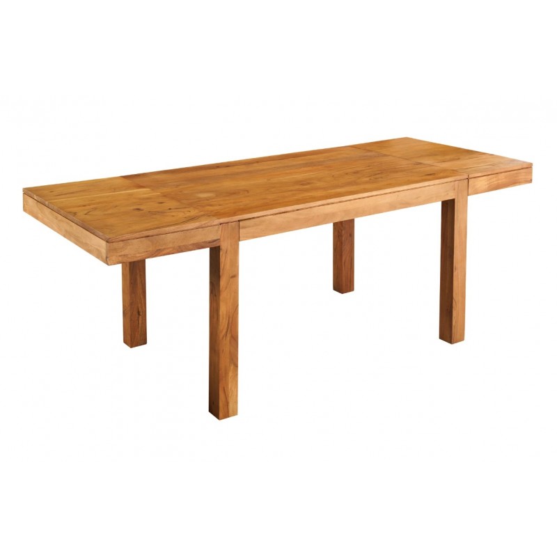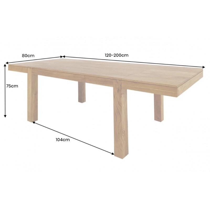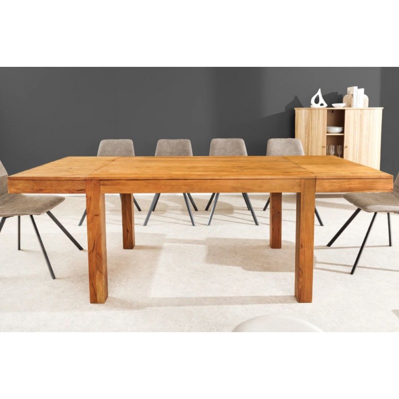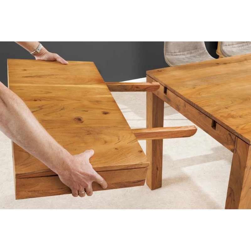 Nowoczesny stół PURE wykonany został z litego drewna akacji. Blat zachwyca starannym wykonaniem i wiernym odwzorowaniem naturalnej struktury drewna, na którym widoczne słoje i sęki podkreślają jego charakter, całość mebla wspiera mocna, stabilna drewniana podstawa. Cechą szczególną tego stołu jest możliwość przedłużenia blatu, dzięki czemu z łatwością możemy go zmniejszać i zwiększać o długość 80 cm za pomocą dwóch bocznych przedłużek. Stół PURE sprawdzi się znakomicie w każdym salonie oraz jadalni, gdzie doda wnętrzu charakteru i niesamowitego stylu oraz stanie się centralnym meblem pomieszczenia, przy którym czas może spędzić cała rodzina. Ponadto w każdym przestronnym wnętrzu bez wątpienia stanie się on nie tylko funkcjonalnym meblem, ale także przepiękną dekoracją dodającą pomieszczeniu niesamowitego wyglądu. Efekt końcowy połączenia drewnianego blatu oraz podstawy jest jednolity dzięki czemu idealnie sprawdzi się zarówno w salonach w stylu industrialnym jak i retro.