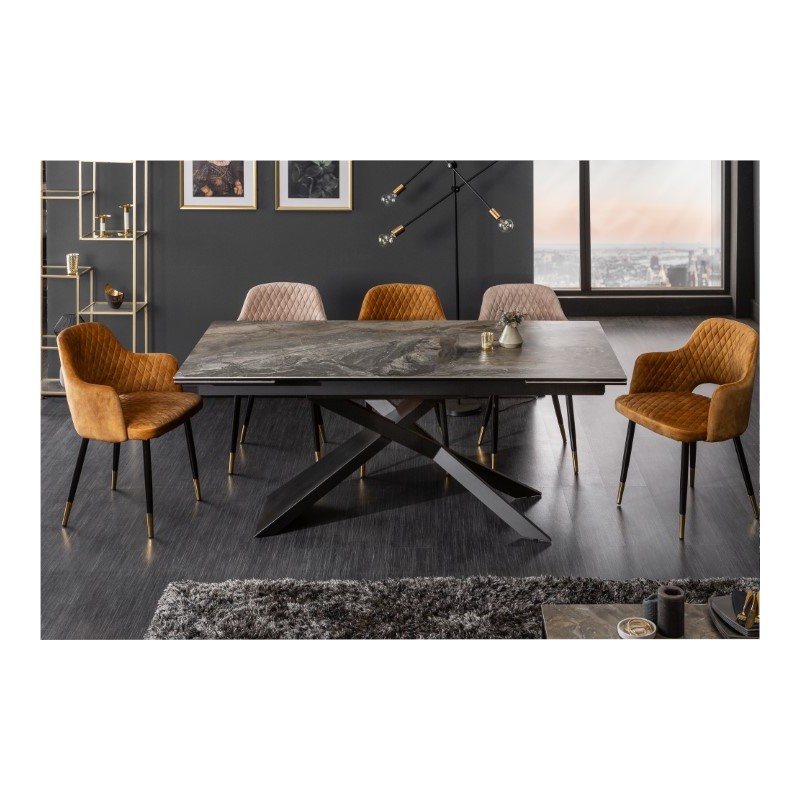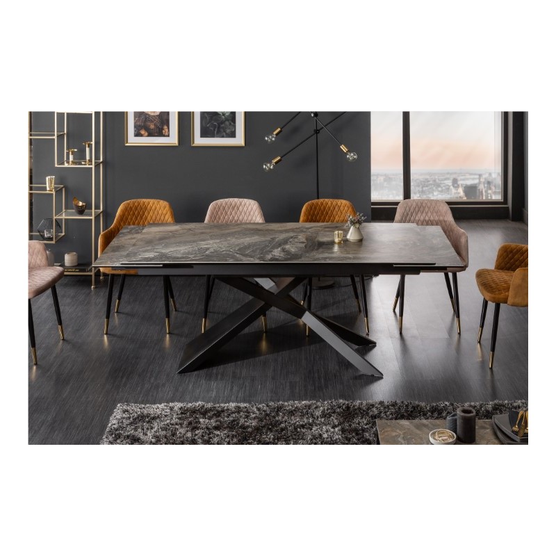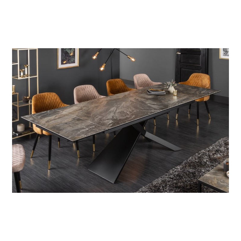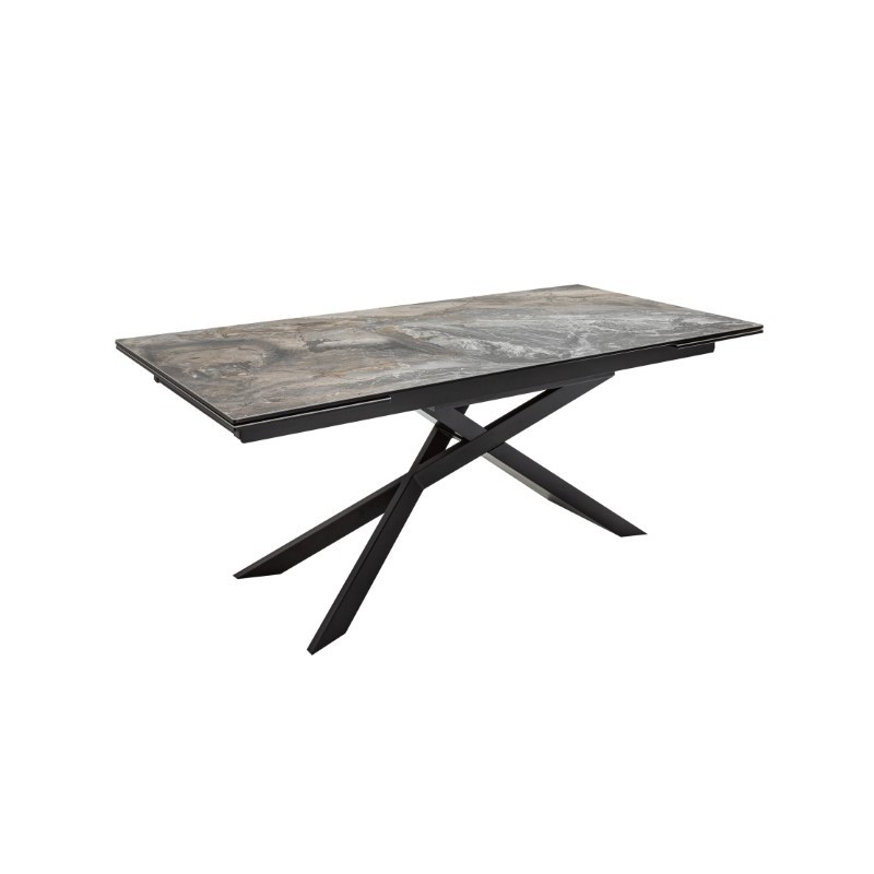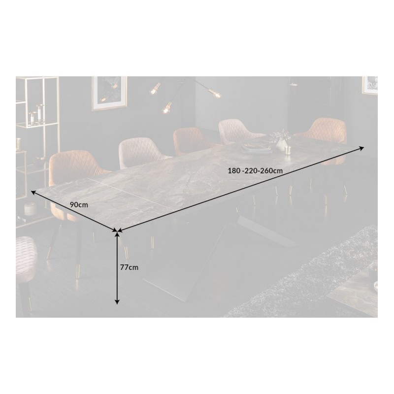Stół rozkładany z pięknym, ceramicznym blatem imitującym marmur prezentuje się zjawiskowo. Nogi stołu wykonane zostały z metalu w kolorze czarnym. Blat o grubości 1,3 cm został wykonany z ceramiki nałożonej na szkło hartowane. Mebel idealnie sprawdzi się we wnętrzach w stylu nowoczesnym, w dużych salonach, przestronnych pomieszczeniach, a nawet salach konferencyjnych.