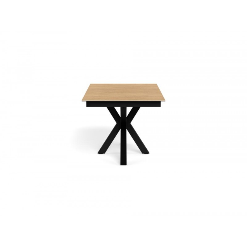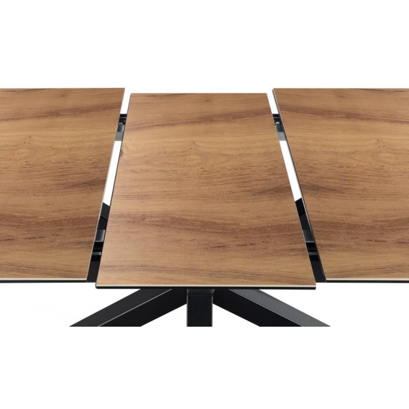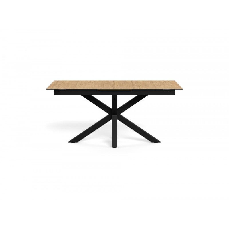 Prostokątny stół Heaven z możliwością przedłużenia zaprojektowany został głównie z myślą o jadalni w stylu nowoczesnym. Blat o grubości 1,2 cm wykonany jest z ceramiki imitującej dziki dąb, odpornej na ciepło oraz zarysowania. Stół ten zawiera przedłużenie znajdujące się bezpośrednio w schowku pod blatem, a jego możliwość rozłożenia sprawia, że w łatwy i szybki sposób dostosuje się rozmiar stołu do liczby gości. Mebel został osadzony na solidnej czarnej metalowej podstawie, a nogi w kształcie pająka zostały zaprojektowane w taki sposób, aby nie stanowiły problemu ułożenia krzeseł podczas siedzenia. Całość wspaniale komponuje się z podstawą utrzymaną w czarnej tonacji, a efekt końcowy połączenia kolorów blatu oraz podstawy jest fenomenalny, dzięki czemu idealnie sprawdzi się również w salonach w stylu industrialnym.