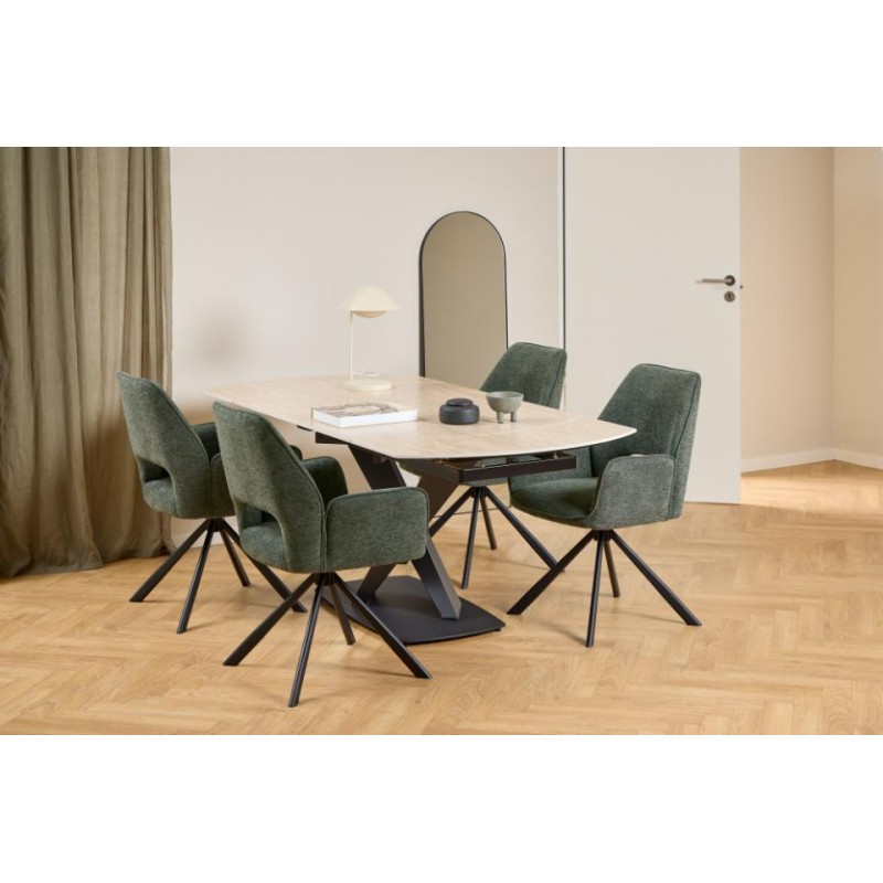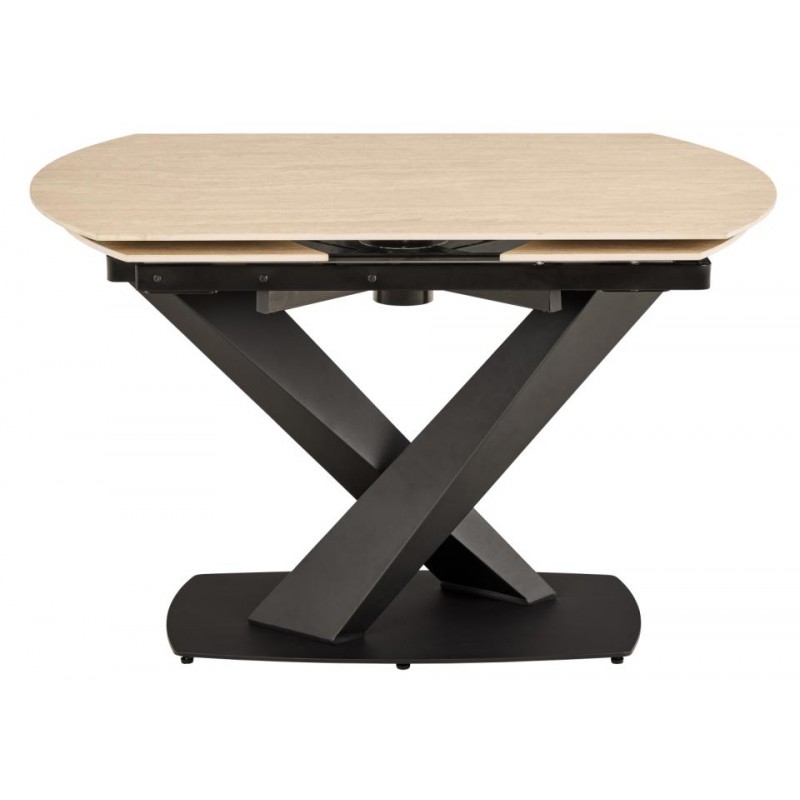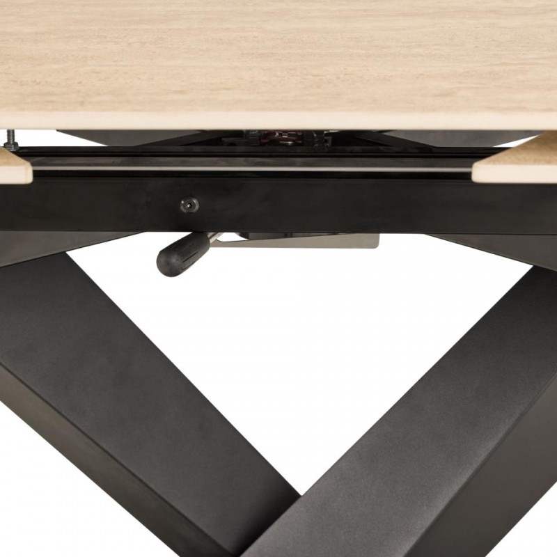 Ten piękny rozkładany stół z ceramicznym blatem koloru beżowego, imitującym marmur prezentuje się zjawiskowo odzwierciedlając idealnie styl industrialny. Blat został wykonany z ceramiki, cechą szczególną tego stołu jest obrotowy mechanizm blatu, dzięki któremu z łatwością możemy go zmniejszać i zwiększać o długość 60 cm. Jego podstawę stanowi solidna konstrukcja w kolorze czarnym o kształcie dysku. Mebel ten znakomicie sprawdzi się w dużych, nowoczesnych pomieszczeniach jako stół do jadalni oraz salonu.