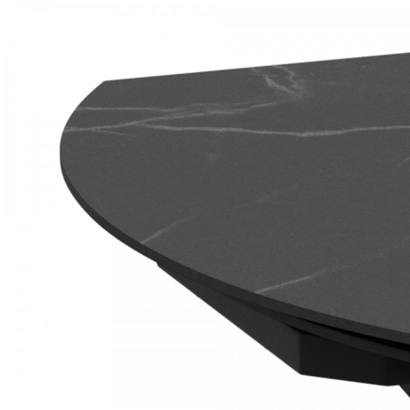 Ten piękny rozkładany stół z ceramicznym blatem koloru czarnego, imitującym marmur prezentuje się zjawiskowo odzwierciedlając idealnie styl industrialny. Blat został wykonany z ceramiki, cechą szczególną tego stołu jest obrotowy mechanizm blatu, dzięki któremu z łatwością możemy go zmniejszać i zwiększać o długość 60 cm. Jego podstawę stanowi solidna konstrukcja w kolorze czarnym o kształcie dysku. Mebel ten znakomicie sprawdzi się w dużych, nowoczesnych pomieszczeniach jako stół do jadalni oraz salonu.