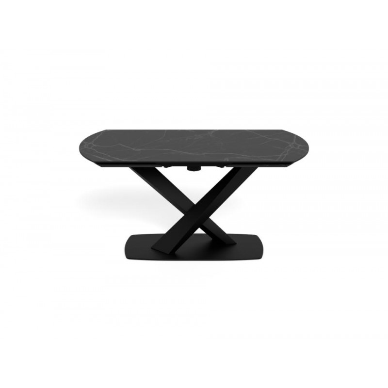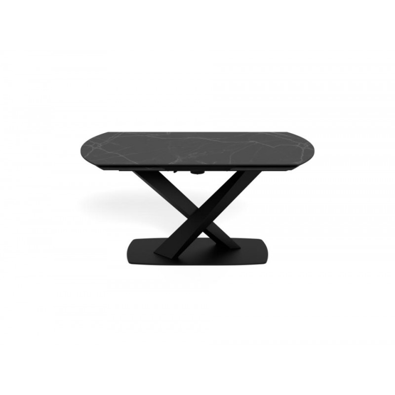 Ten piękny rozkładany stół z ceramicznym blatem koloru czarnego, imitującym marmur prezentuje się zjawiskowo odzwierciedlając idealnie styl industrialny. Blat został wykonany z ceramiki, cechą szczególną tego stołu jest obrotowy mechanizm blatu, dzięki któremu z łatwością możemy go zmniejszać i zwiększać o długość 80 cm. Jego podstawę stanowi solidna konstrukcja w kolorze czarnym o kształcie dysku. Mebel ten znakomicie sprawdzi się w dużych, nowoczesnych pomieszczeniach jako stół do jadalni oraz salonu.