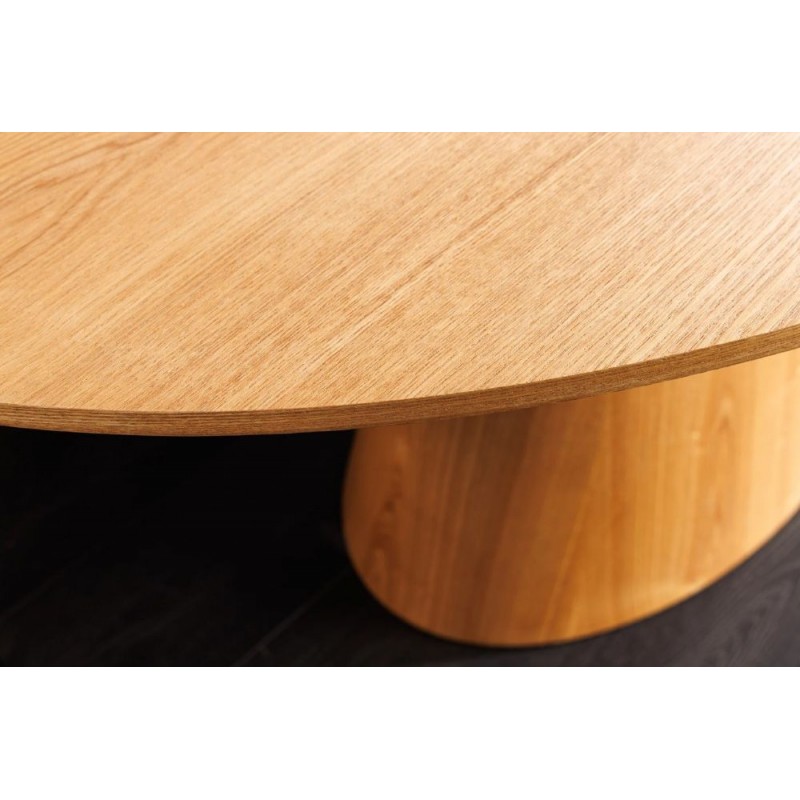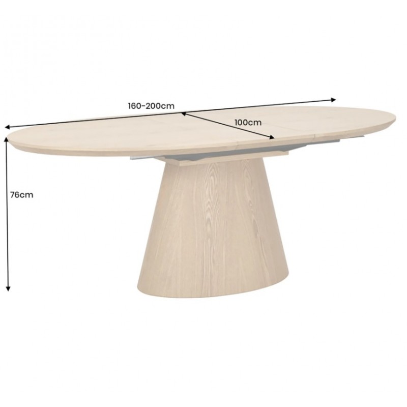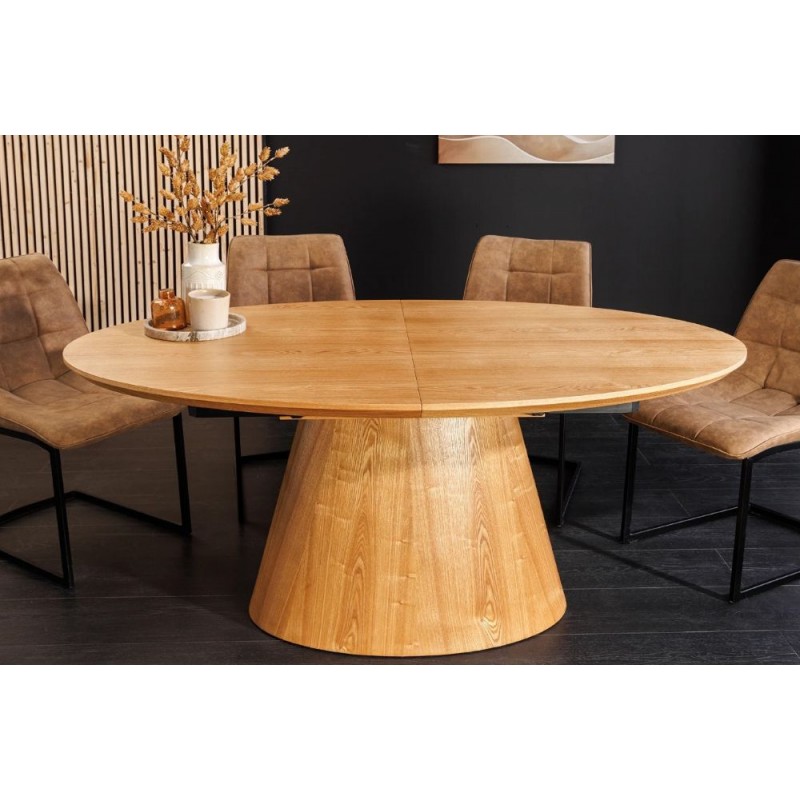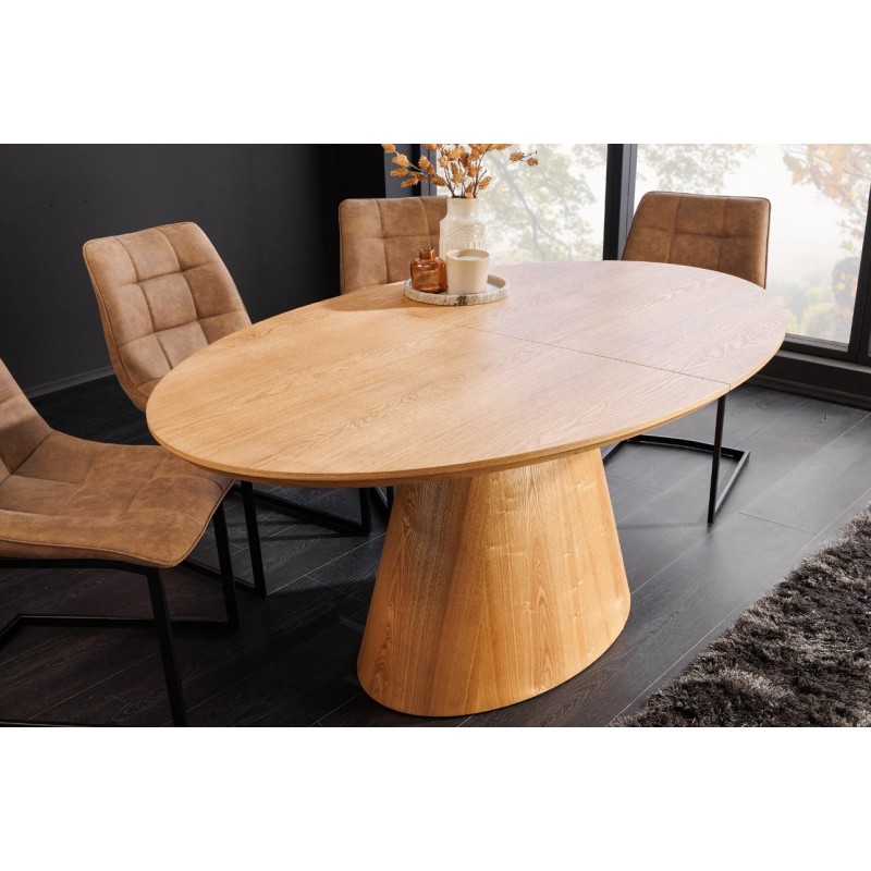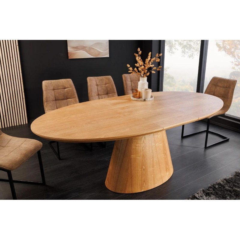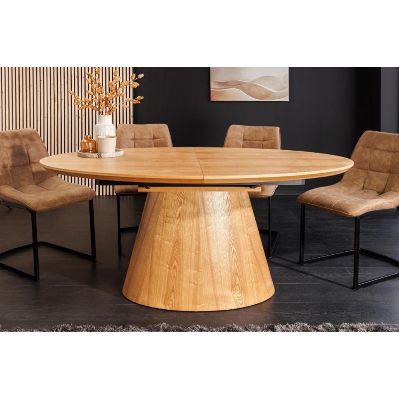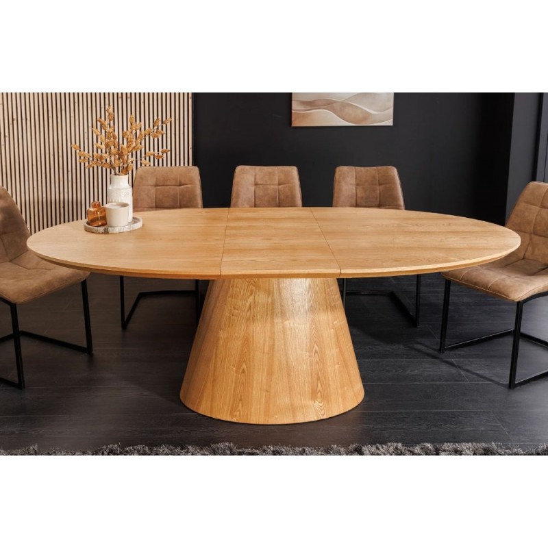 Ten robiący ogromne wrażenie owalny rozkładany stół UNIQUE, to idealne rozwiązanie do każdego salonu czy jadalni w stylu nowoczesnym, który dodaje przestrzeni niesamowitego stylu oraz klasy. Duży praktyczny blat został wykonany z płyty MDF z dekorem drewnianym imitującym drewno dębowe w kolorze naturalnym i osadzono go na solidnej stożkowej podstawie. Dzięki funkcji rozkładania, jego powierzchnię można w łatwy i szybki sposób powiększyć przy pomocy praktycznej przedłużki, dostosowując wielkość stołu do liczby gości lub aktualnych potrzeb. Bez wątpienia wyróżnia się swoją wyrazistością poprzez zachowanie na nim oryginalnych słoi, sęków oraz naturalności drzewa co sprawia, że wygląda zjawiskowo, nadając każdemu wnętrzu oryginalnego charakteru elegancji i nowoczesności. Ogromną zaletą jest nie tyle funkcjonalność jak również duża wytrzymałość oraz łatwość czyszczenia, która wyróżniają się swoją naturalnością, kolorem oraz strukturą sprawiając przy tym, że każdy egzemplarz stołu jest unikatowy. Efekt końcowy połączenia blatu z płyty MDF oraz podstawy jest jednolity, dzięki czemu całość mebla stanie się wspaniałą dekoracją, która doda wnętrzu nowoczesnego wykończenia oraz niesamowitego wyglądu. Jego zjawiskowa forma dopełni wnętrza w stylu nowoczesnym, boho, a nawet rustykalnym gdzie będzie stanowił centrum pomieszczenia zachwycając najmniejszymi detalami oraz pięknym wykończeniem.