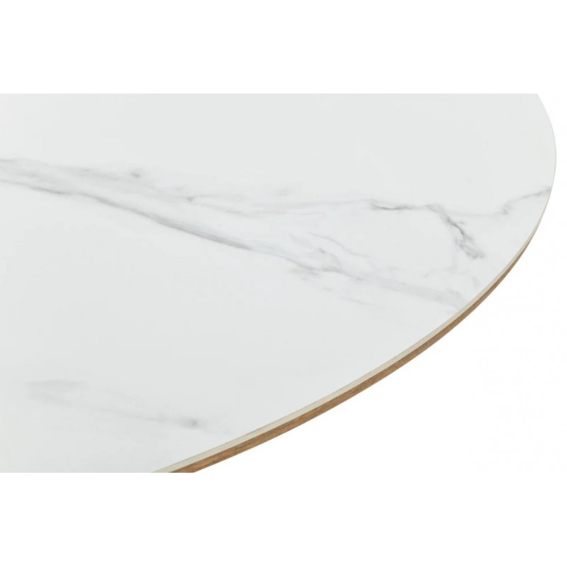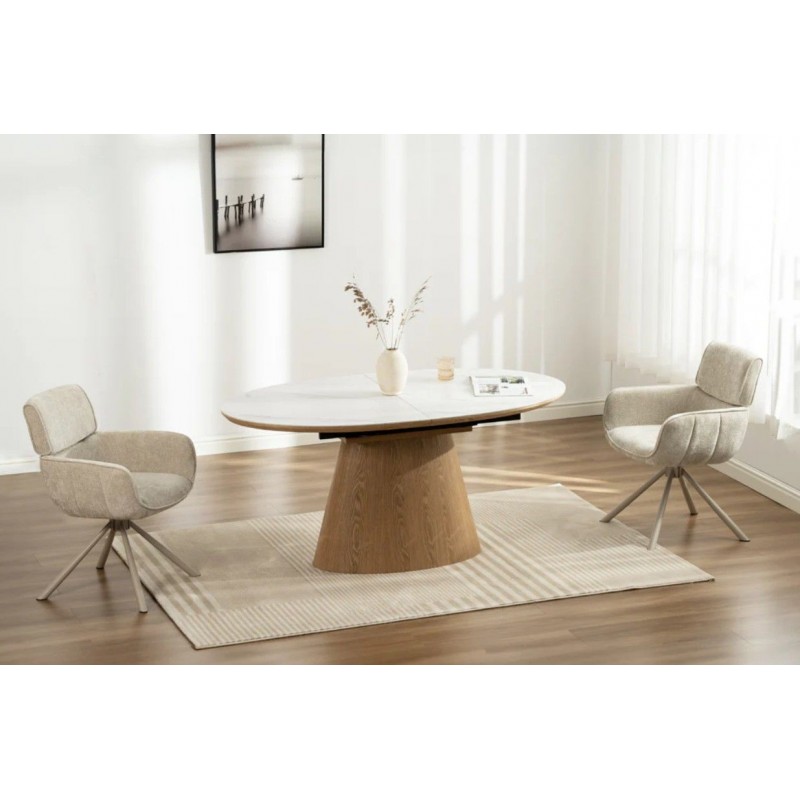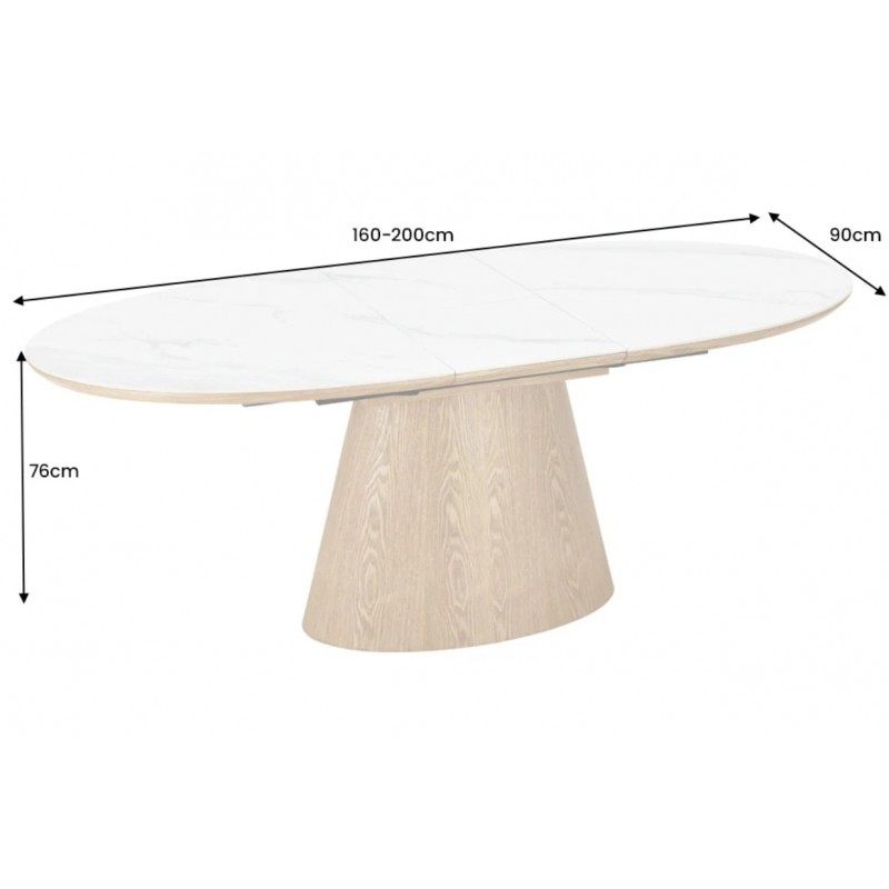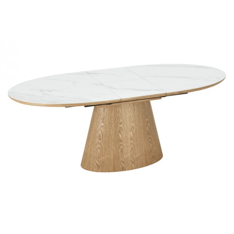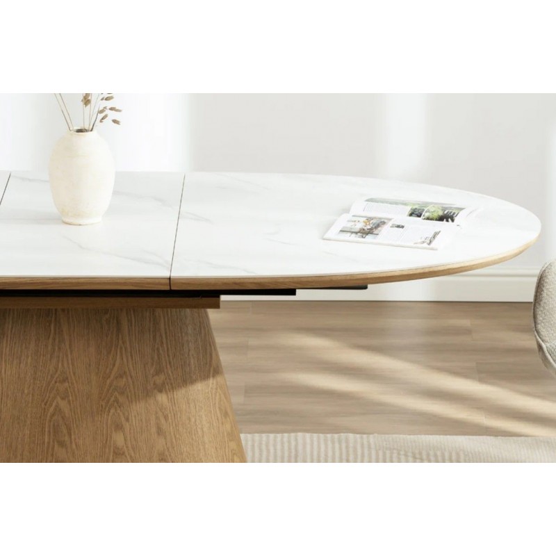 Ten robiący ogromne wrażenie owalny rozkładany stół UNIQUE, to idealne rozwiązanie do każdego salonu czy jadalni w stylu nowoczesnym, który dodaje przestrzeni niesamowitego stylu oraz klasy. Duży praktyczny blat wykonano z ceramiki, wyróżniającej się między innymi swoją wyrazistością poprzez zastosowanie na niej dekoracji w formie imitacji białego marmuru, którego elegancką kolorystykę dopełniają charakterystyczne barwienia oraz nitki w szarych kolorach. Został on w całości osadzony na solidnej stożkowej podstawie z płyty MDF z dekorem drewnianym imitującym drewno dębowe w kolorze naturalnym. Dzięki funkcji rozkładania, jego powierzchnię można w łatwy i szybki sposób powiększyć przy pomocy praktycznej przedłużki, dostosowując wielkość stołu do liczby gości lub aktualnych potrzeb. Bez wątpienia wyróżnia się swoją wyrazistością poprzez zachowanie na nim oryginalnych słoi, sęków oraz naturalności drzewa co sprawia, że wygląda zjawiskowo, nadając każdemu wnętrzu oryginalnego charakteru elegancji i nowoczesności. Ogromną zaletą jest nie tyle funkcjonalność jak również duża wytrzymałość oraz łatwość czyszczenia, która wyróżniają się swoją naturalnością, kolorem oraz strukturą sprawiając przy tym, że każdy egzemplarz stołu jest unikatowy. Efekt końcowy połączenia białego blatu oraz podstawy w kolorze dębu jest fenomenalny, co sprawia, że idealnie odnajdzie się w stylu nowoczesnym gdzie stanie się nie tylko funkcjonalnym meblem, ale także przepiękną dekoracją, która doda wnętrzu unikatowego wykończenia i niesamowitego wyglądu.