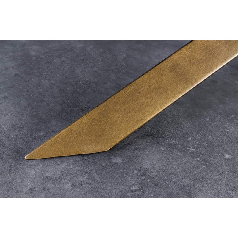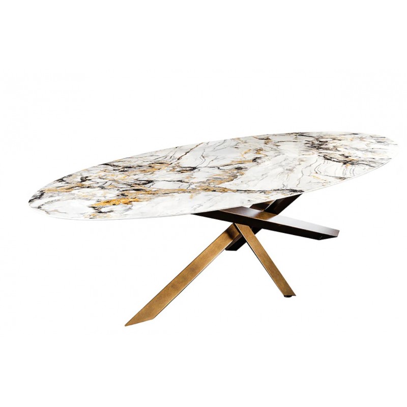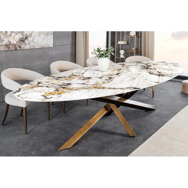 Stół SCULPTURE to doskonały wybór do przestronnych, nowoczesnych wnętrz, zarówno jako stół do jadalni, jak i salonu urządzonego w stylu nowoczesnym. Dzięki swojej okazałej formie wnosi do pomieszczenia wyrazisty charakter i wyjątkową elegancję. Najbardziej przyciągającym wzrok elementem stołu jest blat o grubości 1,3 cm, wykonany z ceramiki. Wyróżnia się on między innymi swoją wyrazistością poprzez zastosowanie w nim dekoracji w formie imitacji kamienia naturalnego, którego elegancką kolorystykę dopełniają charakterystyczne odcienie szarości, czerni, beżu oraz brązu, które nadają meblowi luksusowego wyglądu i unikalnego stylu. Stół osadzono na solidnej, geometrycznej podstawie w kształcie pająka, wykonanej z metalu w kolorze szczotkowanego złota. Taka konstrukcja nie tylko zapewnia stabilność, ale też ułatwia swobodne ustawienie krzeseł, co znacznie wpływa na komfort jego użytkowania. Efektowne połączenie ceramicznego blatu ze złotą podstawą tworzy harmonijną i elegancką całość, doskonale wpisującą się w aranżacje salonów i jadalni w stylu glamour oraz nowoczesnym, stając się tym samym ich centralnym punktem oraz główną dekoracją.