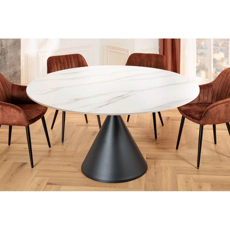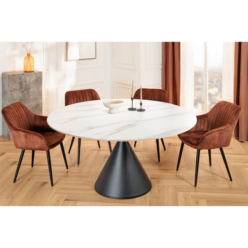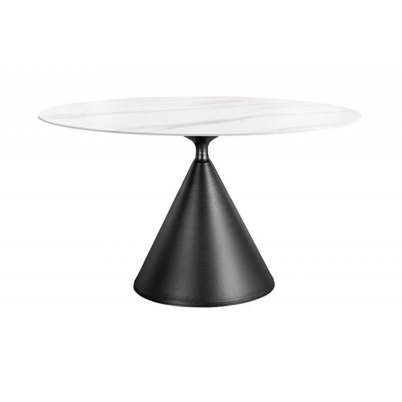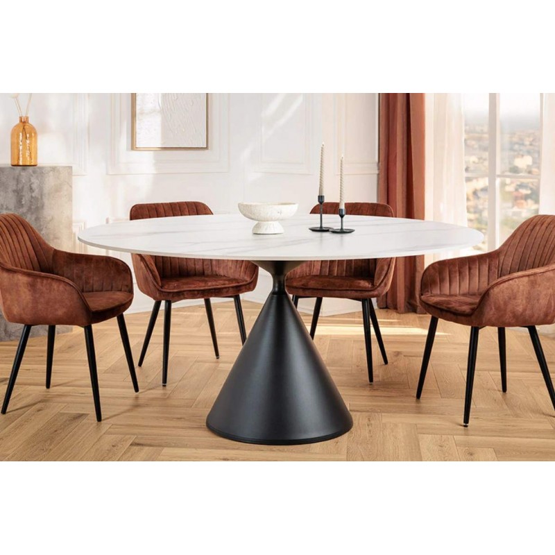 Stół SIGNATURE znakomicie sprawdzi się w przestronnych pomieszczeniach jako stół do jadalni i salonu urządzonych w stylu nowoczesnym, gdzie dzięki swojej wyjątkowej formie doda wnętrzu charakteru oraz niesamowitej elegancji. Duży okrągły blat o grubości 1 cm został wykonany z ceramiki, wyróżniającej się między innymi swoją wyrazistością poprzez zastosowanie na niej dekoracji w formie imitacji białego marmuru, którego elegancką kolorystykę dopełniają charakterystyczne barwienia oraz nitki w szarych kolorach. Mebel ten został osadzony na solidnej czarnej metalowej podstawie o geometrycznym kształcie, dzięki któremu ułożenie krzeseł podczas jego użytkowania nie stanowi problemu. Zaletą tego stołu jest funkcjonalność, wytrzymałość oraz łatwość czyszczenia, dzięki czemu wyróżnia się swoją wyrazistością, kolorem i strukturą powodując, że każdy egzemplarz jest unikatowy. Efekt końcowy połączenia białego blatu oraz podstawy utrzymanej w ciemnej tonacji jest fenomenalny, co sprawia, że idealnie odnajdzie się w stylu nowoczesnym gdzie stanie się nie tylko funkcjonalnym meblem, ale także przepiękną dekoracją, która doda wnętrzu unikatowego wykończenia i niesamowitego wyglądu.