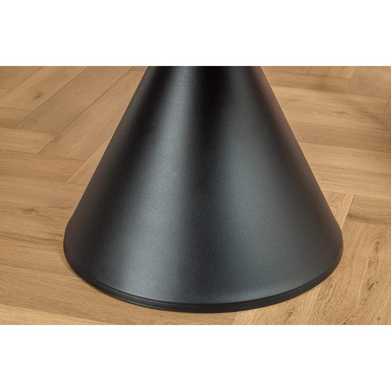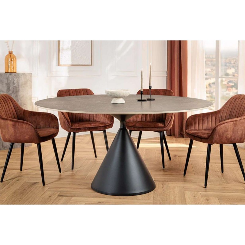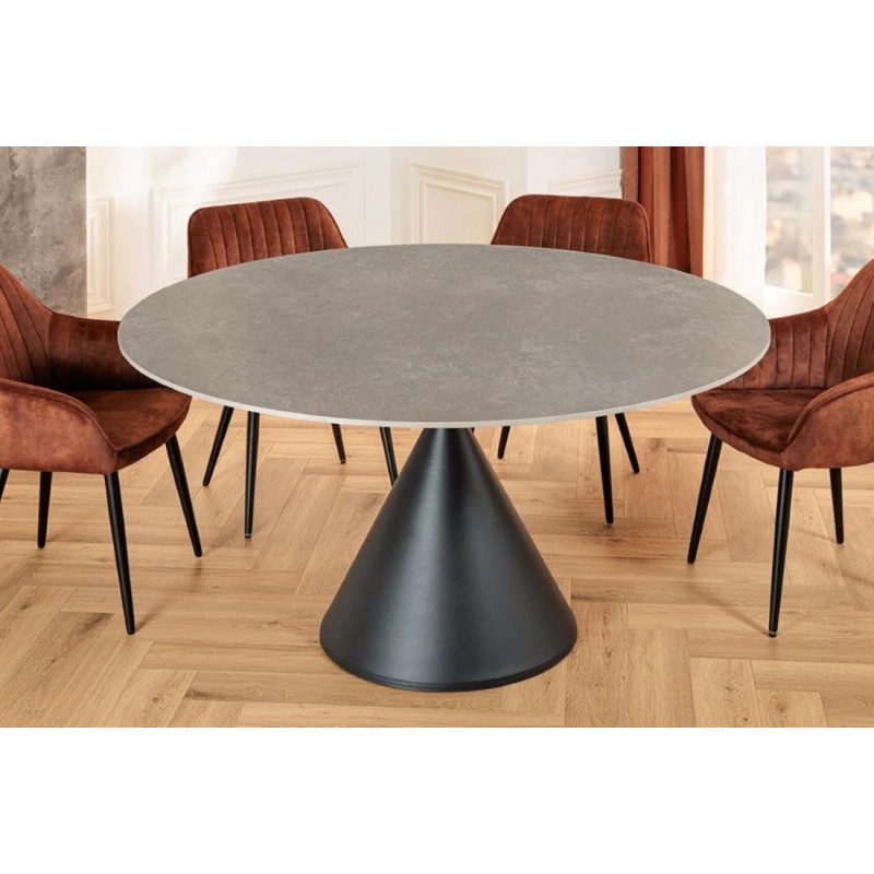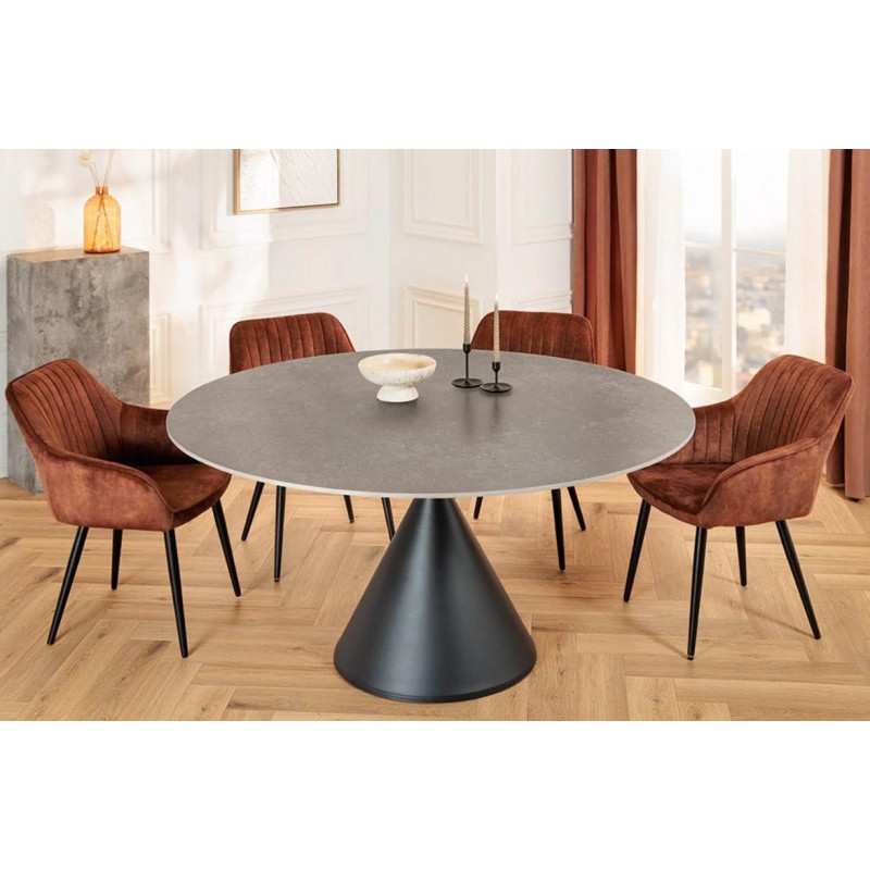 Stół SIGNATURE znakomicie sprawdzi się w przestronnych pomieszczeniach jako stół do jadalni i salonu urządzonych w stylu nowoczesnym, gdzie dzięki swojej wyjątkowej formie doda wnętrzu charakteru oraz niesamowitej elegancji. Duży okrągły blat o grubości 1 cm został wykonany z ceramiki, wyróżniającej się między innymi swoją wyrazistością poprzez zastosowanie na niej dekoracji w formie imitacji szarego marmuru, którego elegancką kolorystykę dopełniają charakterystyczne barwienia oraz nitki w jaśniejszych kolorach szarości. Mebel ten został osadzony na solidnej czarnej metalowej podstawie o geometrycznym kształcie, dzięki któremu ułożenie krzeseł podczas jego użytkowania nie stanowi problemu. Zaletą tego stołu jest funkcjonalność, wytrzymałość oraz łatwość czyszczenia, dzięki czemu wyróżnia się swoją wyrazistością, kolorem i strukturą powodując, że każdy egzemplarz jest unikatowy. Efekt końcowy połączenia szarego blatu oraz podstawy utrzymanej w ciemnej tonacji jest fenomenalny, co sprawia, że idealnie odnajdzie się w stylu nowoczesnym gdzie stanie się nie tylko funkcjonalnym meblem, ale także przepiękną dekoracją, która doda wnętrzu unikatowego wykończenia i niesamowitego wyglądu.