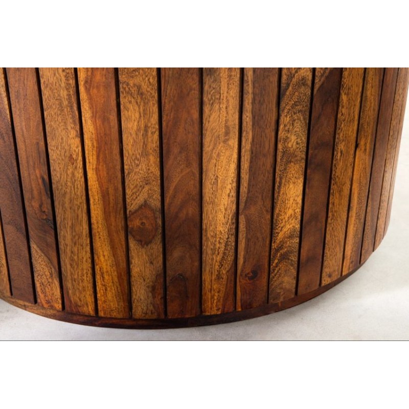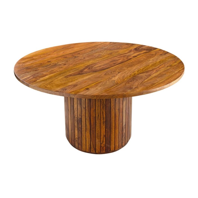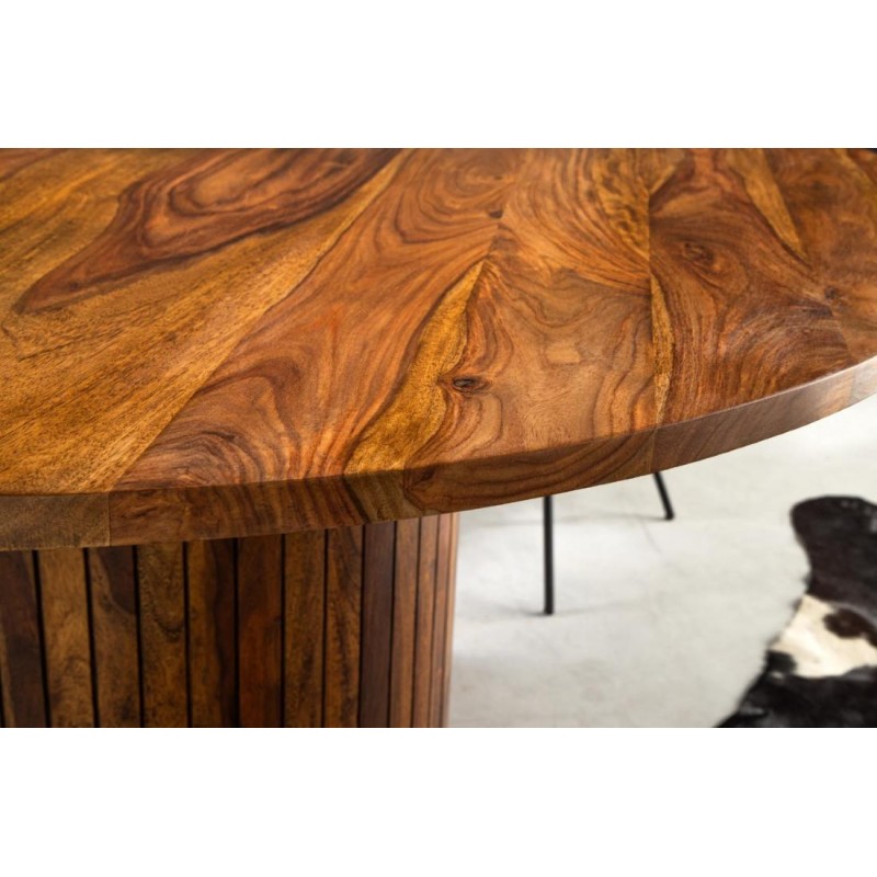 Stół TRES CHIC to wyjątkowe połączenie nowoczesnego designu z naturalną elegancją. Dzięki swojej nietuzinkowej formie i starannemu wykonaniu doskonale odnajdzie się w stylowych salonach i jadalniach, wprowadzając do wnętrza niepowtarzalny klimat. Blat stołu zaprojektowano niewątpliwie z dużą precyzją uwydatniając jego niezwykłą naturalność. Został wykonany ręcznie z litego drewna palisandru indyjskiego w odcieniu brązowym, na którym została zachowana oryginalna naturalna struktura drewna, przez co prezentuje się zjawiskowo. Osadzony został na solidnej, okrągłej podstawie, złożonej z pionowych listewek o dekoracyjnym charakterze, które wzorem przypominają lamele. Każdy stół to unikat, którego widoczne słoje i sęki w drewnie podkreślają naturalne piękno materiału, a ręczne wykonanie zapewnia najwyższą jakość i trwałość. TRES CHIC nie tylko zachwyca wyglądem, ale jest też nie tylko praktyczny, ale również łatwy w utrzymaniu czystości, stabilny i wytrzymały. To mebel, który łączy funkcję użytkową z dekoracyjną, dzięki czemu stanie się centralnym punktem Twojego wnętrza i jego niekwestionowaną ozdobą.