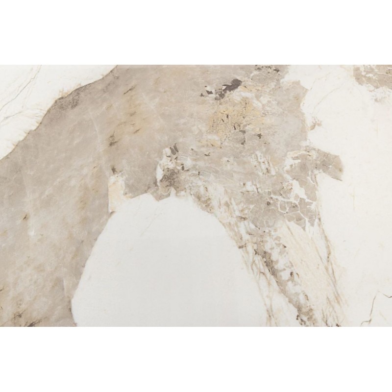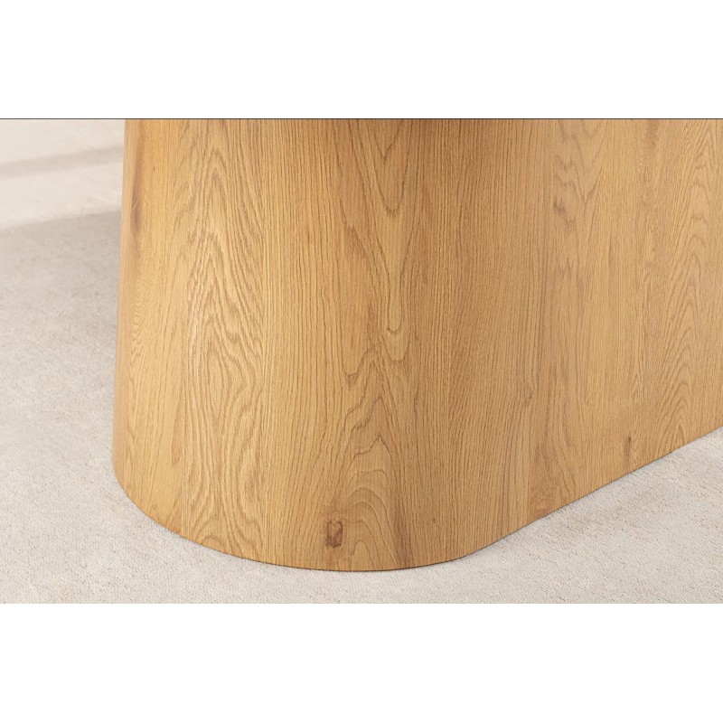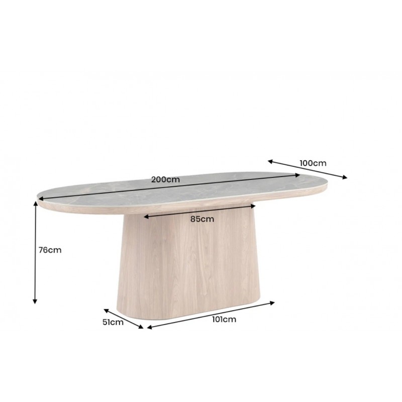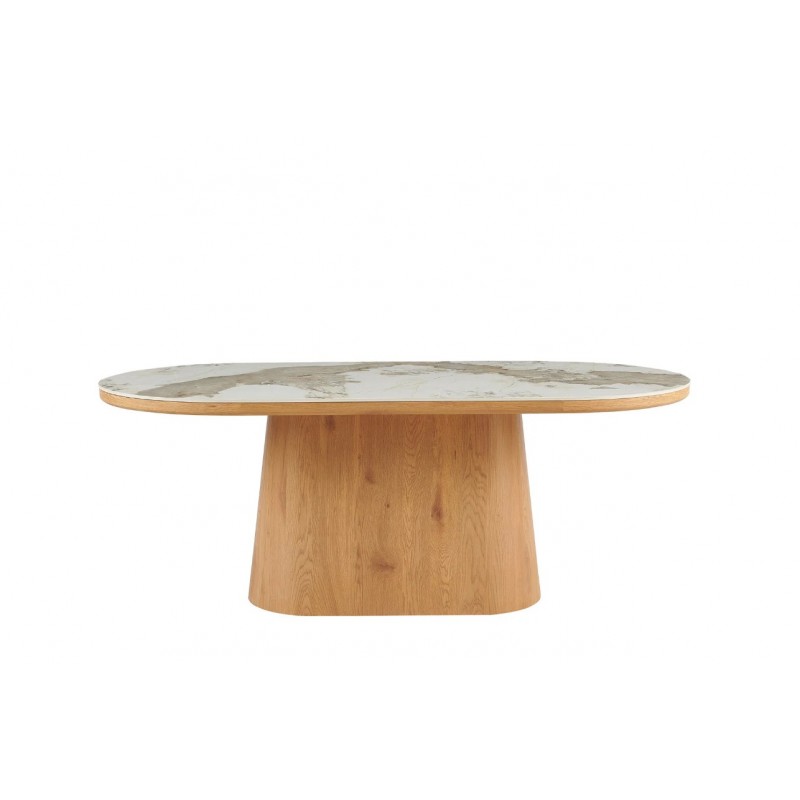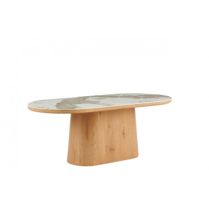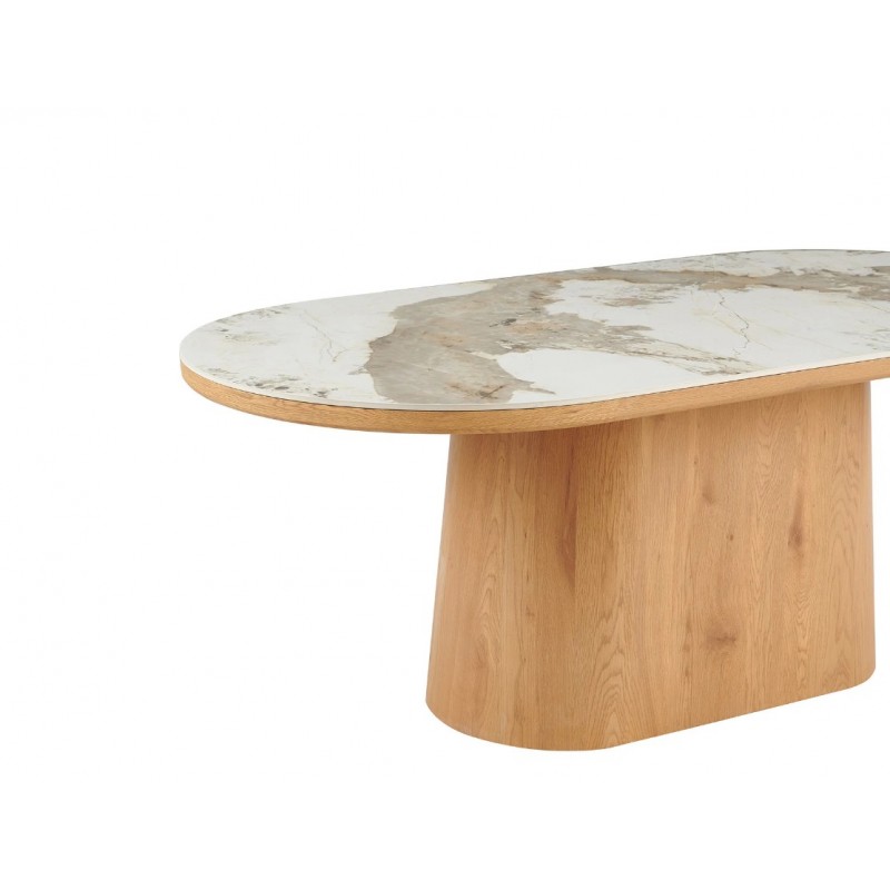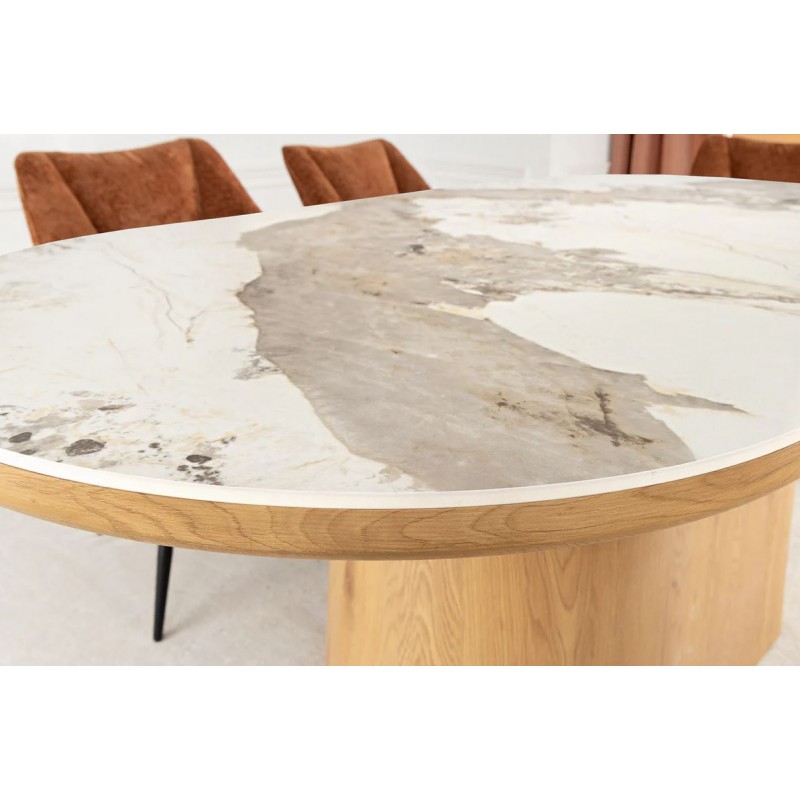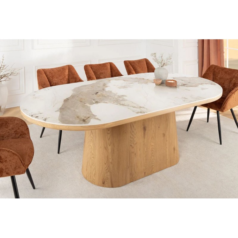 Stół UNIQUE znakomicie sprawdzi się w przestronnych pomieszczeniach jako stół do jadalni oraz salonu urządzonego w stylu nowoczesnym, gdzie dzięki swojej wyjątkowej formie doda wnętrzu charakteru oraz niesamowitej elegancji. Duży praktyczny owalny blat o grubości 5 cm wykonano z ceramiki, wyróżniającej się między innymi swoją wyrazistością poprzez zastosowanie na niej dekoracji w formie imitacji białego marmuru, którego elegancką kolorystykę dopełniają charakterystyczne barwienia oraz nitki w szarych kolorach. Mebel ten został osadzony na solidnej podstawie wykonanej z płyty MDF pokrytej dekorem drewnianym, na którym uwydatniona została naturalna struktura drewna z widocznymi słojami i sękami, a jego praktyczny geometryczny kształt sprawia, że ułożenie krzeseł podczas jego użytkowania nie stanowi problemu. Bez wątpienia zaletą tego stołu jest funkcjonalność, wytrzymałość oraz łatwość czyszczenia, dzięki czemu wyróżnia się swoją wyrazistością, kolorem i strukturą powodując, że każdy egzemplarz jest unikatowy. Efekt końcowy połączenia białego blatu oraz podstawy w kolorze naturalnego drewna jest fenomenalny, co sprawia, że idealnie odnajdzie się w stylu nowoczesnym gdzie stanie się nie tylko funkcjonalnym meblem, ale także przepiękną dekoracją, która doda wnętrzu unikatowego wykończenia i niesamowitego wyglądu.