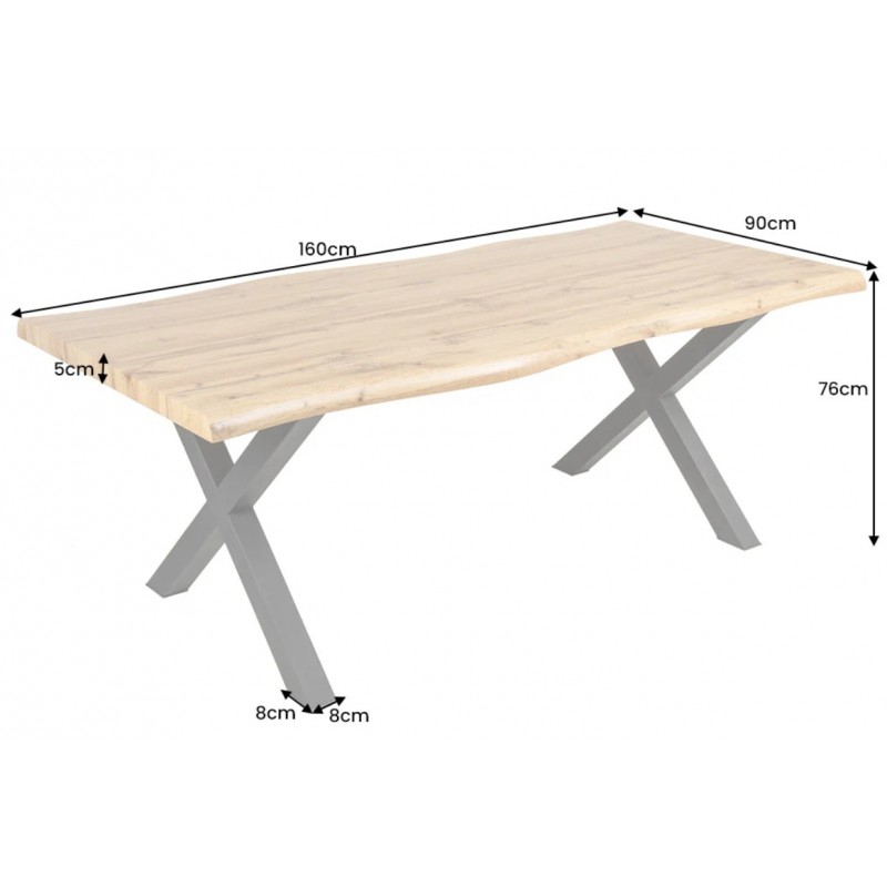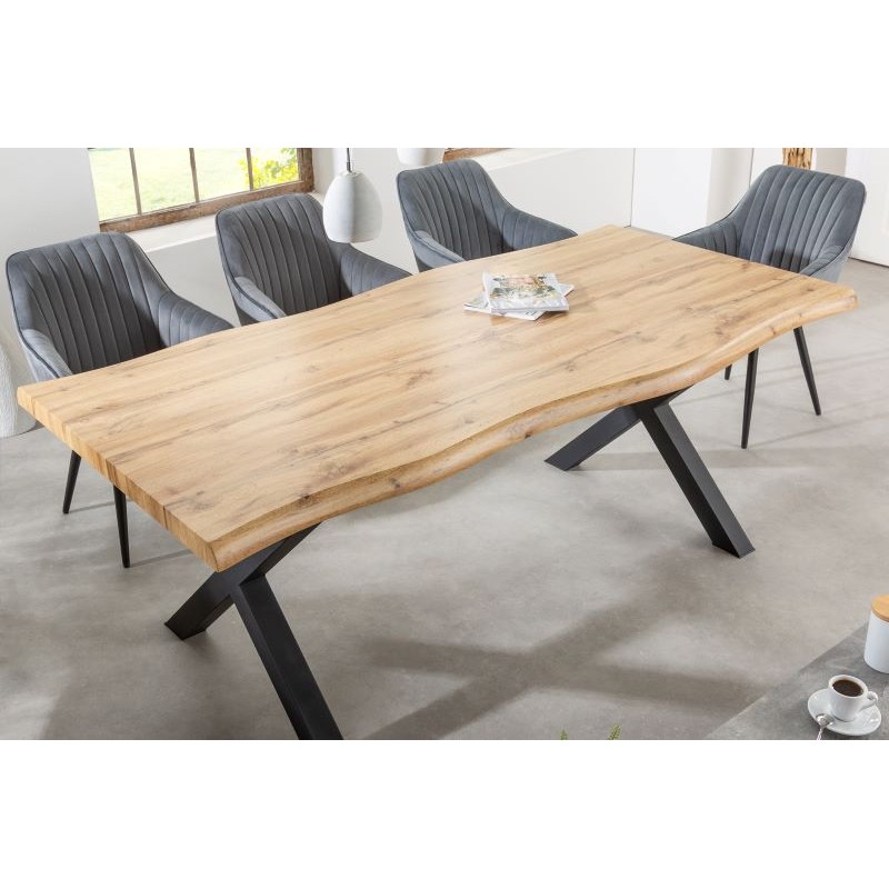 Stół WILD to idealne rozwiązanie do każdego przestronnego pomieszczenia urządzonego zarówno w stylu industrialnym jak i rustykalnym, gdzie dzięki swojej barwie doda oryginalnego wykończenia. Blat stołu o grubości 5cm zaprojektowano niewątpliwie z dużą precyzją uwydatniając jego niezwykłą naturalność. Został wykonany z płyty MDF, która dla nadania wyrazistości tego stołu została oklejona w taki sposób, aby zachować autentyczność wyglądu dzikiego dębu. Mebel ten dzięki odwzorcowaniu oryginalności słojów, sęków oraz naturalnej krawędzi drzewa prezentuje się zjawiskowo. Blat mebla osadzono na stabilnej czarnej metalowej podstawie w kształcie litery X, która zapewnia mu solidną konstrukcję dodając tym samym surowego wykończenia. Efekt końcowy połączenia wyglądu drewna oraz czarnej metalowej podstawy jest fenomenalny dzięki czemu idealnie sprawdzi się zarówno w salonach w stylu industrialnym jak i nowoczesnym. Stół ten odnajdzie się znakomicie w każdej przestronnej jadalni oraz salonie gdzie bez wątpienia stanie się nie tylko funkcjonalnym meblem, ale także przepiękną dekoracją dodającą wnętrzu niesamowitego oryginalnego wyglądu.