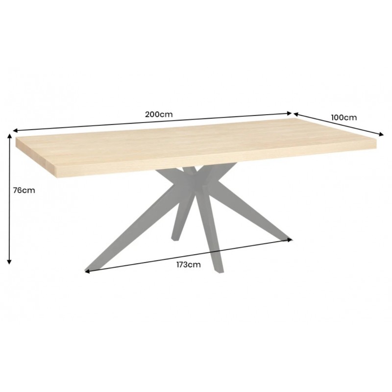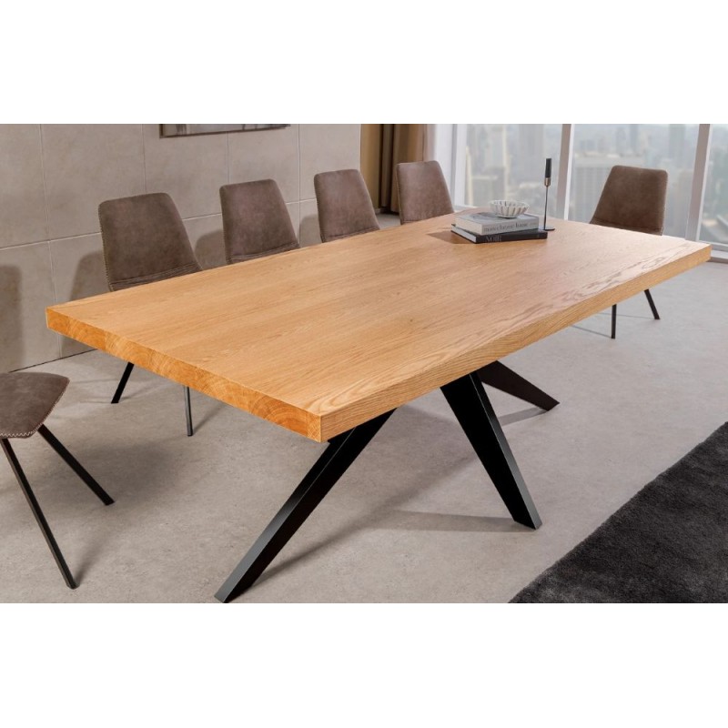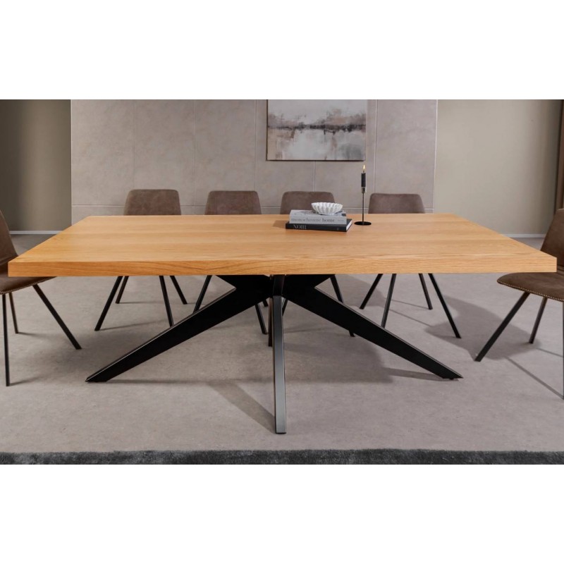 Stół ZEUS to idealne rozwiązanie do każdego przestronnego pomieszczenia urządzonego zarówno w stylu industrialnym jak i rustykalnym, gdzie dzięki swojej barwie doda naturalnego wykończenia. Blat stołu zaprojektowano niewątpliwie z dużą precyzją uwydatniając jego niezwykłą naturalność. Szeroki, prostokątny blat o grubości 60 mm, wykonany został z płyty MDF z dekorem imitującym naturalny dąb, który urzeka swoją strukturą, a widoczne słoje i sęki nadają mu autentyczny charakter. Osadzono go na czarnej efektownej, metalowej podstawie w formie pająka, która nie tylko zapewnia stabilność, ale również pozwala na swobodne ustawienie krzeseł wokół stołu. Efekt końcowy połączenia drewna oraz czarnej metalowej podstawy jest fenomenalny dzięki czemu idealnie sprawdzi się zarówno w salonach w stylu industrialnym jak i nowoczesnym. Stół ten odnajdzie się znakomicie w każdej przestronnej jadalni oraz salonie gdzie bez wątpienia stanie się nie tylko funkcjonalnym meblem, ale także przepiękną dekoracją dodającą wnętrzu niesamowitego oryginalnego wyglądu.