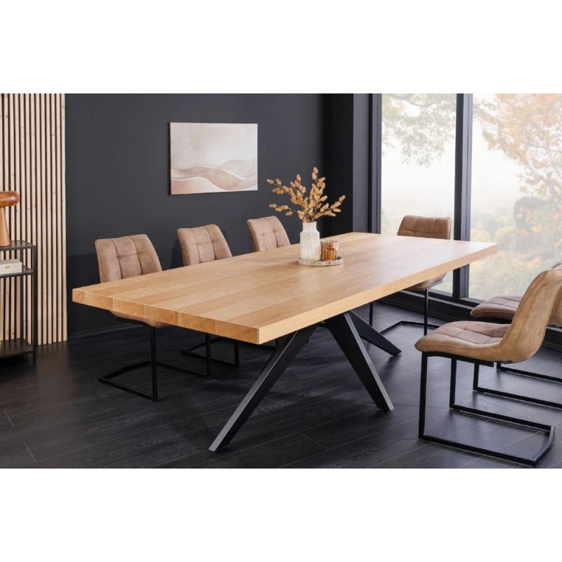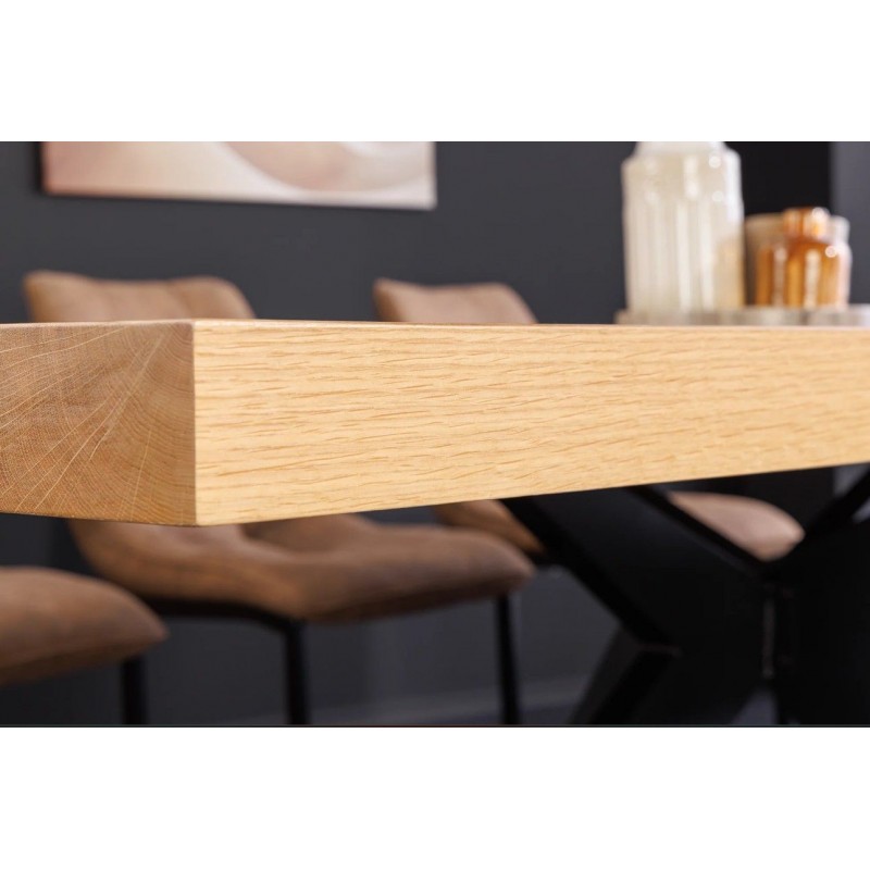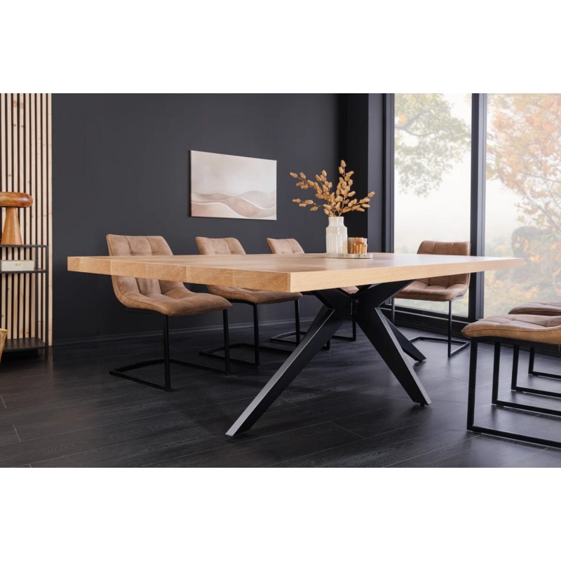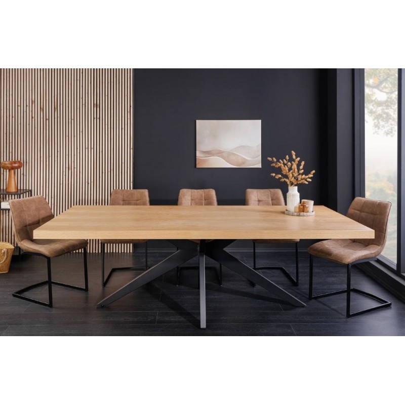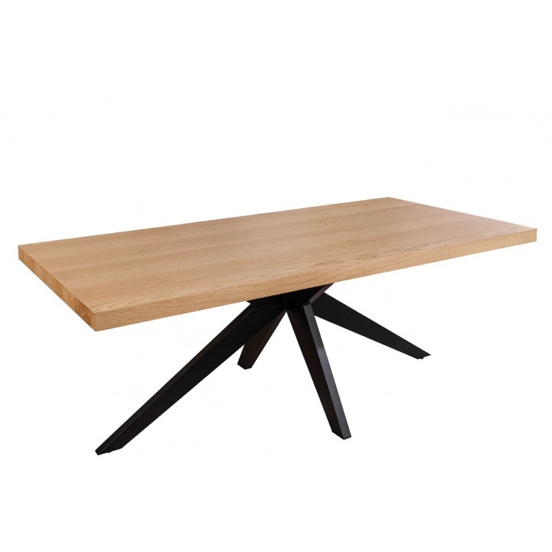 Stół ZEUS to idealne rozwiązanie do każdego przestronnego pomieszczenia urządzonego zarówno w stylu industrialnym jak i rustykalnym, gdzie dzięki swojej barwie doda naturalnego wykończenia. Blat stołu zaprojektowano niewątpliwie z dużą precyzją uwydatniając jego niezwykłą naturalność. Szeroki, prostokątny blat o grubości 60 mm, wykonany został z płyty MDF z dekorem imitującym naturalny dąb, który urzeka swoją strukturą, a widoczne słoje i sęki nadają mu autentyczny charakter. Osadzono go na czarnej efektownej, metalowej podstawie w formie pająka, która nie tylko zapewnia stabilność, ale również pozwala na swobodne ustawienie krzeseł wokół stołu. Efekt końcowy połączenia drewna oraz czarnej metalowej podstawy jest fenomenalny dzięki czemu idealnie sprawdzi się zarówno w salonach w stylu industrialnym jak i nowoczesnym. Stół ten odnajdzie się znakomicie w każdej przestronnej jadalni oraz salonie gdzie bez wątpienia stanie się nie tylko funkcjonalnym meblem, ale także przepiękną dekoracją dodającą wnętrzu niesamowitego oryginalnego wyglądu.