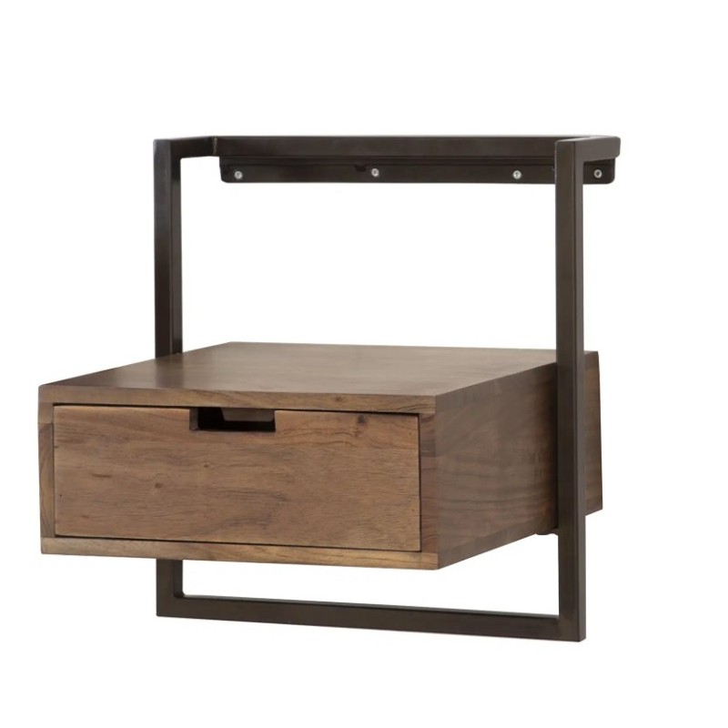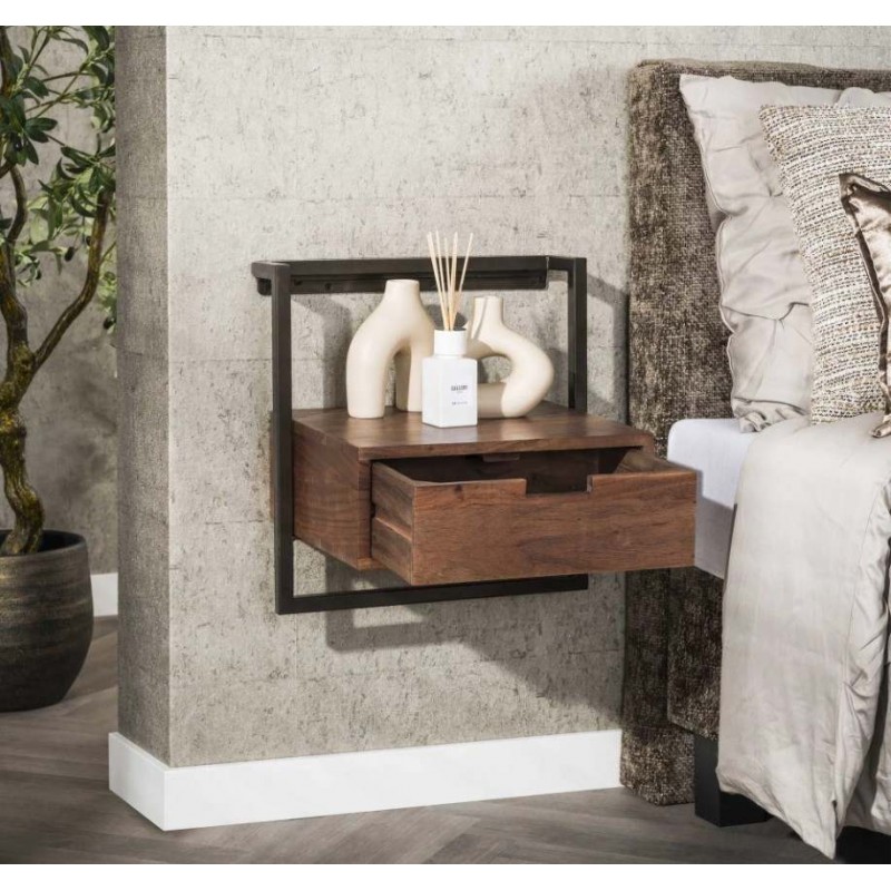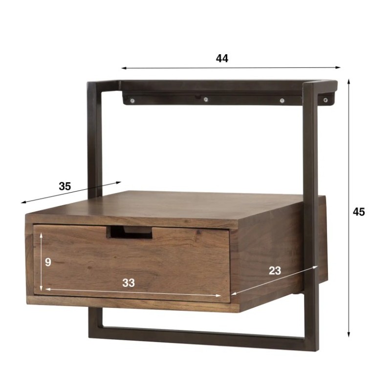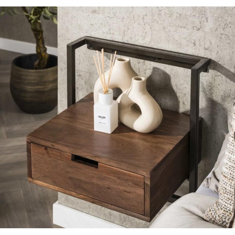 Szafka nocna ALICE to idealny mebel, który dzięki swojej formie został zaprojektowany w minimalistycznym nowoczesnym stylu. Korpus mebla stanowi lite drewno akacjowe, które osadzono na stabilnej metalowej konstrukcji w ciemnym kolorze. Szafka ta jest wykonana z dużą precyzją oraz została pokryta matowym lakierem w kolorze brązowym, który dzięki zachowaniu oryginalnej struktury drewna w postaci sęków i słojów uwydatnia jej naturalność. Jej niewielkie wymiary sprawiają, że z łatwością dostosujesz ją do swoich potrzeb wieszając na dowolnej wysokości obok łóżka. Stelaż szafki mocuje się z łatwością do ściany za pomocą listwy z trzema otworami na śruby. Pojemna szafka zapewni odpowiednie miejsce przechowywania i bez problemu pomieści najpotrzebniejsze przedmioty codziennego użytku. Szafka nocna ALICE to idealne rozwiązanie dla mniejszych sypialni urządzonych w stylu industrialnym czy nowoczesnym, nadając wnętrzu oryginalnego charakteru elegancji i nowoczesności.