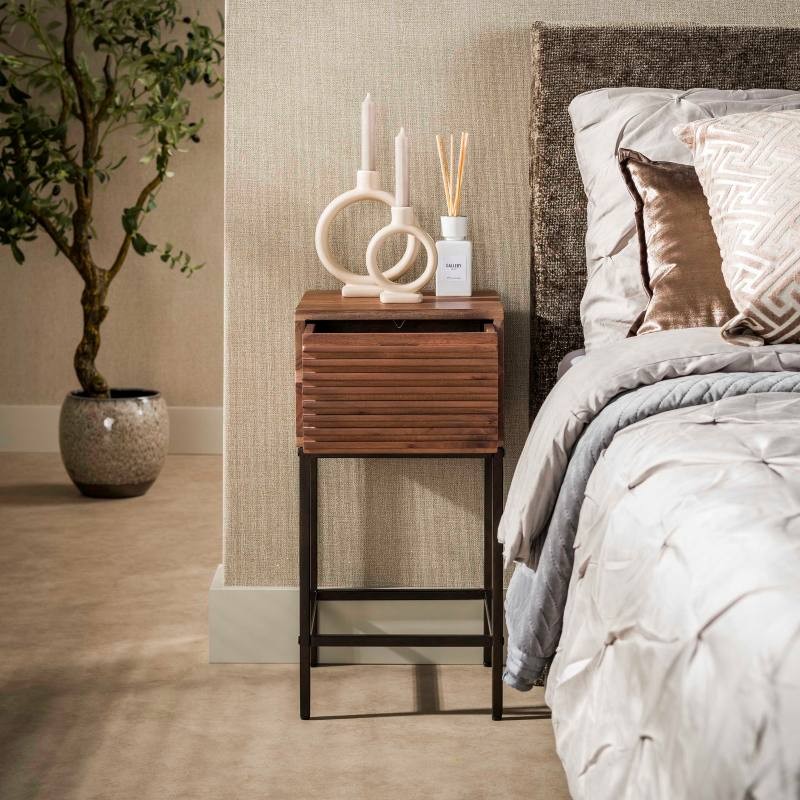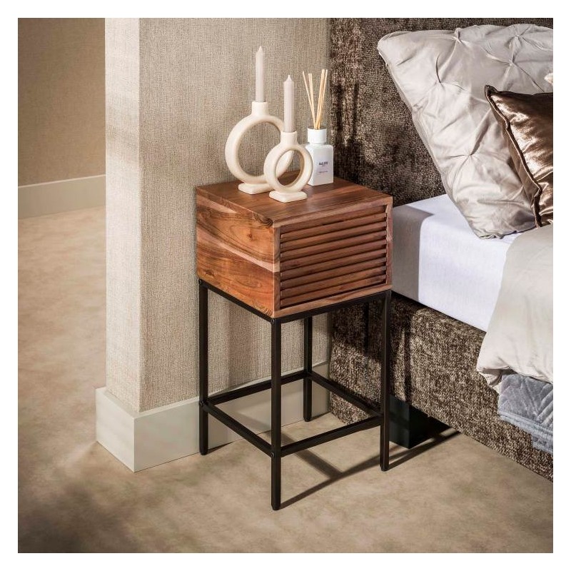 Szafka nocna ARNO to idealne i praktyczne rozwiązane stworzone z myślą zarówno o małych jak i przestrzennych wnętrzach w którym dzięki swojej formie oraz barwie doda wyjątkowego charakteru i stylu. Wykonano ją z litego drewna akacjowego w brązowym odcieniu, a zachowana naturalna struktura drewna w postaci sęków i słojów doskonale uwydatnia naturalność mebla. Osadzona została na stabilnej metalowej podstawie w brązowym odcieniu, której nietuzinkowy wygląd nadają charakterystyczne poziome reliefowe listwy zastosowane na froncie mebla. Pojemna szuflada bez problemu zapewni odpowiednie miejsce do przechowywania i pomieści najpotrzebniejsze przedmioty codziennego użytku, łatwo ją otworzyć dzięki wpuszczanemu uchwytowi. Została zaprojektowana głównie z myślą o praktyczności i organizacji przestrzeni, a swoją elegancją, stylem oraz wyrazistością doskonale wzbogacą każdą sypialnię urządzoną w stylu nowoczesnym, dodając jej tym samym ciepła oraz naturalnego wykończenia.