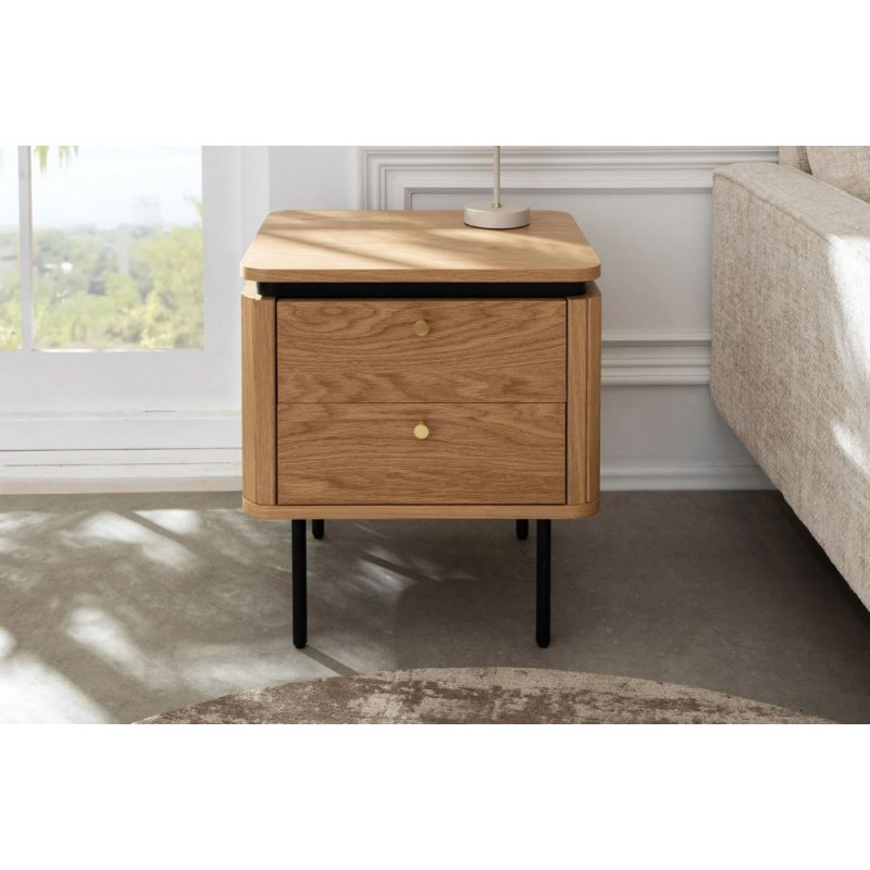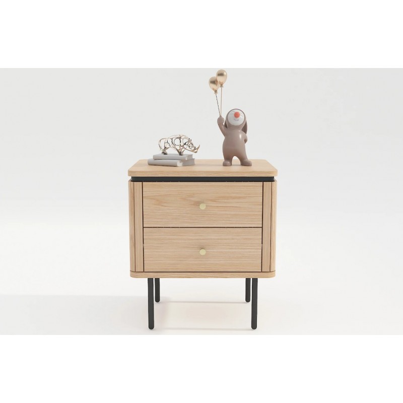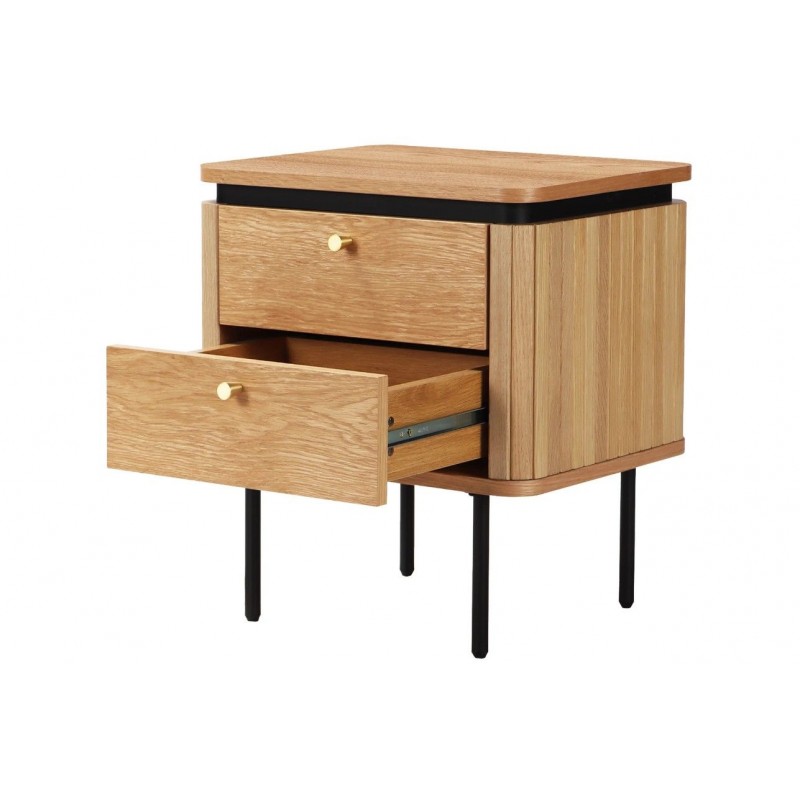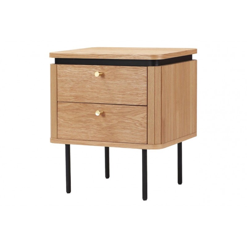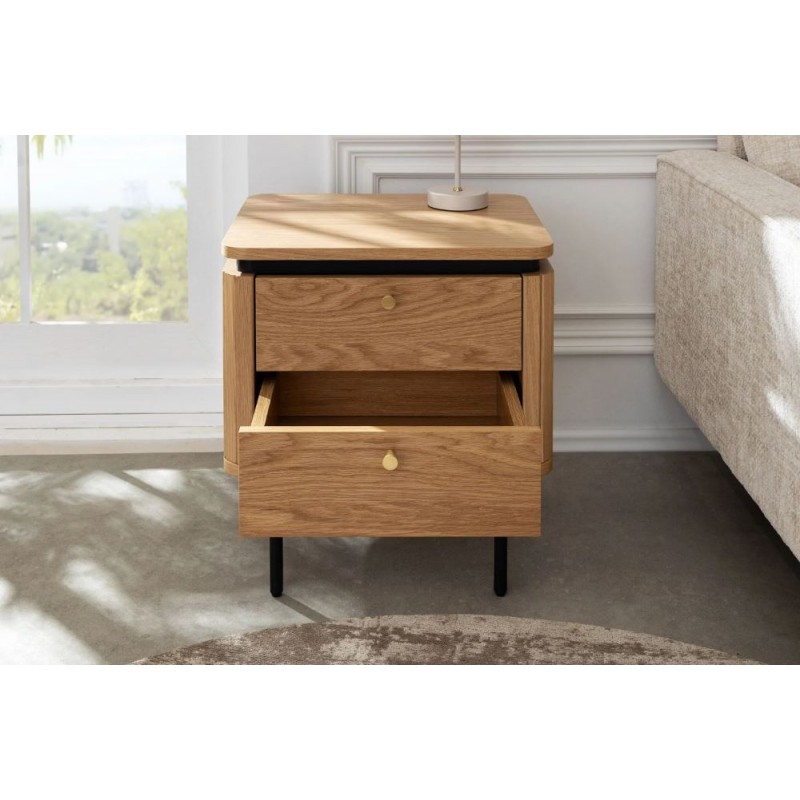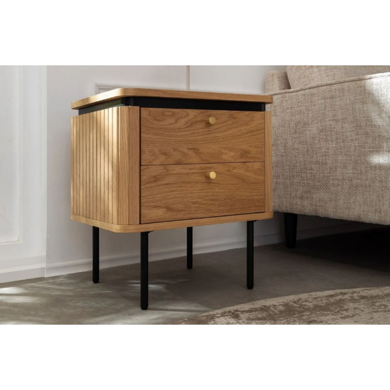 Szafka nocna ATELIER dzięki swojej minimalistycznej formie to najlepsze rozwiązanie oraz idealne dopełnienie wyposażenia sypialni w stylu nowoczesnym. Ten niezwykle funkcjonalny mebel składa się z dwóch pojemnych szuflad, które są w stanie pomieścić najpotrzebniejsze rzeczy codziennego użytku. Wykonana została z płyty MDF oklejonej imitacją dębu oraz osadzona na stabilnej czarnej metalowej podstawie. Dzięki swojej smukłej linii całość wspaniale komponuje się z podstawą utrzymaną w ciemnej tonacji. Fronty lamelowe w imitacji dębu ze strukturą drewna nadają jej cennego i naturalnego wyrazu. Ponadto wykonana jest niewątpliwie z dużą precyzją, dzięki zachowaniu i odwzorcowaniu naturalnej oryginalności zarówno słojów jak i sęków. ATELIER to kolekcja mebli stworzona z myślą o najbardziej wymagających użytkownikach, ceniących najwyższą jakość wykonania w połączeniu z wyrafinowanym stylem oraz estetyką, doskonale wzbogaci każde wnętrze sypialni, nadając jej oryginalnego charakteru w stylu nowoczesnym.