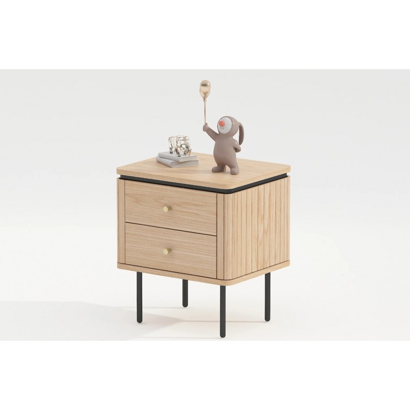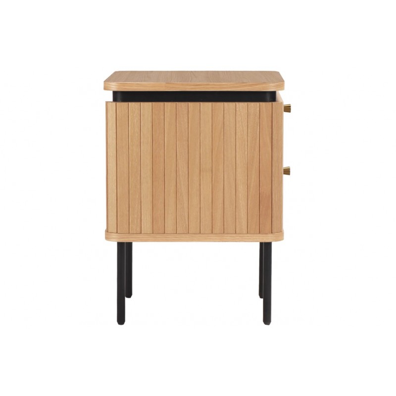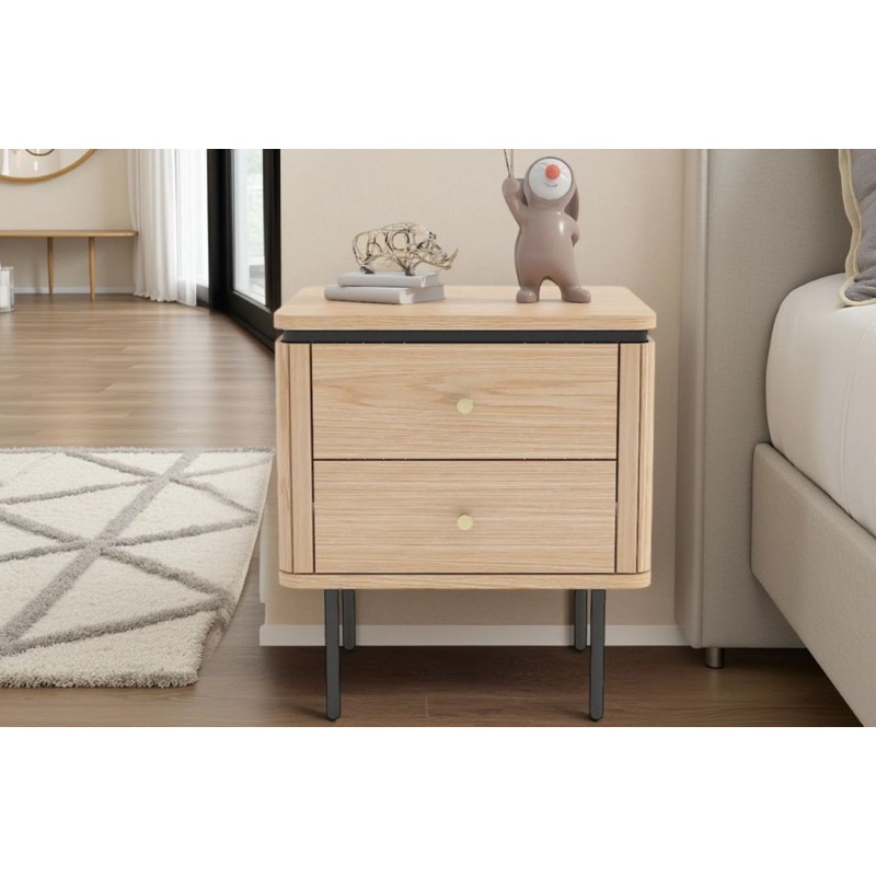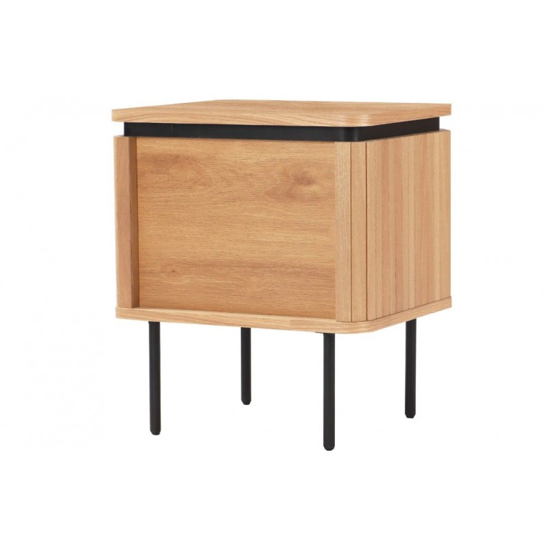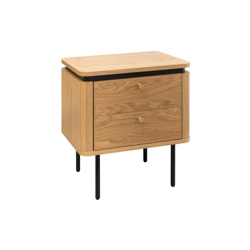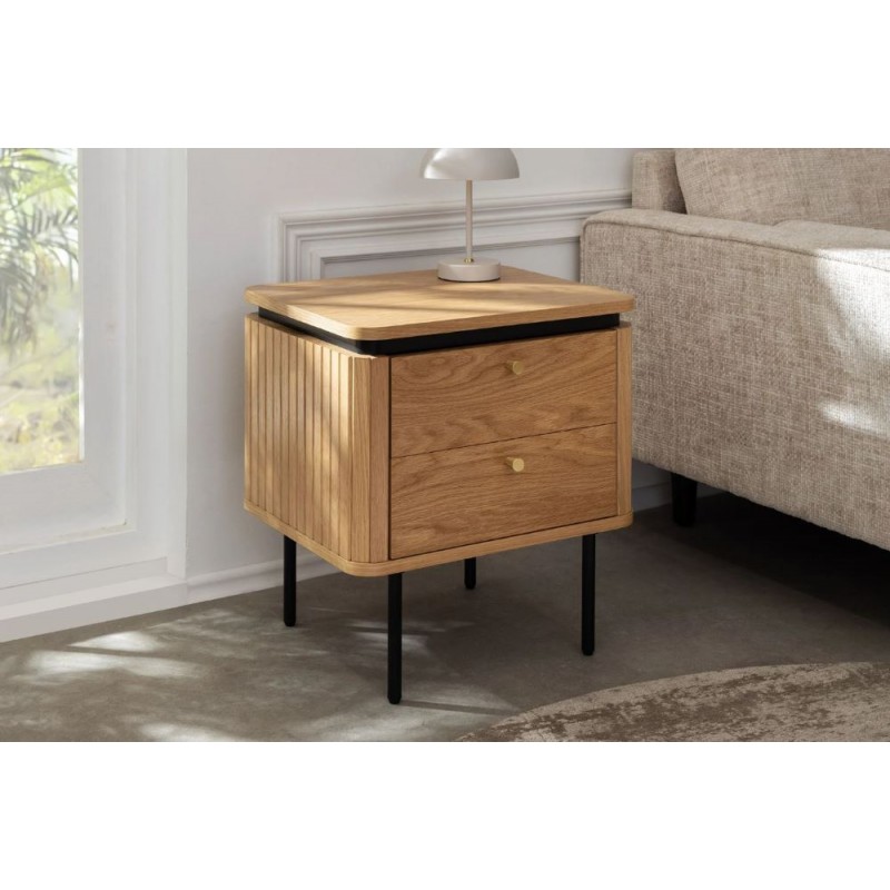 Szafka nocna ATELIER dzięki swojej minimalistycznej formie to najlepsze rozwiązanie oraz idealne dopełnienie wyposażenia sypialni w stylu nowoczesnym. Ten niezwykle funkcjonalny mebel składa się z dwóch pojemnych szuflad, które są w stanie pomieścić najpotrzebniejsze rzeczy codziennego użytku. Wykonana została z płyty MDF oklejonej imitacją dębu oraz osadzona na stabilnej czarnej metalowej podstawie. Dzięki swojej smukłej linii całość wspaniale komponuje się z podstawą utrzymaną w ciemnej tonacji. Fronty lamelowe w imitacji dębu ze strukturą drewna nadają jej cennego i naturalnego wyrazu. Ponadto wykonana jest niewątpliwie z dużą precyzją, dzięki zachowaniu i odwzorcowaniu naturalnej oryginalności zarówno słojów jak i sęków. ATELIER to kolekcja mebli stworzona z myślą o najbardziej wymagających użytkownikach, ceniących najwyższą jakość wykonania w połączeniu z wyrafinowanym stylem oraz estetyką, doskonale wzbogaci każde wnętrze sypialni, nadając jej oryginalnego charakteru w stylu nowoczesnym.