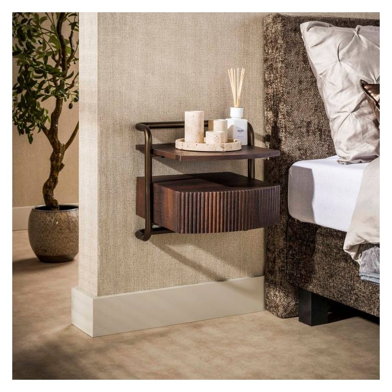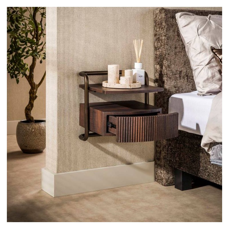 Szafka nocna DAMLA to doskonały wybór dla osób ceniących minimalistyczny, nowoczesny design oraz funkcjonalne rozwiązania. Jej prosta, elegancka forma została osadzona na stabilnej metalowej konstrukcji w brązowym kolorze, która nadaje całości wyjątkowego charakteru i podkreśla industrialny styl. Mebel wykonano z płyty MDF pokrytej dekorem inspirowanym dumionym brązowym dębem na którym zachowano oryginalną strukturę drewna w postaci sęków i słojów dodających jej naturalności. Półokrągły, przestronny blat oraz pojemna szafka zapewniają wygodne miejsce do przechowywania najpotrzebniejszych przedmiotów codziennego użytku. Dzięki niewielkim wymiarom szafka ta świetnie sprawdzi się w mniejszych sypialniach, a możliwość montażu na dowolnej wysokości obok łóżka pozwala łatwo dopasować ją do indywidualnych potrzeb jednocześnie zaoszczędzając przestrzeń na podłodze. Szafka nocna DAMLA idealnie dopełni sypialnię w stylu industrialnym lub nowoczesnym, nadając wnętrzu niepowtarzalny i stylowy charakter.