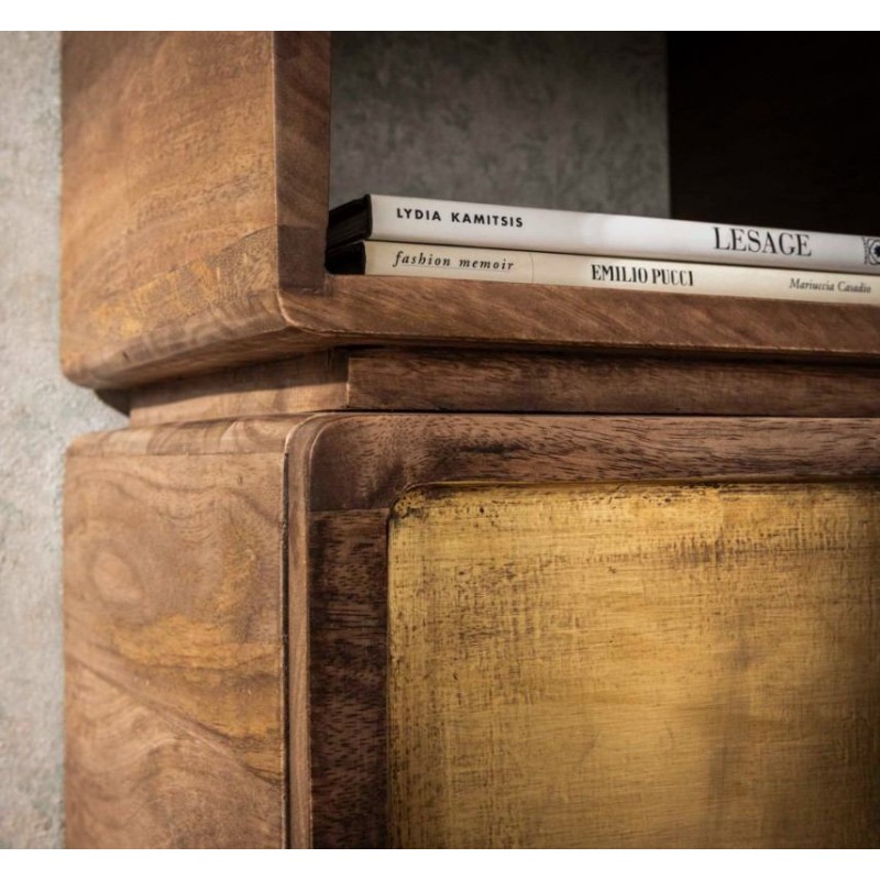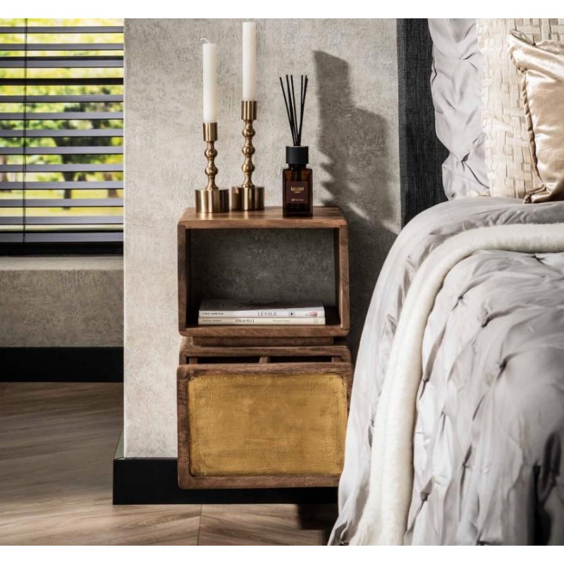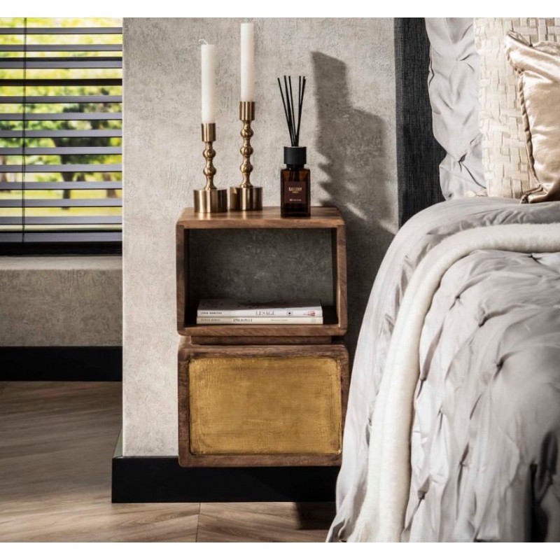 Unikatowa szafka ścienna EFE bez wątpienia łączy w sobie naturalne lite drewno mango z wyjątkową elegancją. Posiada nowoczesny design z pięknym zaokrąglonym wykończeniem, ponadto uwydatniono jej naturalność, dzięki zachowanej oryginalnej strukturze drewna w postaci sęków i słojów. Dodatkowym jej atutem jest nie tylko wygląd, ale również funkcjonalność w postaci otwartej półki oraz pojemnej szuflady, która bez problemu zdoła pomieścić najpotrzebniejsze przedmioty codziennego użytku. Front szuflady, wykończony został w kolorze postarzanego mosiądzu, który subtelnie podkreśla jej niepowtarzalny styl. Szafkę mocuje się z łatwością do ściany za pomocą listwy wraz z 3 śrubami. Została zaprojektowana głównie z myślą o praktyczności i organizacji przestrzeni, a swoją elegancją, stylem oraz wyrazistością doskonale wzbogaci każdą sypialnię urządzoną w stylu nowoczesnym, dodając jej tym samym ciepła oraz naturalnego wykończenia.