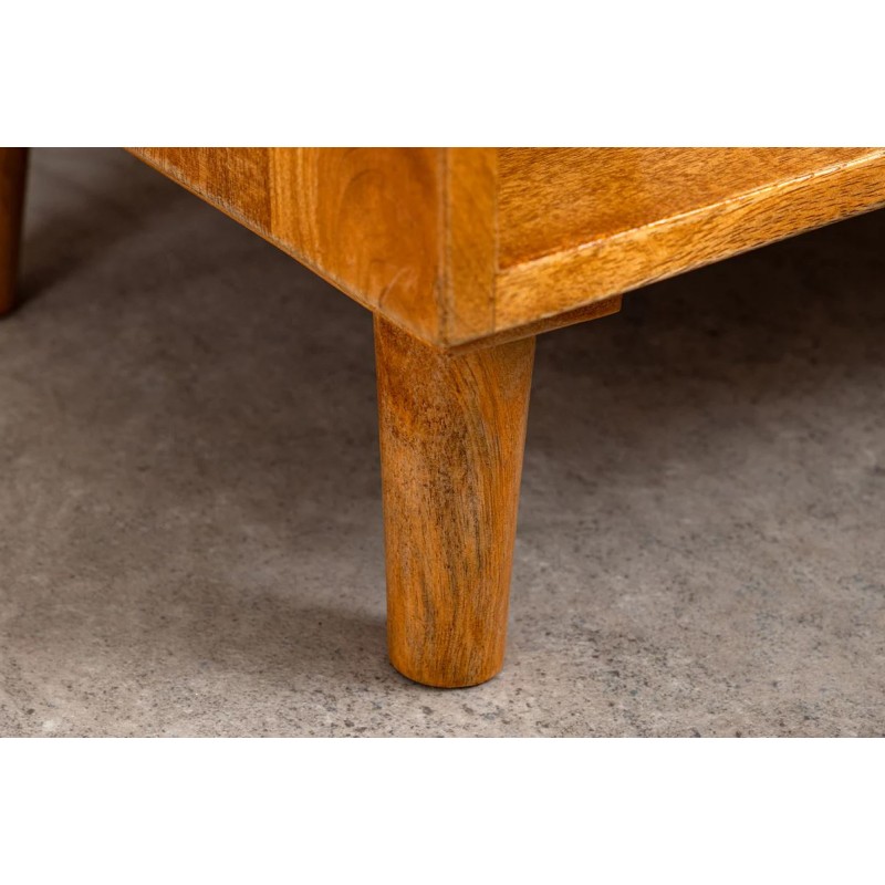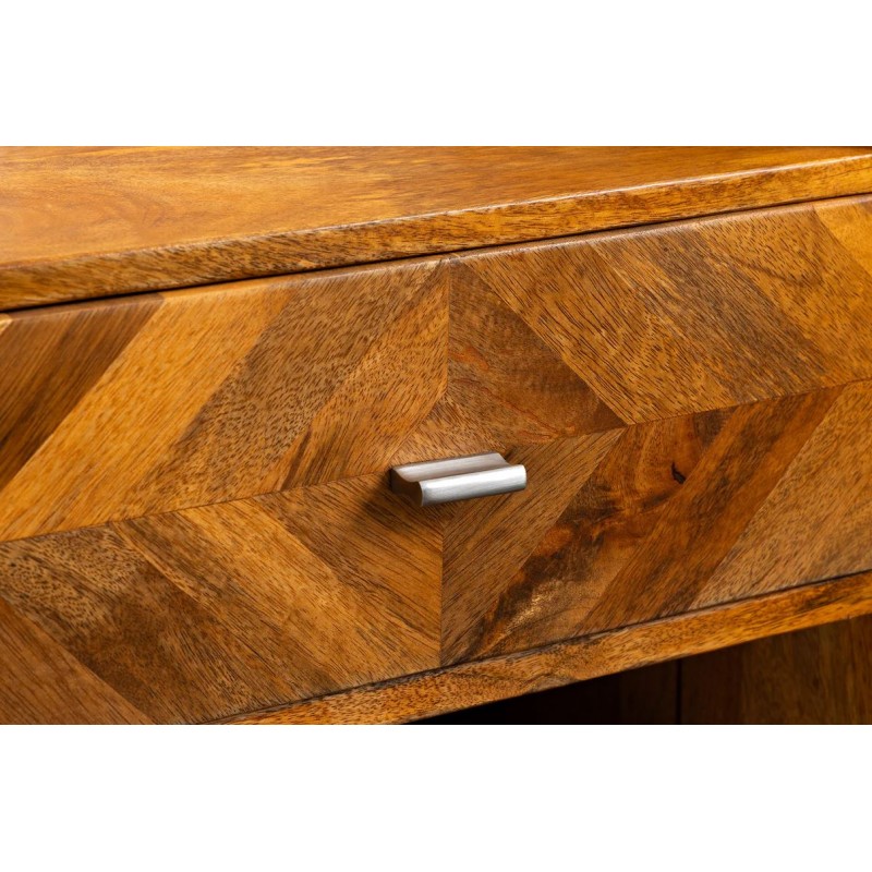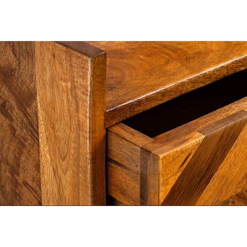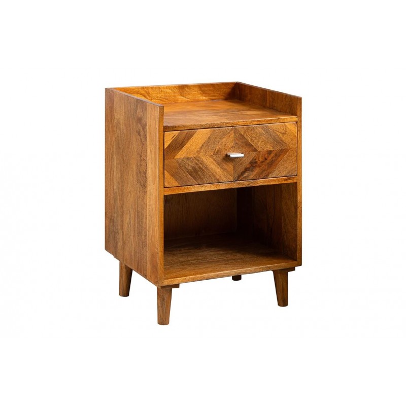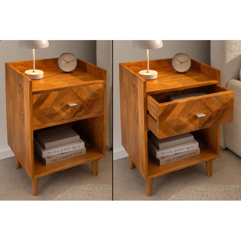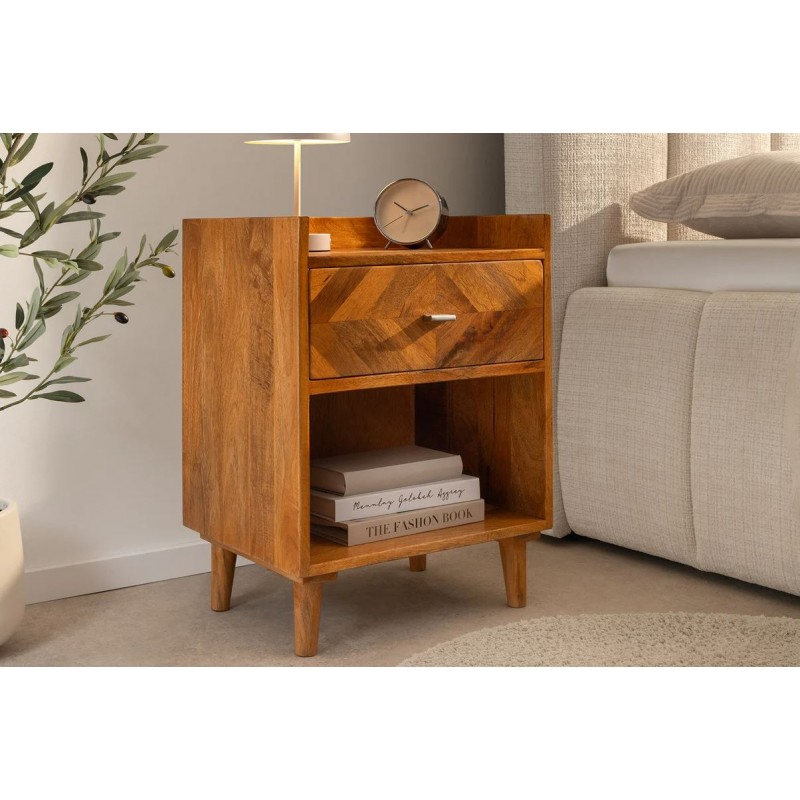 Szafka nocna INFINITY to interesujący mebel, który dzięki swojej formie przykuje uwagę każdego oraz doda pomieszczeniu, w którym się znajduje, ciepła i spokoju. Wykonana została w całości z drewna mango w naturalnym kolorze, a jej nietuzinkowy wygląd podkreślają charakterystyczne zdobienia w formie jodełki, zastosowane na froncie mebla. Zaletą tej szafki jest funkcjonalność, wytrzymałość oraz łatwość czyszczenia, wyróżnia się swoją wyrazistością, kolorem i strukturą powodując, że każdy egzemplarz jest unikatowy. Dzięki swojej smukłej linii całość tego mebla wspaniale komponuje się zarówno konstrukcja jak i podstawa utrzymana w jednolitej tonacji. Ponadto wykonana jest niewątpliwie z dużą precyzją, dzięki zachowaniu i odwzorcowaniu naturalnej oryginalności zarówno słojów jak i sęków. Pomimo niewielkich wymiarów, jest bardzo pojemna, oprócz funkcjonalnej szuflady posiada również otwartą dolną półkę, która zapewnia dodatkowe miejsce do przechowywania i pozwalają na wyeksponowanie drobnych dekoracji lub najpotrzebniejszych przedmiotów codziennego użytku. Została zaprojektowana głównie z myślą o praktyczności i organizacji przestrzeni, a swoją elegancją, stylem oraz wyrazistością doskonale wzbogacą każdą sypialnię urządzoną w stylu nowoczesnym oraz boho dodając jej tym samym naturalnego wykończenia.