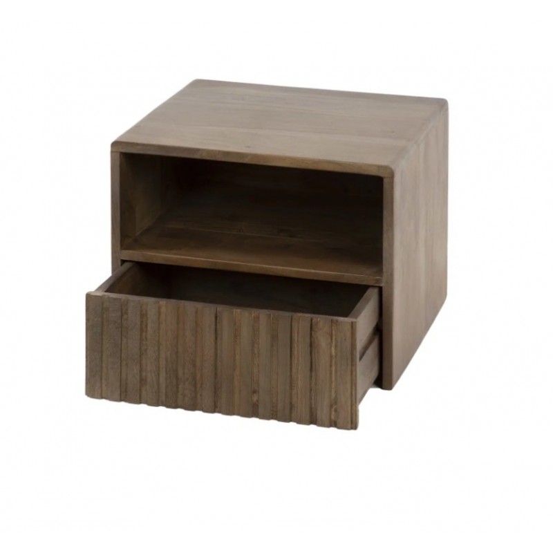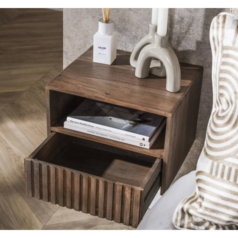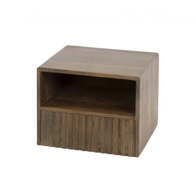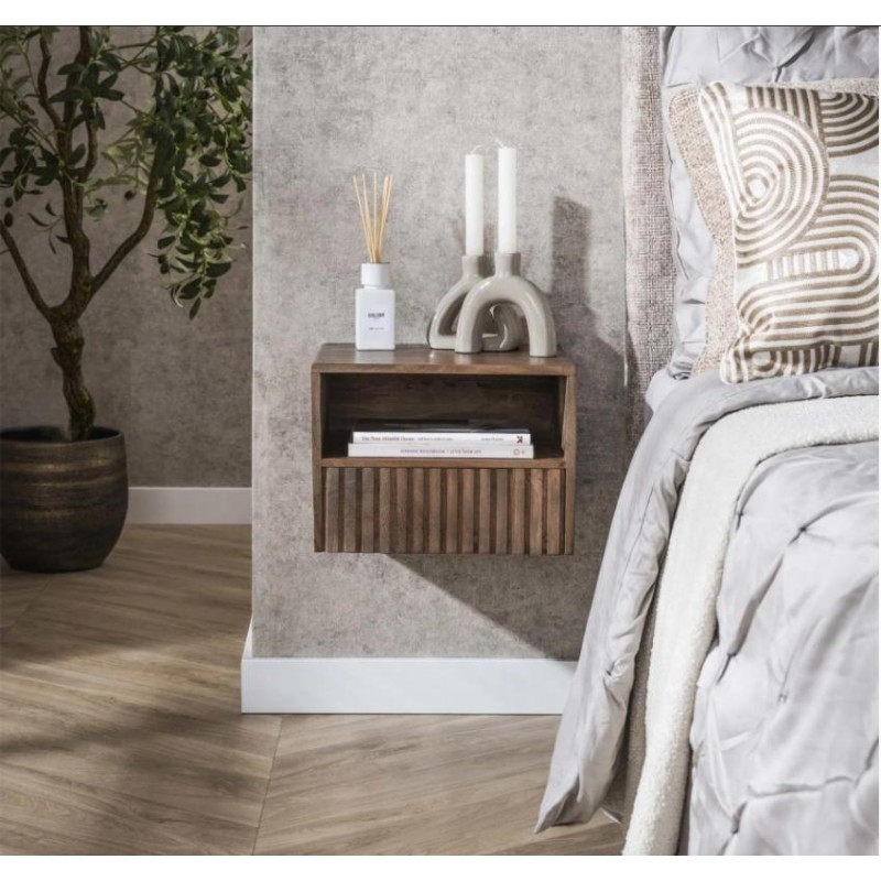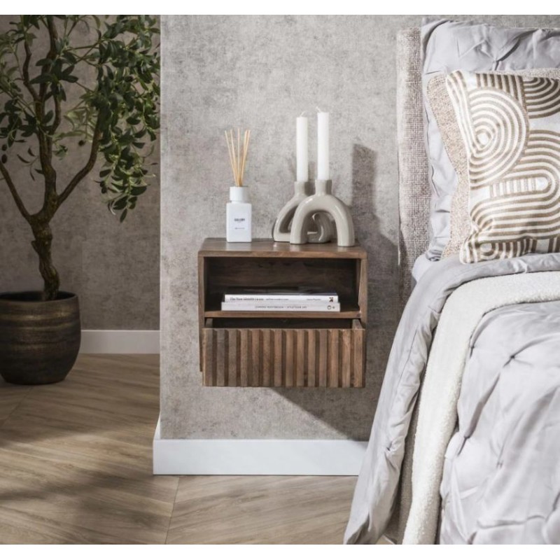 Szafka nocna MAVI to idealne i praktyczne rozwiązane stworzone z myślą zarówno o małych jak i przestrzennych wnętrzach w którym dzięki swojej formie oraz barwie doda wyjątkowego charakteru i stylu. Szafka ta jest wykonana w całości z litego drewna akacjowego pokrytego matowym lakierem w kolorze brązowym, który dzięki zachowaniu oryginalnej struktury drewna w postaci sęków i słojów doskonale uwydatnia jej naturalność. Walory mebla podkreśla zarówno front z dekoracyjnym frezowaniem nawiązującym do pionowych lameli, jak i praktyczna otwarta półka oraz zamknięta pojemna szuflada, zapewniająca miejsce na wszystkie niezbędne przedmioty. Drewnianą podstawę szafki mocuje się z łatwością do ściany za pomocą 2 śrub. Została zaprojektowana głównie z myślą o praktyczności i organizacji przestrzeni, a swoją elegancją, stylem oraz wyrazistością doskonale wzbogacą każdą sypialnię urządzoną w stylu nowoczesnym, dodając jej tym samym ciepła oraz naturalnego wykończenia.