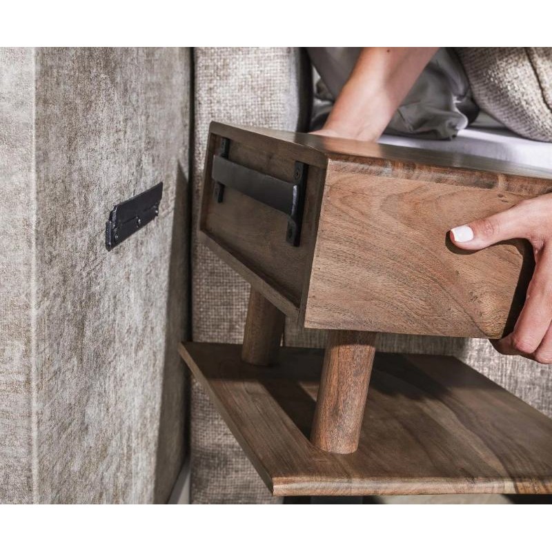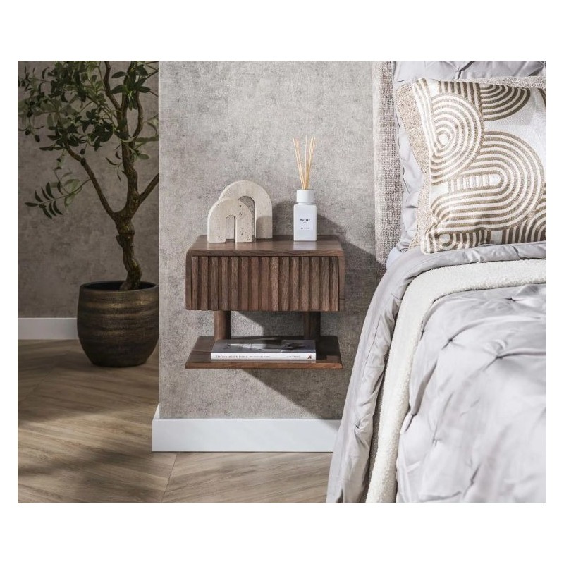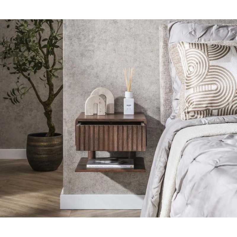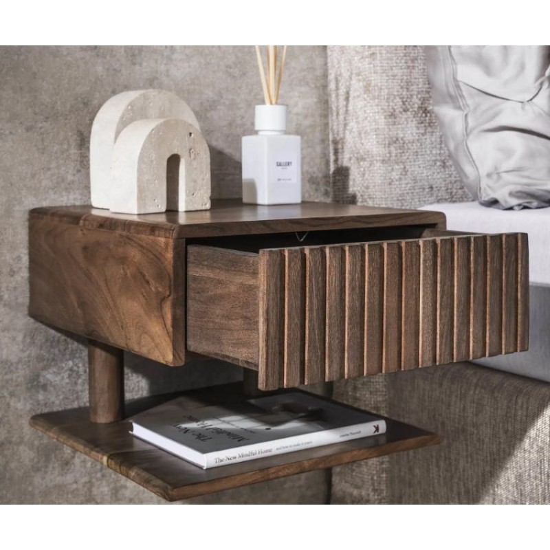Szafka nocna MAVI to idealne i praktyczne rozwiązane stworzone z myślą zarówno o małych jak i przestrzennych wnętrzach w którym dzięki swojej formie oraz barwie doda wyjątkowego charakteru i stylu. Szafka ta jest wykonana w całości z litego drewna akacjowego pokrytego matowym lakierem w kolorze brązowym, który dzięki zachowaniu oryginalnej struktury drewna w postaci sęków i słojów doskonale uwydatnia jej naturalność. Walory mebla podkreśla zarówno front z dekoracyjnym frezowaniem nawiązującym do pionowych lameli, jak i praktyczna otwarta półka oraz zamknięta pojemna szuflada, zapewniająca miejsce na wszystkie niezbędne przedmioty. Drewnianą podstawę szafki mocuje się z łatwością do ściany za pomocą 2 śrub. Została zaprojektowana głównie z myślą o praktyczności i organizacji przestrzeni, a swoją elegancją, stylem oraz wyrazistością doskonale wzbogacą każdą sypialnię urządzoną w stylu nowoczesnym, dodając jej tym samym ciepła oraz naturalnego wykończenia.