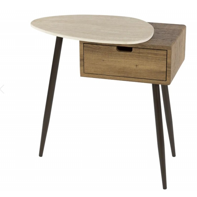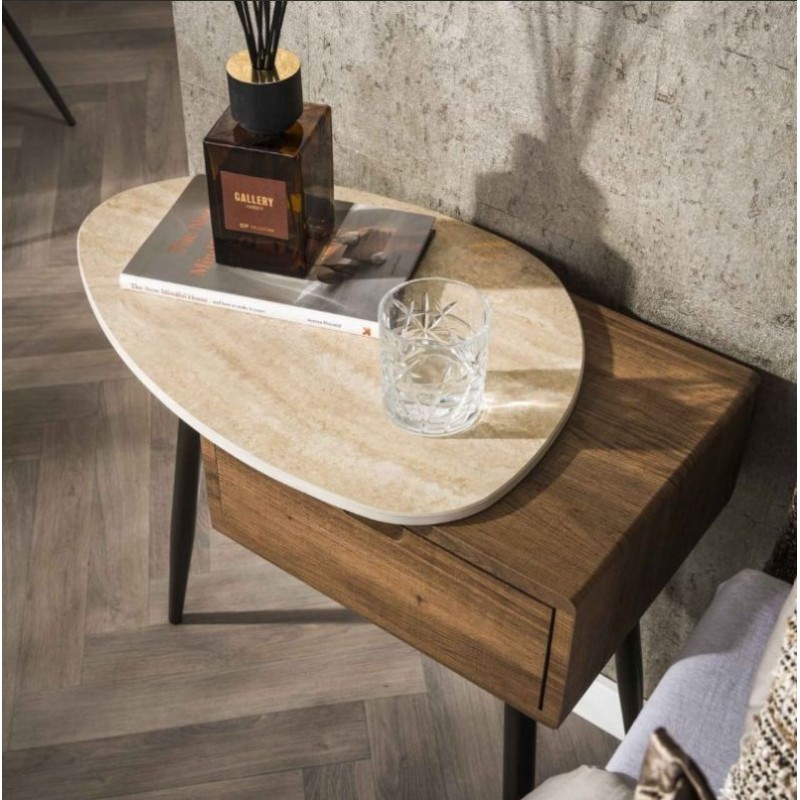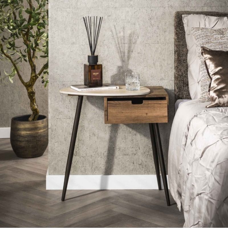 Lewa szafka nocna MORAJ to praktyczne i stylowe rozwiązanie, które doskonale sprawdzi się zarówno w małych, jak i przestronnych sypialniach. Stabilna, smukła metalowa podstawa w kolorze brązu nadaje jej niebywałej lekkości. Korpus mebla wykonano z płyty MDF z drewnianym dekorem imitującym naturalny dąb, który dzięki zachowaniu oryginalnej struktury drewna w postaci sęków i słojów doskonale uwydatnia jej naturalność. Szafka wyróżnia się głównie asymetrycznym, beżowym blatem ceramicznym o trawertynowej fakturze, nadającej jej elegancji i wyrazistości. W połowie mebla znajduje się praktyczna, funkcjonalna i pojemna szuflada, która bez problemu pomieści najpotrzebniejsze przedmioty codziennego użytku. Została zaprojektowana przede wszystkim z myślą o praktyczności i organizacji przestrzeni, a swoją elegancją, stylem oraz wyrazistością doskonale wzbogaci każdą sypialnię urządzoną w stylu nowoczesnym, dodając jej ciepła oraz naturalnego wykończenia.