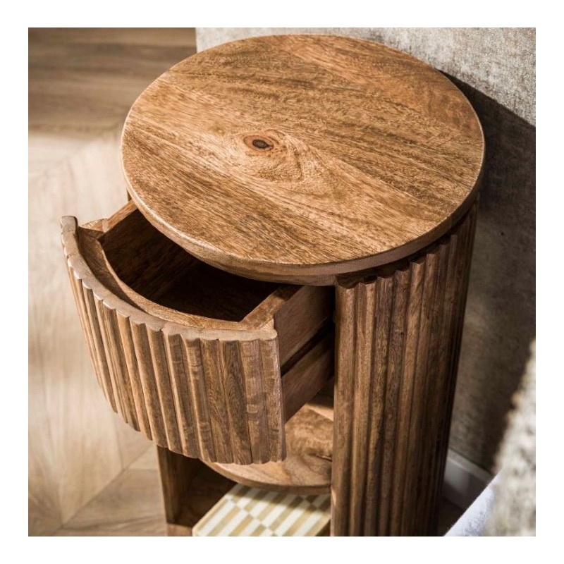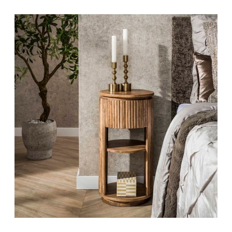 Szafka nocna OSMAN to interesujący mebel, który dzięki swojej formie przykuje uwagę każdego oraz doda pomieszczeniu, w którym się znajduje, ciepła i spokoju. Wykonana została w całości z drewna mango w kolorze piaskowym, a jej nietuzinkowy wygląd podkreślają charakterystyczne frezowania w formie pionowych lameli, zastosowane na froncie mebla. Zaletą tej szafki jest funkcjonalność, duża wytrzymałość oraz łatwość czyszczenia. Podkreśla się swoją wyrazistością, kolorem oraz strukturą, dzięki czemu każdy egzemplarz jest unikatowy. Szafka OSMAN ma oryginalny, okrągły kształt, który nadaje jej nowoczesnego charakteru. Pomimo niewielkich wymiarów, jest bardzo pojemna, oprócz funkcjonalnej szuflady posiada również dwie otwarte półki, które zapewniają dodatkowe miejsce do przechowywania i pozwalają na wyeksponowanie drobnych dekoracji lub najpotrzebniejszych przedmiotów codziennego użytku. Jej nowoczesny kształt oraz zachowanie oryginalności słojów, sęków i naturalności drzewa sprawia, że wygląda zjawiskowo, nadając twemu wnętrzu sypialni oryginalnego charakteru elegancji i nowoczesności.