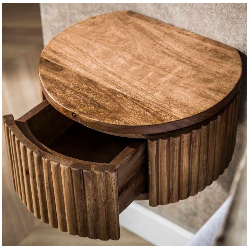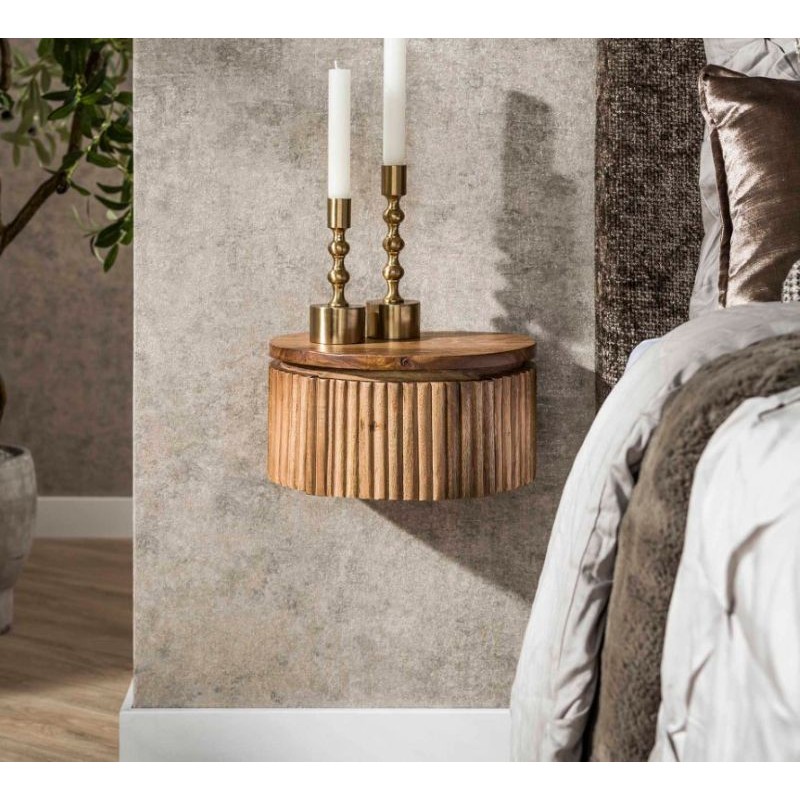 Ta niezwykle praktyczna szafka nocna zaprojektowana została w minimalistycznym stylu nowoczesnym. Wykonana została w całości z drewna mango w kolorze piaskowym, a jej nietuzinkowy wygląd nadają charakterystyczne frezowania w formie pionowych lameli, które zostały zastosowane na froncie mebla. Zaletą tej szafki jest funkcjonalność, duża wytrzymałość oraz łatwość czyszczenia, ponadto podkreśla się swoją wyrazistością, kolorem oraz strukturą co powoduje, że każdy egzemplarz jest unikatowy. Jej niewielkie wymiary sprawiają, że z łatwością dostosujesz ją do swoich potrzeb wieszając na dowolnej wysokości obok łóżka. Pojemna szafka zapewni odpowiednie miejsce przechowywania i bez problemu pomieści najpotrzebniejsze przedmioty codziennego użytku. Jej nowoczesny kształt oraz zachowanie oryginalności słojów, sęków i naturalności drzewa sprawia, że wygląda zjawiskowo, nadając twemu wnętrzu sypialni oryginalnego charakteru elegancji i nowoczesności.