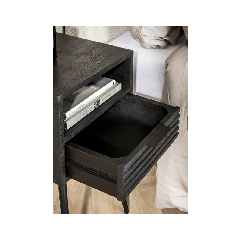 Szafka nocna PELO to idealne rozwiązanie dla miłośników prostoty i ciemnej kolorystyki, gdyż mebel ten dzięki swojej palecie barw oraz funkcjonalności sprawdzi się znakomicie w każdej sypialni w ciemnych kolorach. Szafka została wykonana z drzewa mango w kolorze czerni, co podkreśla uniwersalność tego mebla i jego charakter. Głównym atutem szafki jest jej pojemna, wysuwana szuflada oraz komora nad nią, które sprawdzą się idealnie do przechowywania drobnych przedmiotów czy rzeczy osobistych blisko łóżka. Szafka nocna PELO to idealne rozwiązanie do każdej sypialni w stylu nowoczesnym czy industrialnym, gdzie doda pomieszczeniu szyku i elegancji oraz zachwyci swoją funkcjonalnością.