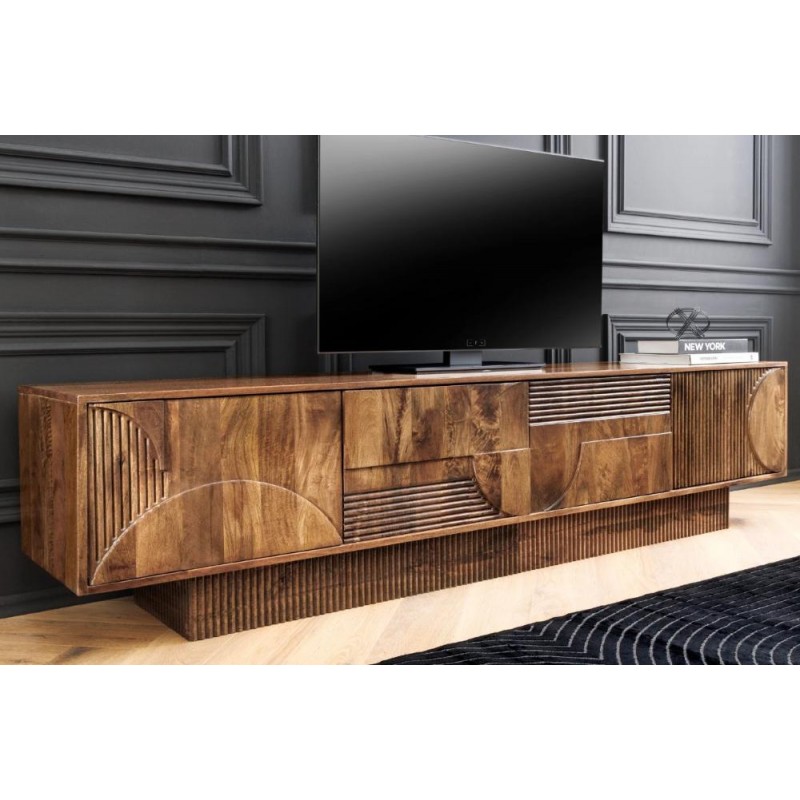 SZAFKA RTV ART DECO II 200X38 CM MANGO SZARE Szafka RTV ART DECO to idealne rozwiązanie do każdego wnętrza w stylu nowoczesnym, gdzie mebel ten dzięki swojej niesamowitej strukturze doda przestrzeni charakteru i oryginalnego wykończenia. Mebel ten wykonany został z litego drewna mango, którego szary front zdobi dekoracja optyczno-geometryczna 3D z...