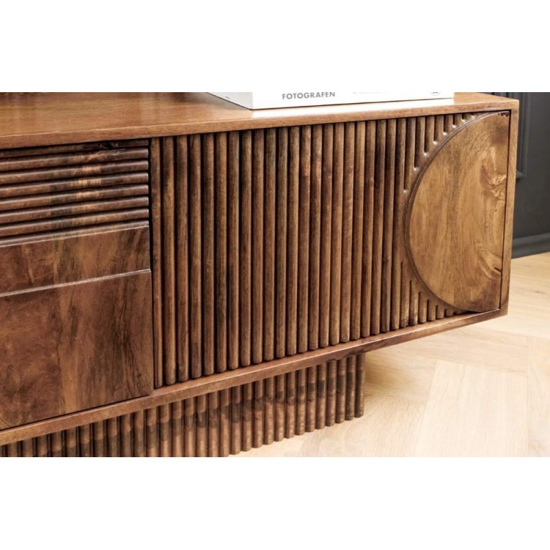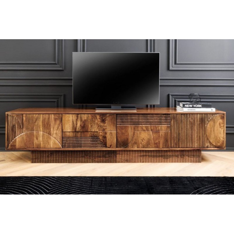 Szafka RTV ART DECO to idealne rozwiązanie do każdego wnętrza w stylu nowoczesnym, gdzie mebel ten dzięki swojej niesamowitej strukturze doda przestrzeni charakteru i oryginalnego wykończenia. Mebel ten wykonany został z litego drewna mango, którego brązowy front zdobi dekoracja optyczno-geometryczna 3D z wstawkami w formie pionowych oraz poziomych lameli. Jej stabilną i solidną podstawę stanowi prążkowo lamelowa konstrukcja z drewna mango. Głównym atutem szafki są robiące ogromne wrażenie zdobienia na drzwiach frontowych mebla, które nadają mu elegancji przykuwając uwagę każdego. Wyposażona jest w trzy podwójne pojemne półki w kolorze brązowego drewna, które bez problemu zdołają pomieścić rzeczy codziennego użytku, książki czy urządzenia elektryczne, oferując tym samym dużą powierzchnię do przechowywania. Zaletą szafki jest funkcjonalność, wytrzymałość oraz łatwość czyszczenia, wyróżnia się swoją wyrazistością, kolorem i strukturą powodując, że każdy egzemplarz jest unikatowy. Dzięki swojej smukłej linii całość tego mebla wspaniale komponuje się zarówno konstrukcja jak i podstawa utrzymana w jednolitej tonacji. Ponadto wykonana jest niewątpliwie z dużą precyzją, dzięki zachowaniu i odwzorcowaniu naturalnej oryginalności zarówno słojów jak i sęków. Szafka RTV ART DECO sprawdzi się znakomicie w każdym salonie, gdzie dzięki swojej formie doda wnętrzu charakteru, ale także stanie się ona funkcjonalnym meblem idealnym do przechowywania drobnych przedmiotów czy rzeczy osobistych.