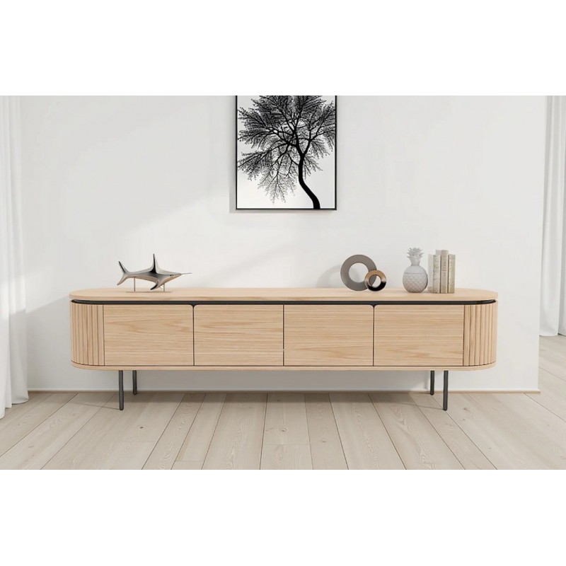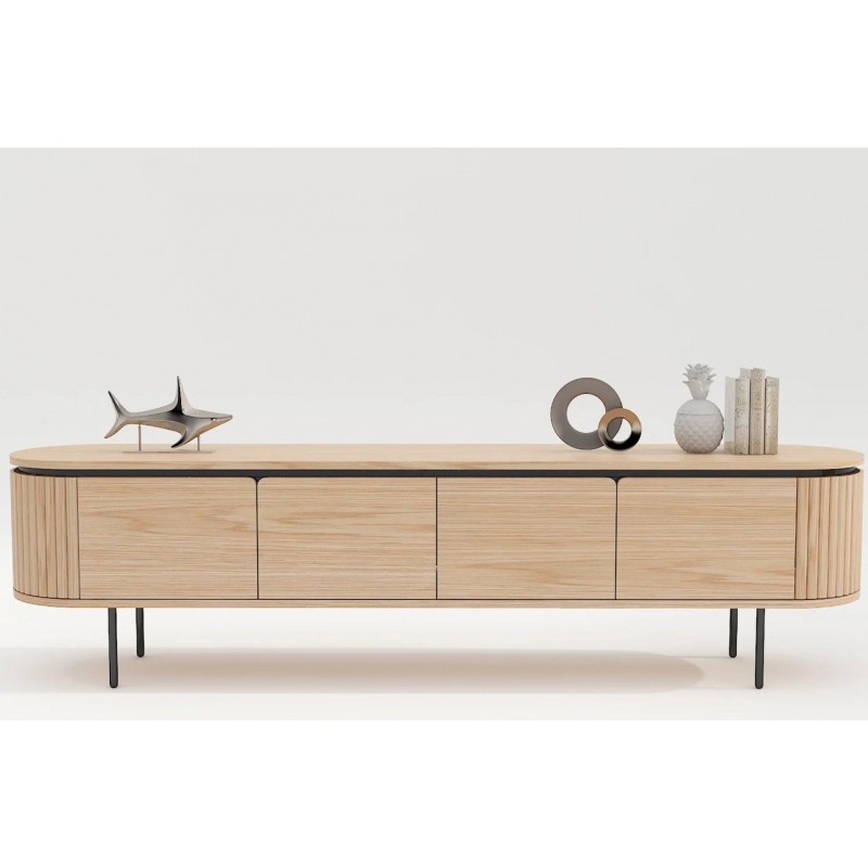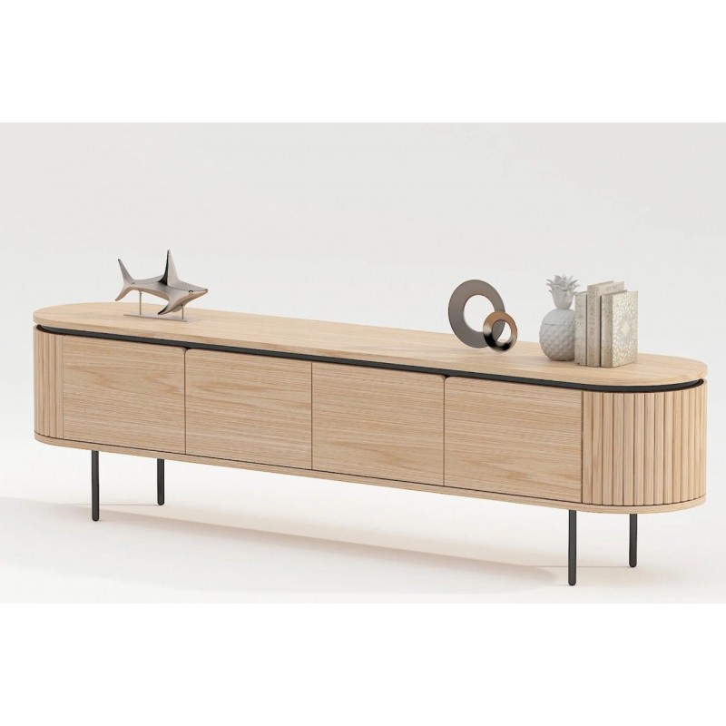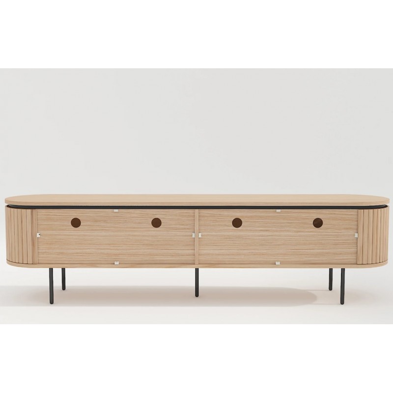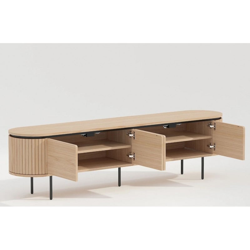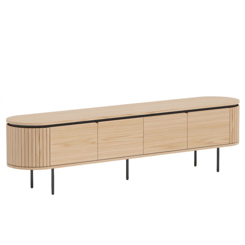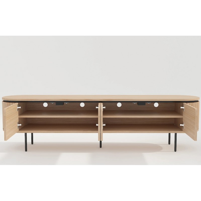 Ta owalna elegancka szafka RTV idealnie wpisze się nie tylko w klasyczne, ale także minimalistyczne nowoczesne wnętrze. Mebel ten wykonany został z płyty MDF oklejonej imitacją dębu, który został osadzony na stabilnej czarnej metalowej podstawie. Dzięki swojej smukłej linii całość tej szafki wspaniale komponuje się z podstawą utrzymaną w ciemnej tonacji. Posiada dwie podwójne pojemne półki z zamykanymi drzwiczkami, które bez wątpienia pomieszczą rzeczy codziennego użytku np: książki, dokumenty oraz urządzenia elektroniczne oferując tym samym dużą powierzchnię do ich przechowywania. Zaletą tej szafki RTV jest funkcjonalność, wytrzymałość oraz łatwość czyszczenia, wyróżnia się swoją wyrazistością, kolorem i strukturą powodując, że każdy egzemplarz jest unikatowy. Fronty lamelowe w imitacji dębu ze strukturą drewna nadają jej cennego i naturalnego wyrazu. Ponadto wykonana jest niewątpliwie z dużą precyzją, dzięki zachowaniu i odwzorcowaniu naturalnej oryginalności zarówno słojów jak i sęków. Połączenie wyglądu metalu oraz dębu nadaje mu industrialny charakter, który również wspaniale wzbogaci każdy nowoczesny salon.