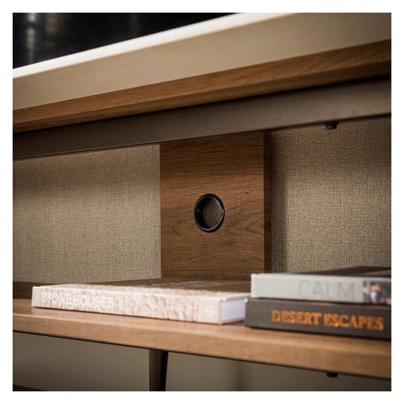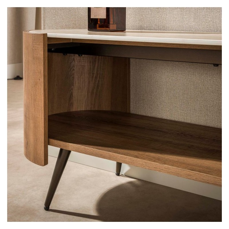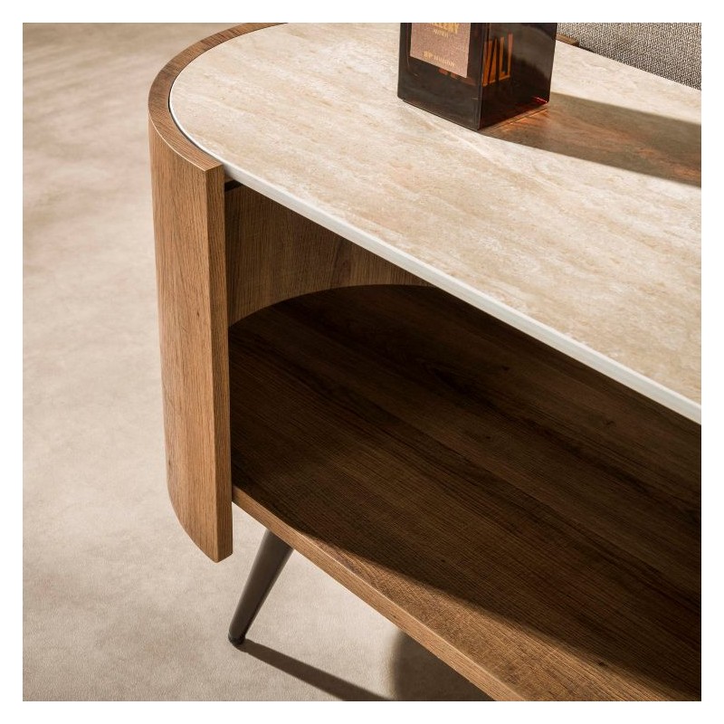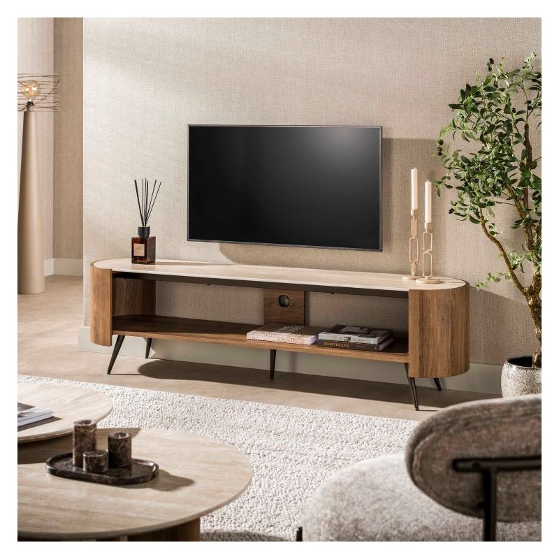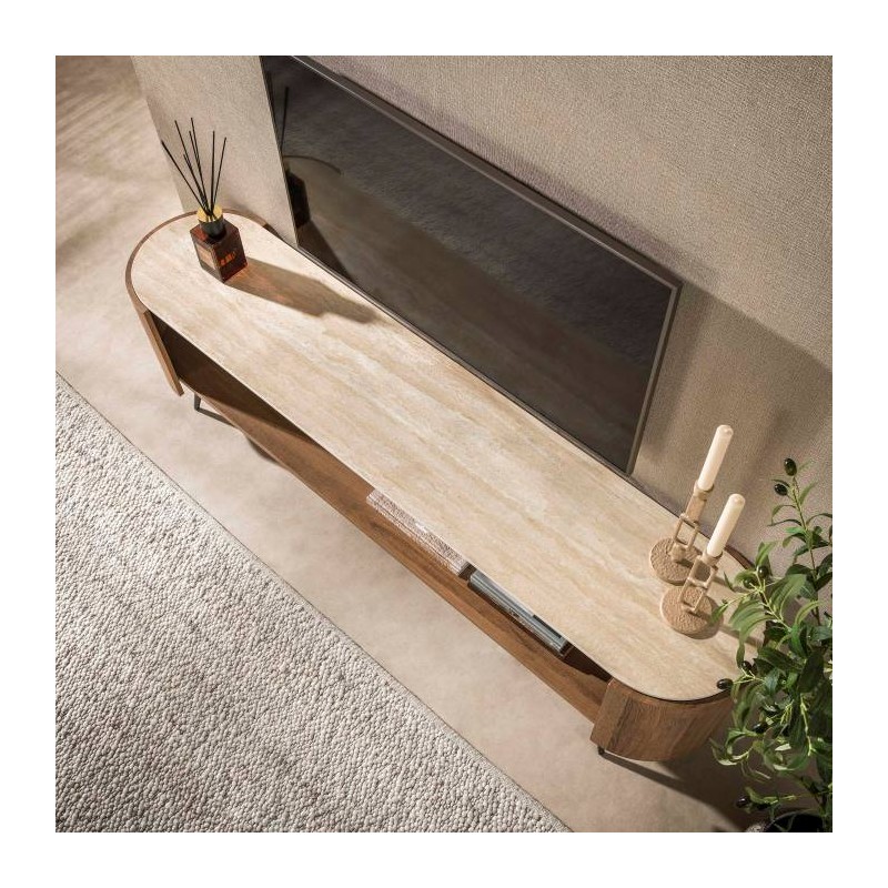 Ta wyjątkowa szafka RTV to idealna propozycja dla miłośników nowoczesnego designu oraz niebanalnych form. Zaokrąglony kształt nadaje jej lekkości i subtelnej elegancji, dzięki czemu doskonale wpisuje się w współczesne aranżacje wnętrz. Korpus szafki wykonano z płyty MDF pokrytej dekorem drewnianym odzwierciedlającym wygląd dębu wraz z zachowaną oryginalną strukturą w postaci sęków i słojów uwydatniającą jej naturalność. Blat został wykonany z ceramiki w kolorze beżowym, którego struktura podkreśla wyjątkowy charakter mebla. Wyróżniają się między innymi swoją wyrazistością poprzez zastosowanie w niej dekoracji w formie kamienia naturalnego o wyglądzie trawertynu, wraz z elegancką charakterystyczną kolorystyką oraz dopełniającymi odcieniami w jaśniejszych kolorach beżu. Mebel osadzono na smukłych metalowych nogach w brązowym odcieniu, które dodają jej lekkości i nowoczesnego wyrazu. Funkcjonalna szafka została wyposażona w otwartą półkę, która bez problemu pomieści rzeczy codziennego użytku np: książki, dokumenty oraz urządzenia elektroniczne oferując tym samym dużą powierzchnię do przechowywania. Jej wyjątkowa struktura i wykończenie sprawiają, że każdy egzemplarz podkreśla jej unikatowy i niepowtarzalny charakter. Szafka to bez wątpienia designerski dodatek, wyróżniający się unikatową strukturą, czyniąc ją niepowtarzalnym elementem wyposażenia.