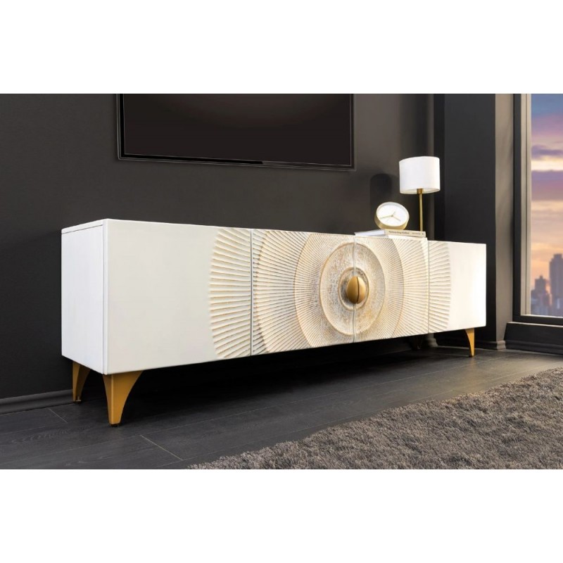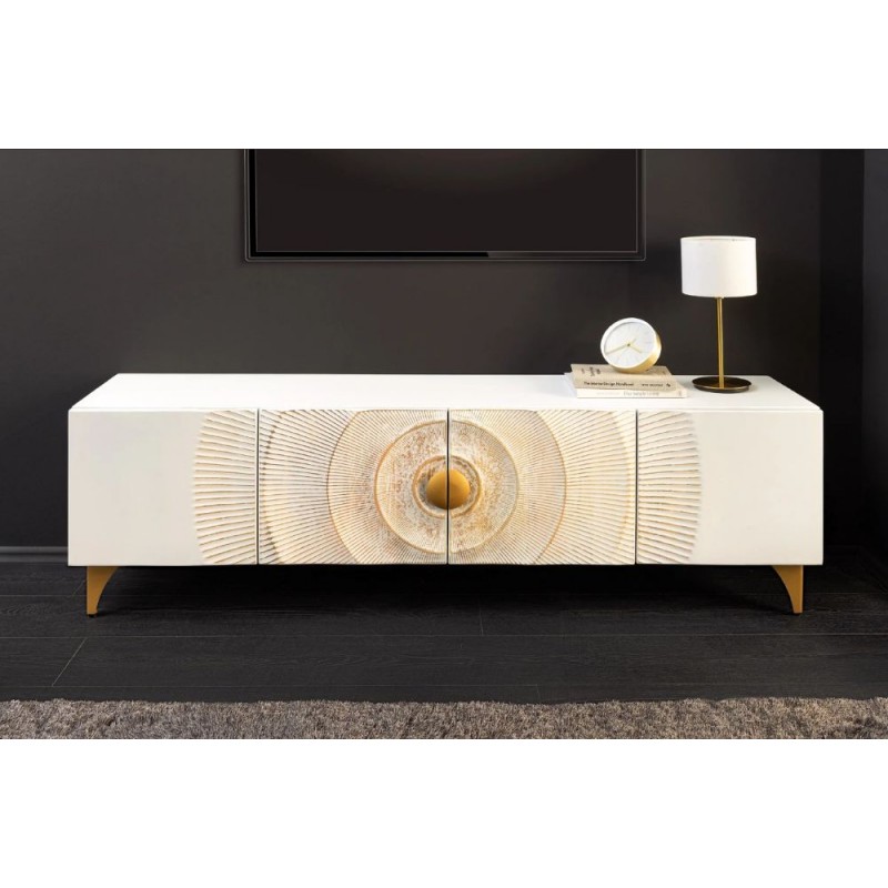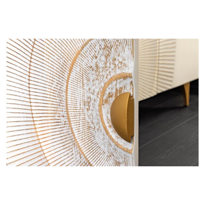 Szafka RTV GOLDEN SUNSET została wykonana w całości z litego drewna mango o barwie białej, której stabilną podstawę stanowią cztery złote nogi. Zaprojektowana jest niewątpliwie z dużą precyzją, dzięki zachowaniu naturalnej oryginalności drzewa zarówno słojów jak i sęków świetnie odzwierciedla styl nowoczesny. Bez wątpienia elementem robiącym największe wrażenie są frontowe drzwiczki ręcznie robione z unikatowym geometrycznym poprzecieranym złotym zdobieniem, dzięki któremu całość prezentuje się fenomenalnie i nadaje meblowi oryginalnego charakteru. Mebel ten jest bardzo pojemny, posiada trzy duże półki, które pomieszczą rzeczy codziennego użytku np: książki, dokumenty oraz urządzenia elektroniczne oferując tym samym dużą powierzchnię do przechowywania. Dodatkową zaletą tej szafki jest funkcjonalność, wytrzymałość oraz łatwość czyszczenia, ponadto wyróżnia się swoją wyrazistością, kolorem i strukturą powodując, że każdy egzemplarz jest unikatowy. Szafka RTV GOLDEN SUNSET sprawdzi się znakomicie w każdym nowoczesnym salonie, gdzie stanie się nie tylko funkcjonalnym meblem, ale także przepiękną dekoracją.